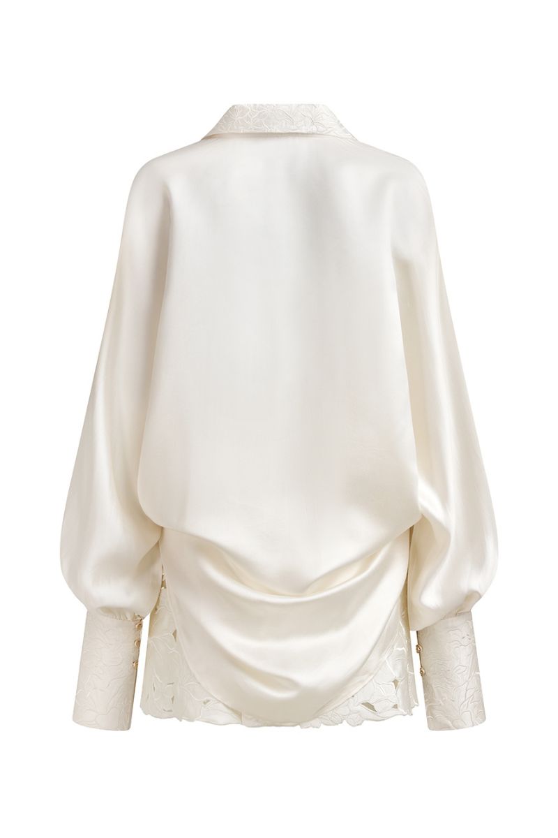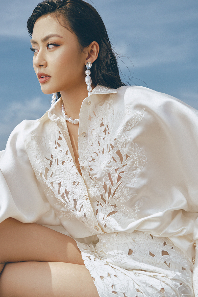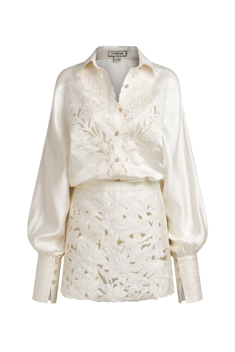 The Aline Outfit Set in White features a shirt and mini-skirt combination. Crafted from traditional Vietnamese Ma Chau silk, the shirt showcases embroidered patterns with laser-cut detailing. This ensemble exudes a youthful and dynamic vibe.