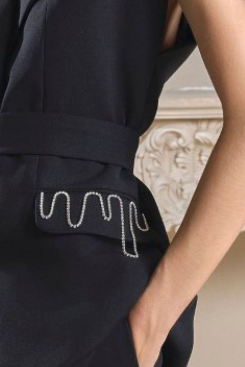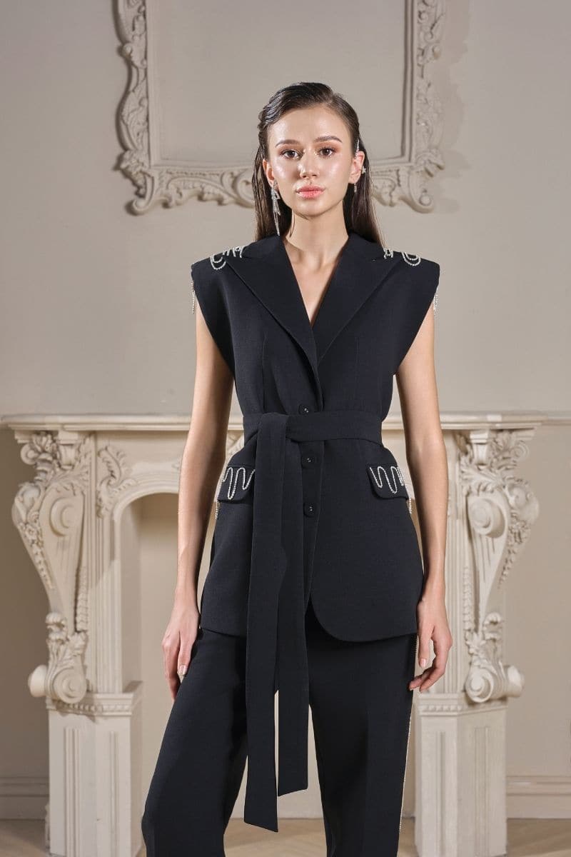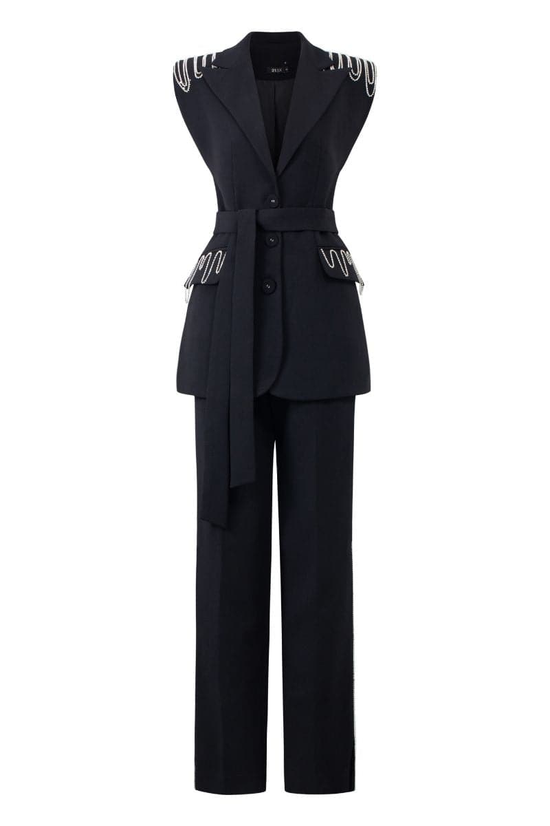 A sleeveless vest with a textured finish and stone strap detailing is accompanied by classic straight-leg pants, featuring the same stone strap detailing. This stylish set combines sophisticated tailoring with eye-catching details, including stone strap detailing, for a timelessly chic ensemble.