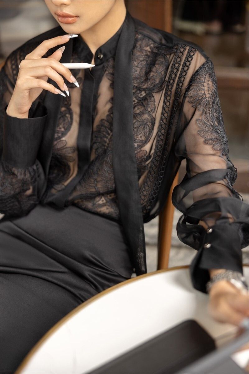 - Mandarin collar shirt, has 2 long decorative flaps from the neck, front body, and lace sleeves