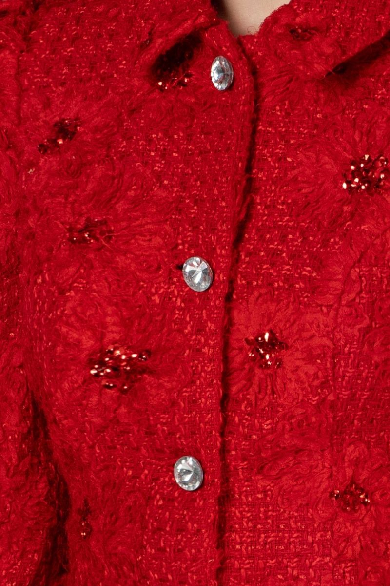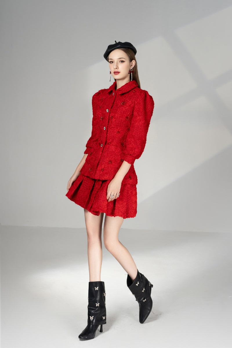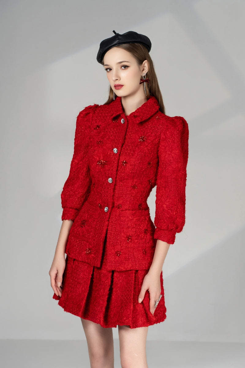 Elevate your wardrobe with this luxurious two-piece set featuring a top and skirt. Adorned with beaded buttons and 3D flowers, this set exudes sophistication. The box pleated skirt and A-line silhouette add a touch of elegance, while the button closure, patch pockets, collared neck style, and cuffed puff sleeves complete the look.