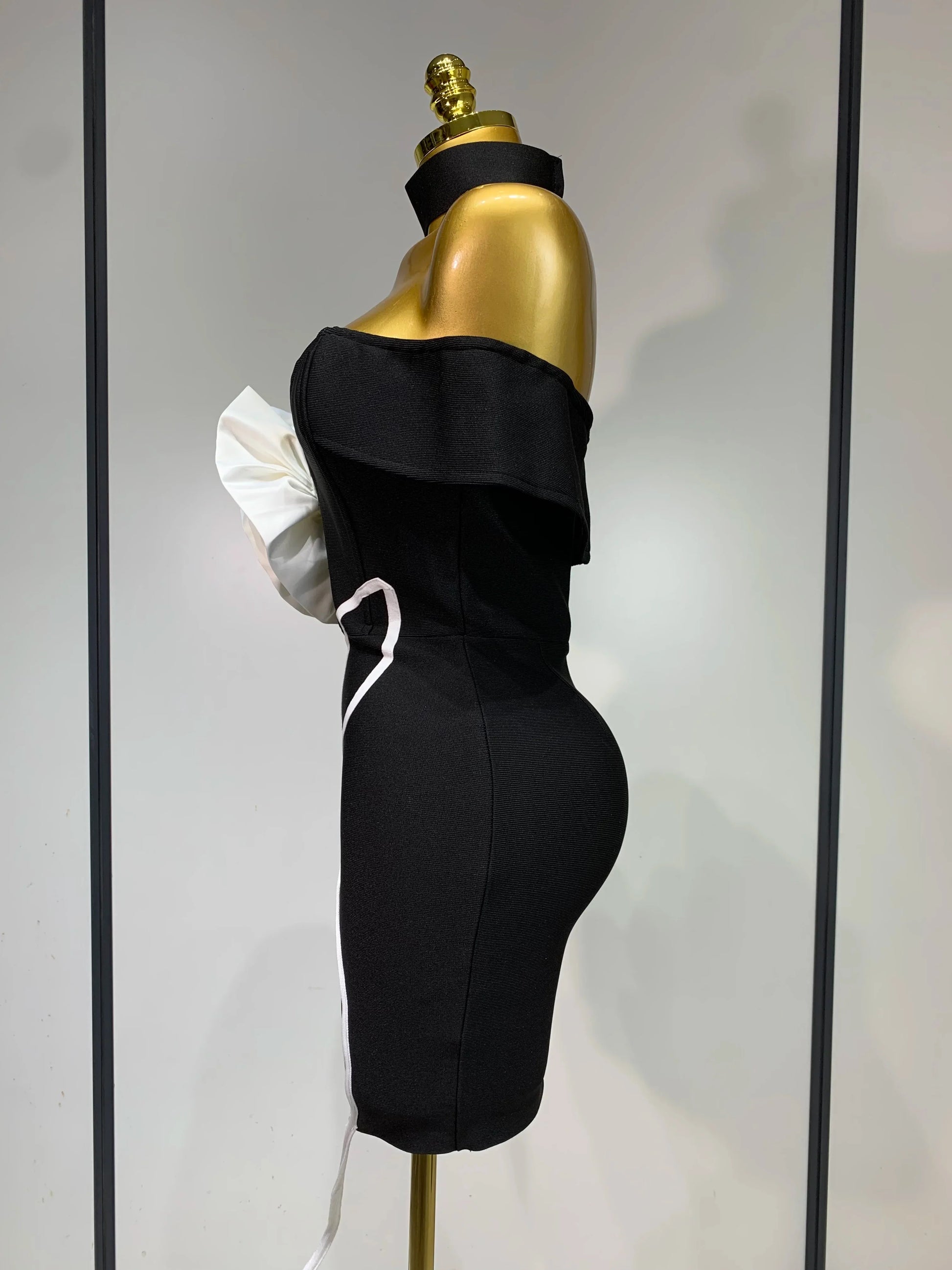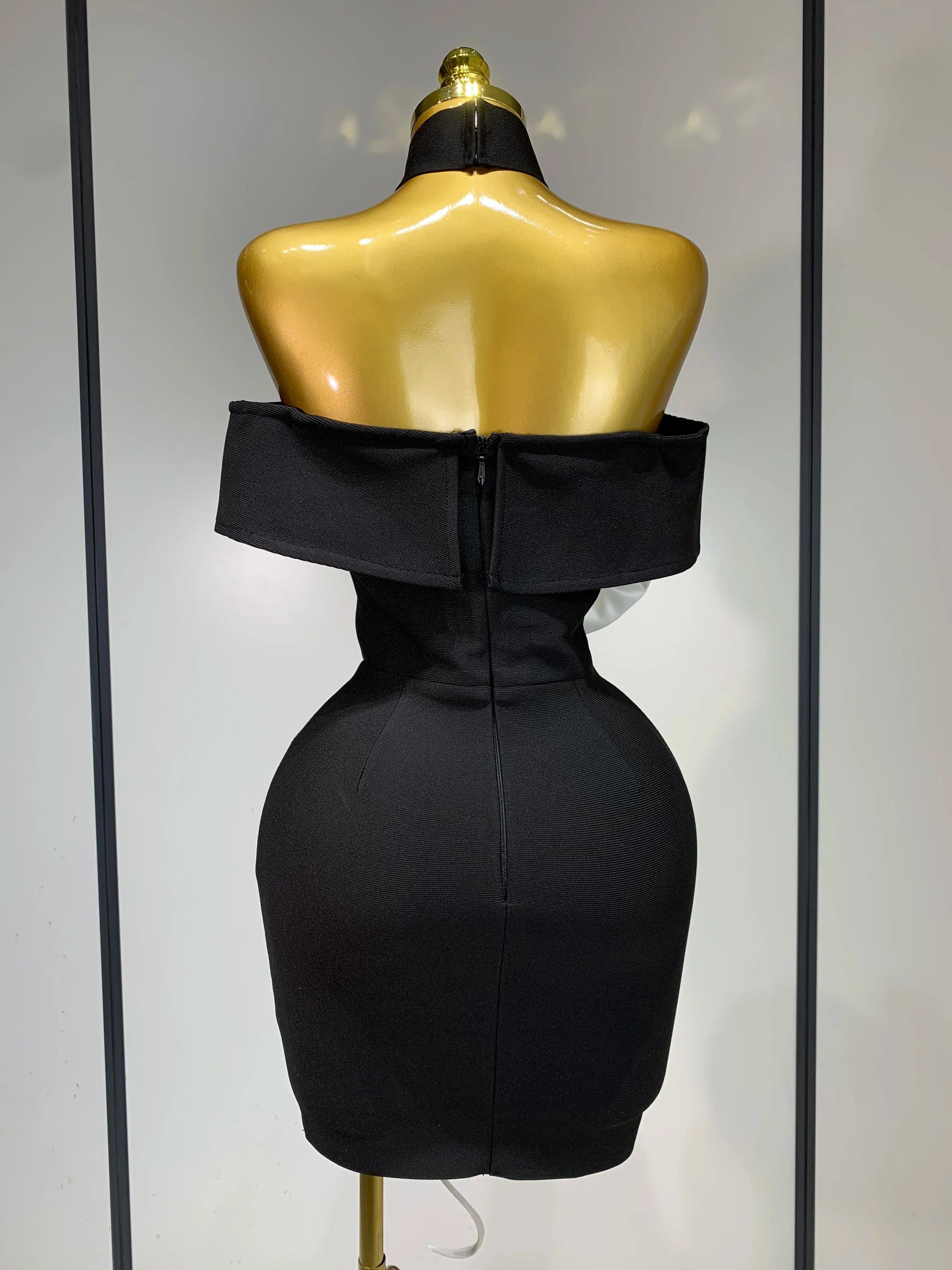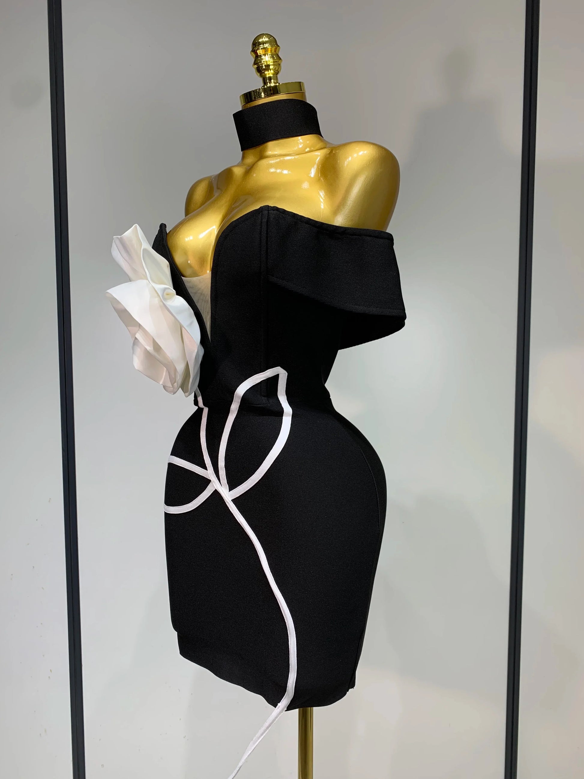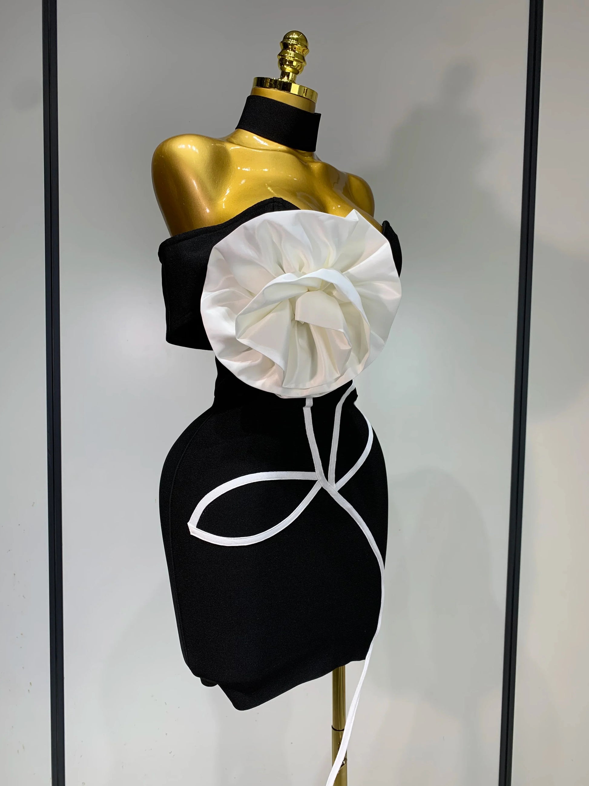 This sleek black bodycon mini dress is designed to turn heads. Featuring a corset-style bodice and oversized 3D flower detail, it perfectly balances elegance and edge. Perfect for a night out, this dress exudes confidence and luxury.