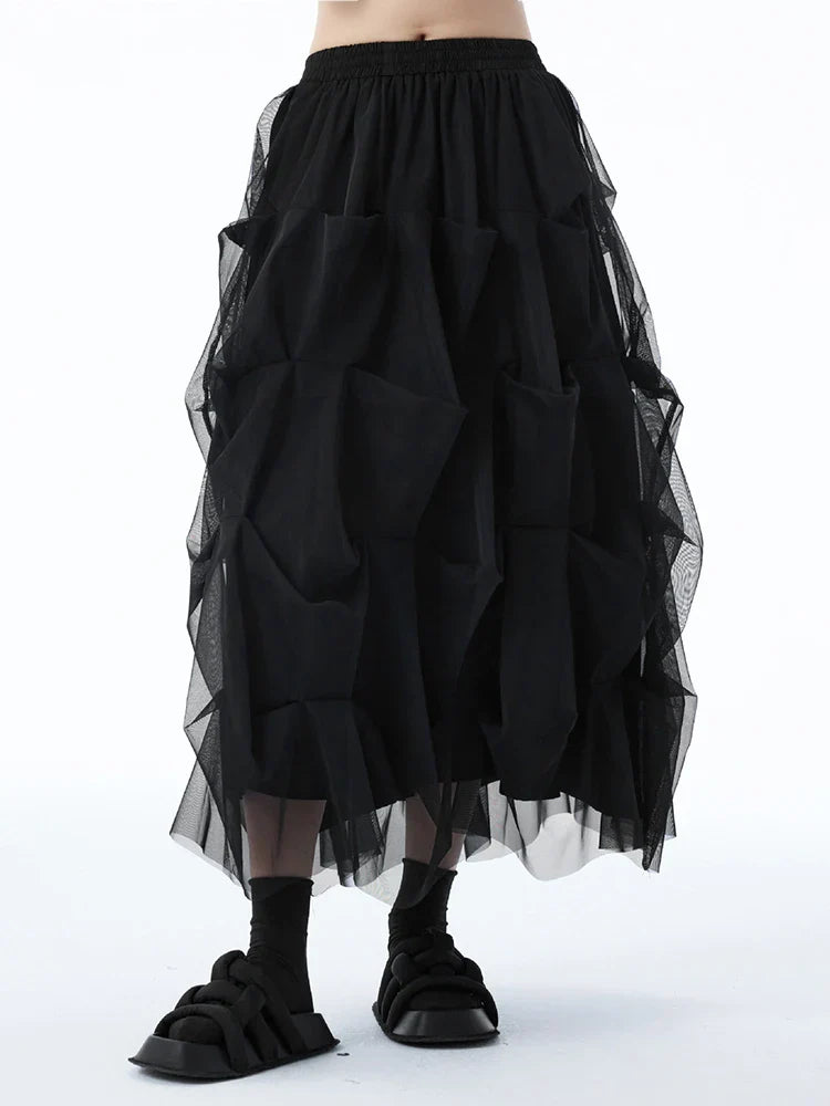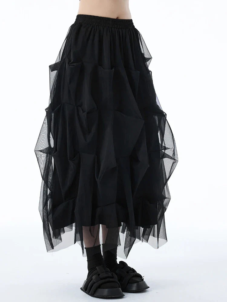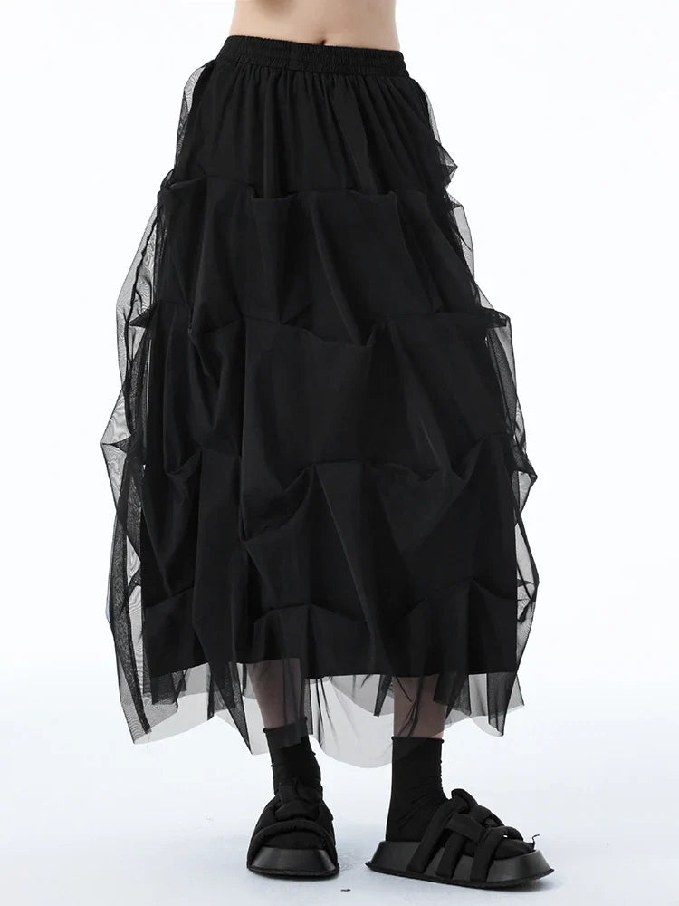 This avant-garde skirt features layered black tulle with a stretchy elastic waistband for comfort and style.