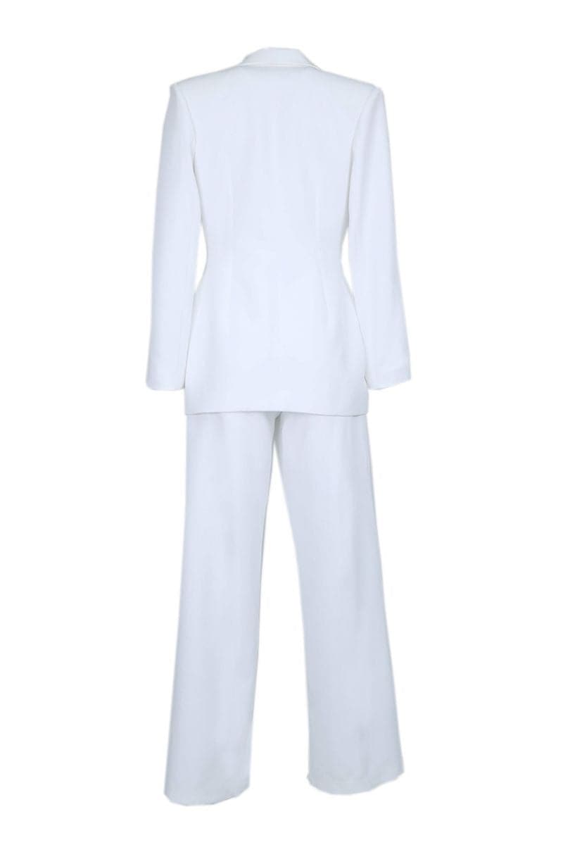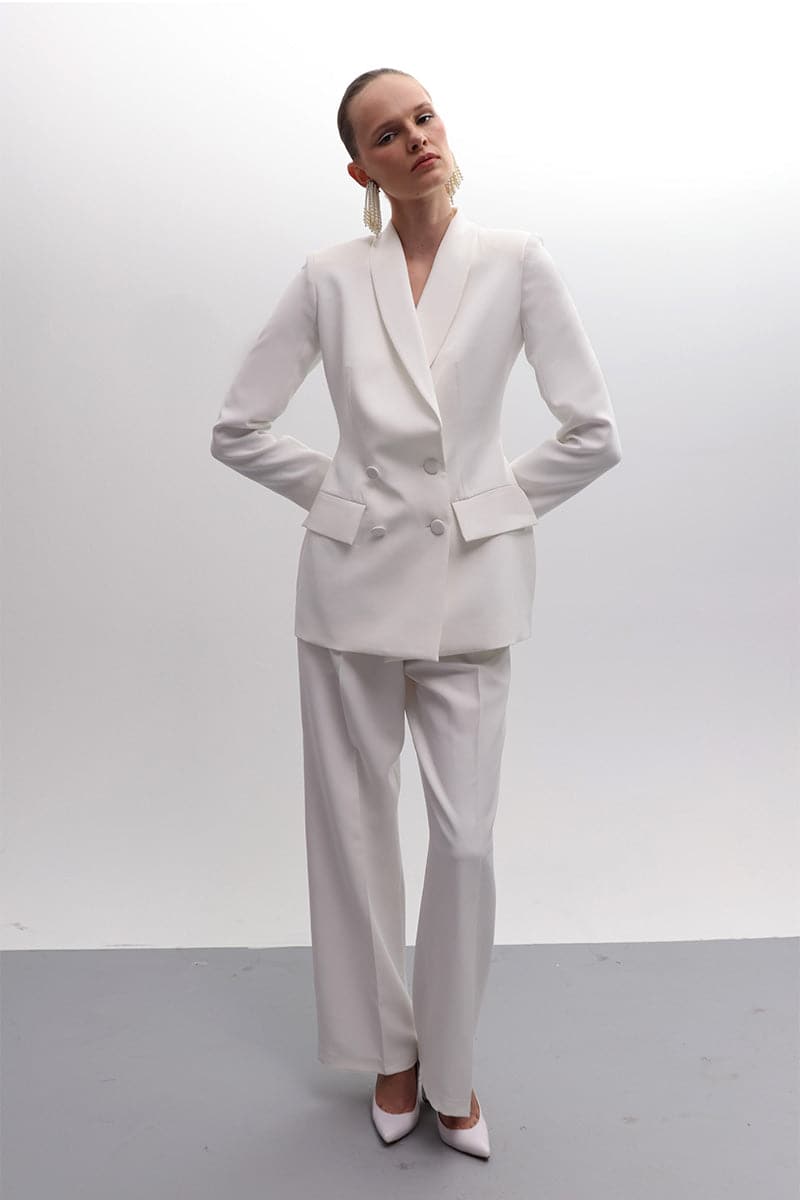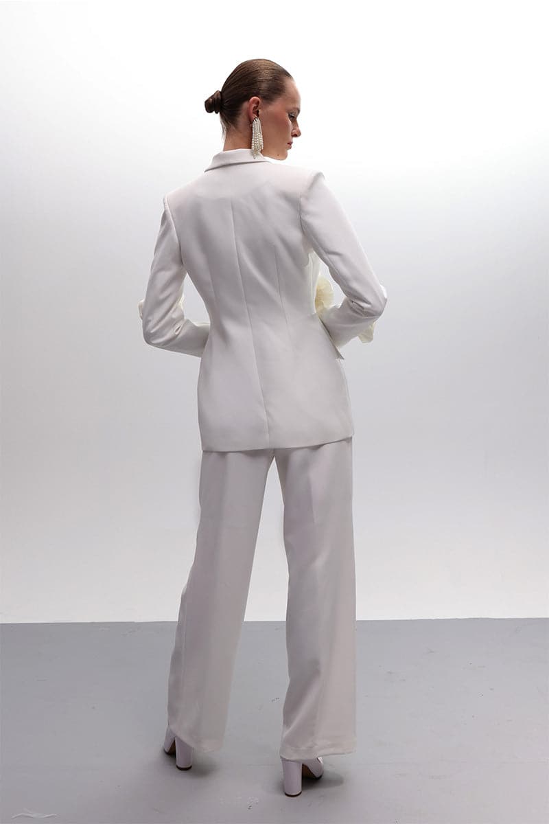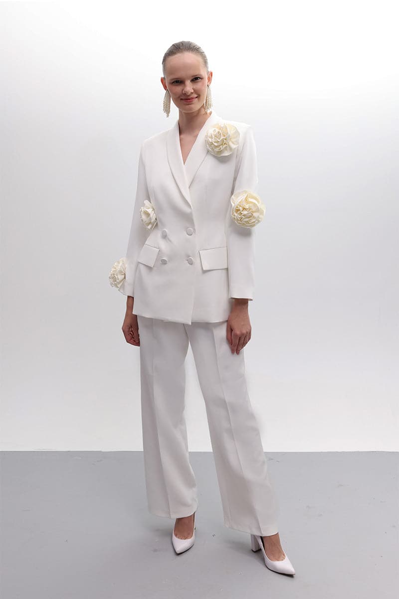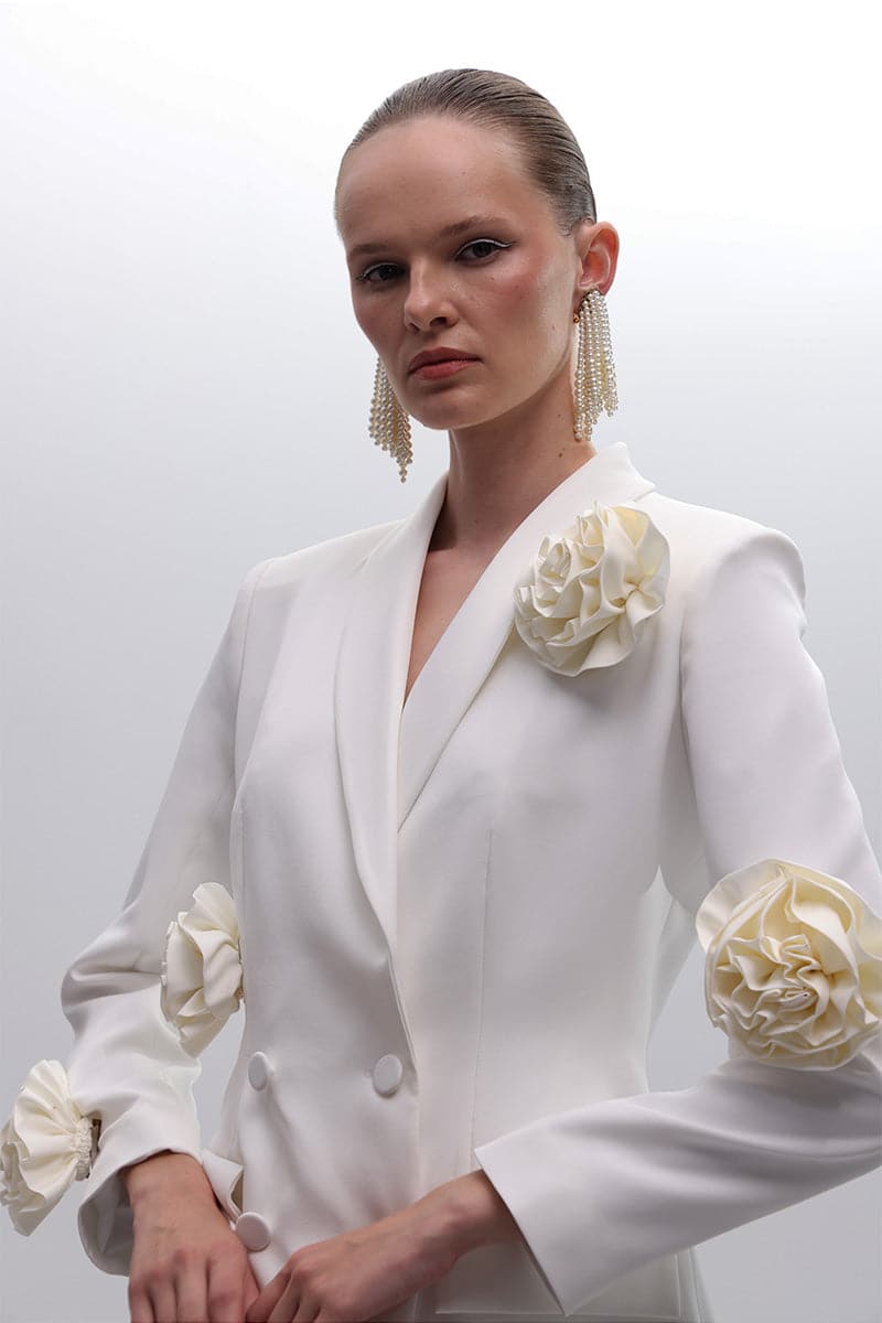 Introducing the off-white Hourglass Blazer, adorned with four sophisticated front buttons and a classic lapel collar. Its full sleeves are accentuated by subtle shoulder pads, adding a touch of refinement. For a playful and colorful twist, consider the optional flower brooches available in the accessories section. Choose a brooch that complements your outing, allowing you to customize your look to perfection.