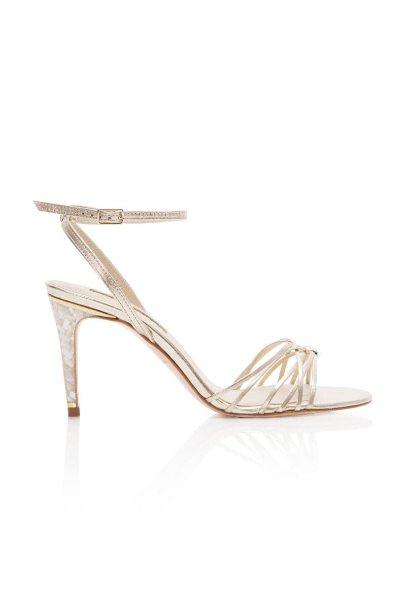 Part of our Iconic collection of contemporary jewelled heels, Bella is a luxurious champagne leather sandal featuring the Freya Rose signature jewelled pearl heels; a statement mid heel shoe handcrafted with genuine Mother of Pearl.