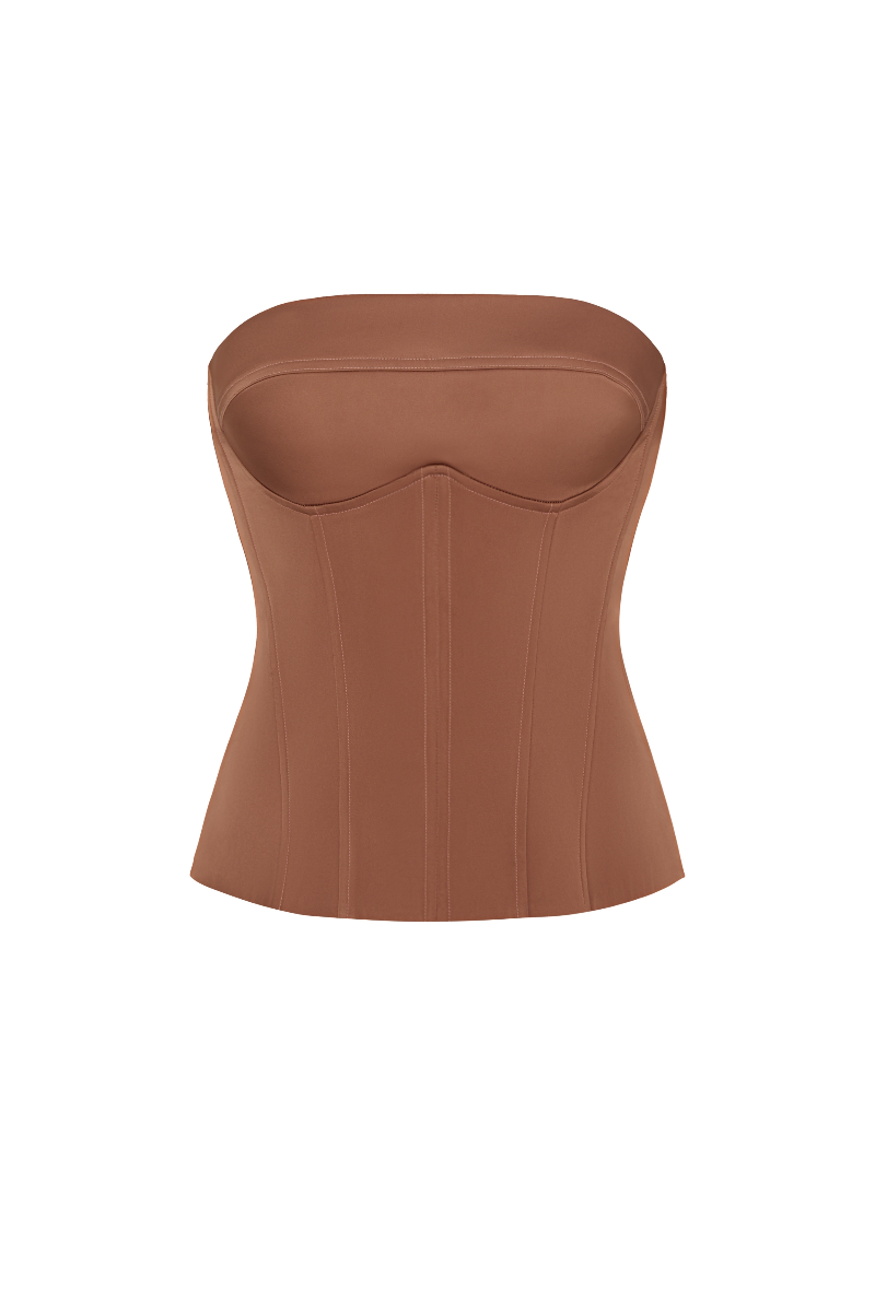 Handmade in Vietnam with a zippered bandeau top and corset, paired with straight pants.