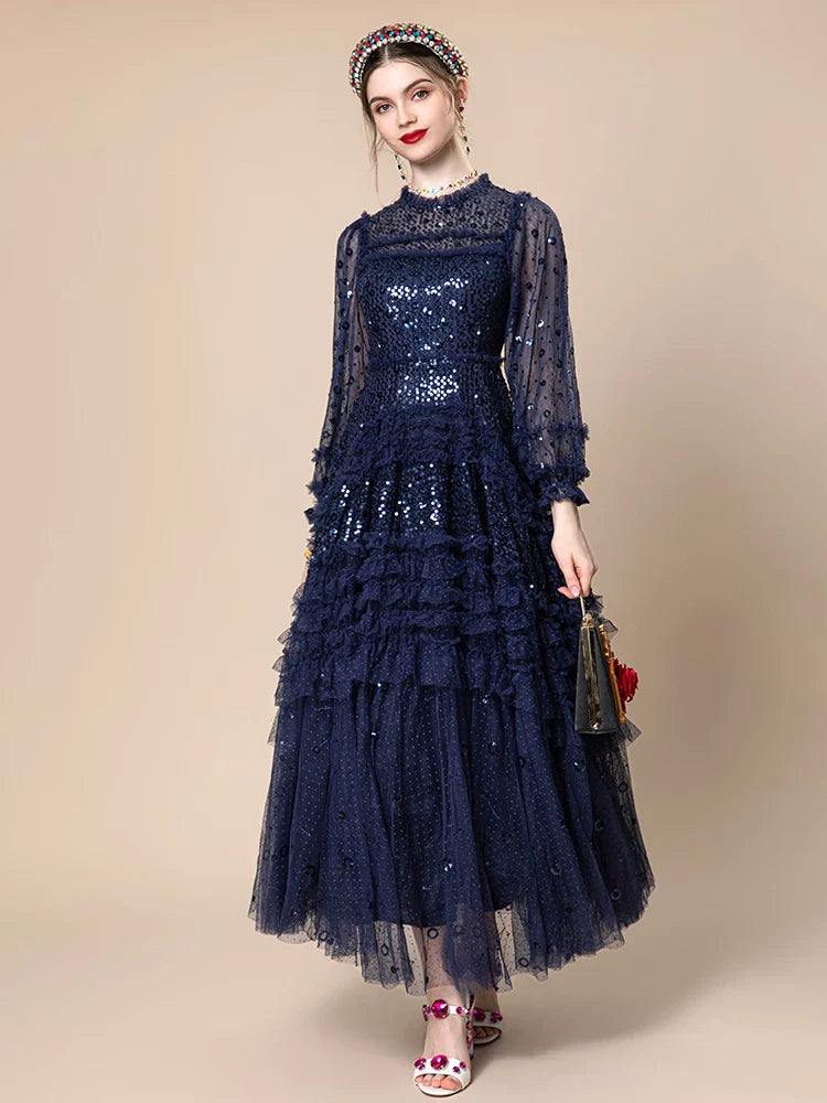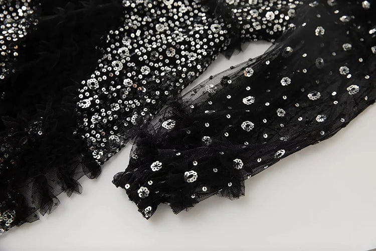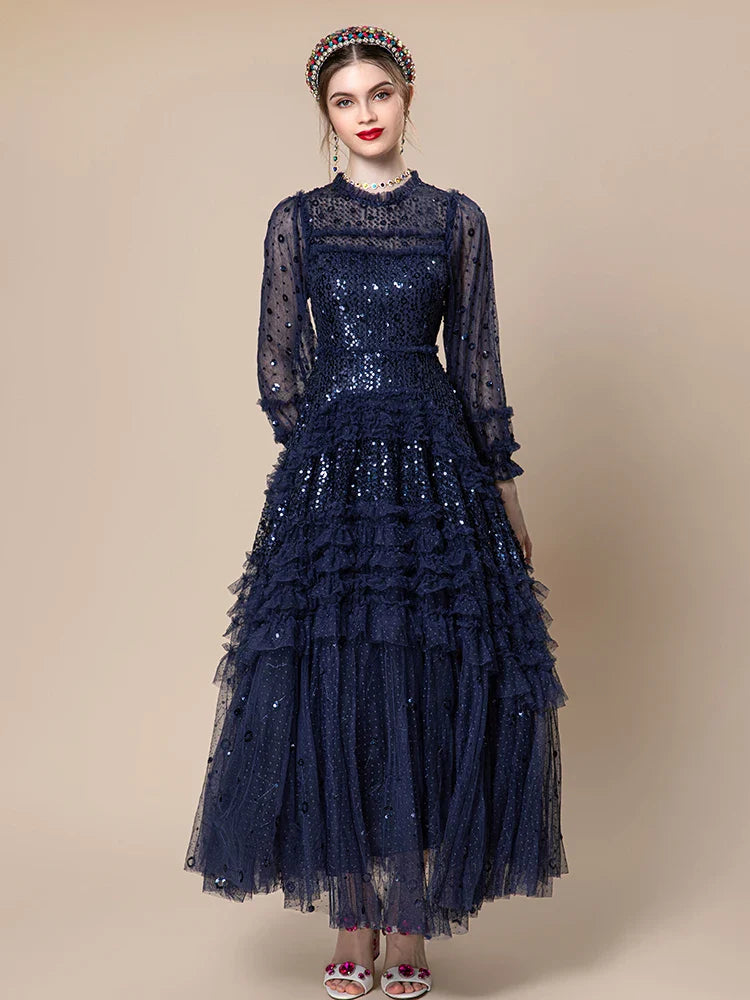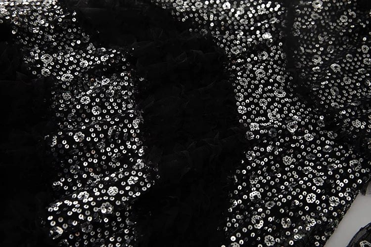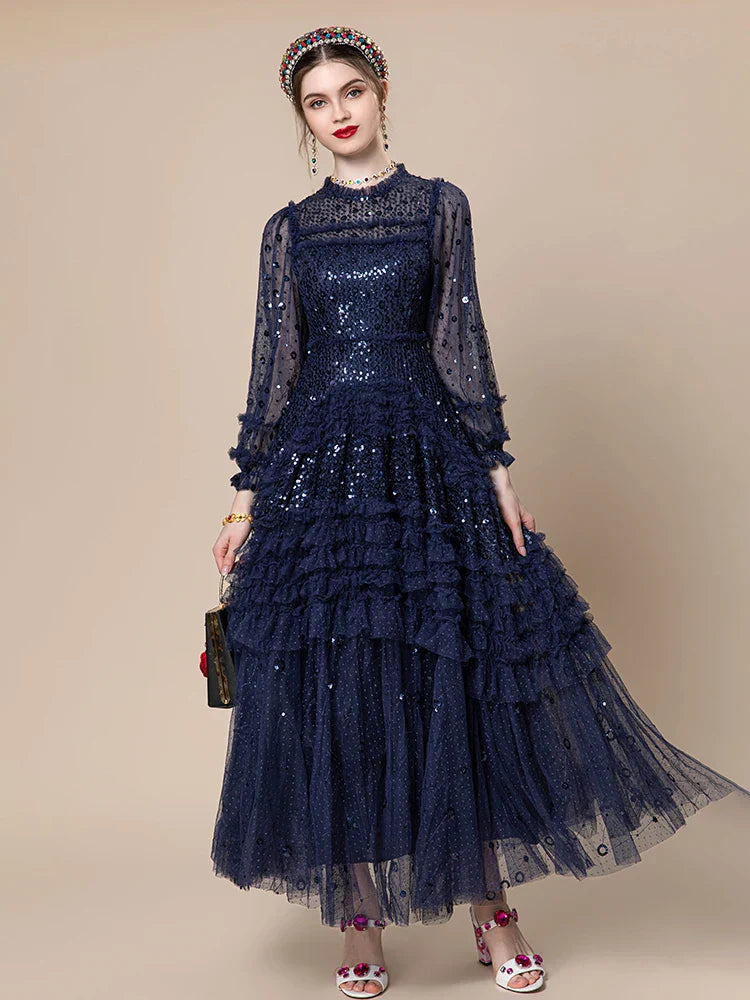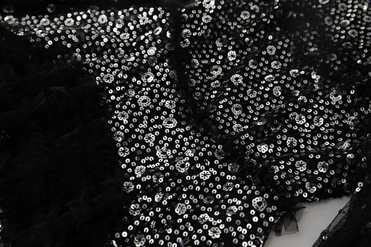 This stunning midi dress blends cascading ruffles with sparkling sequins, creating an elegant and modest silhouette. Perfect for cocktail parties, evening affairs, or formal events, it offers a luxurious fit that ensures comfort throughout the night.