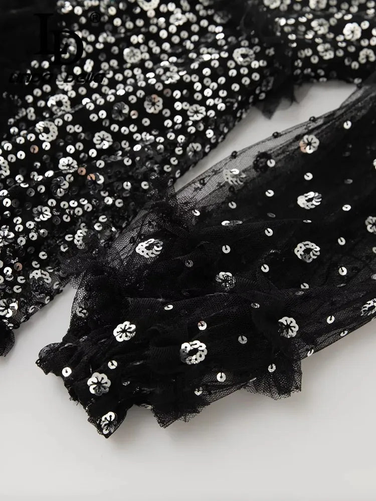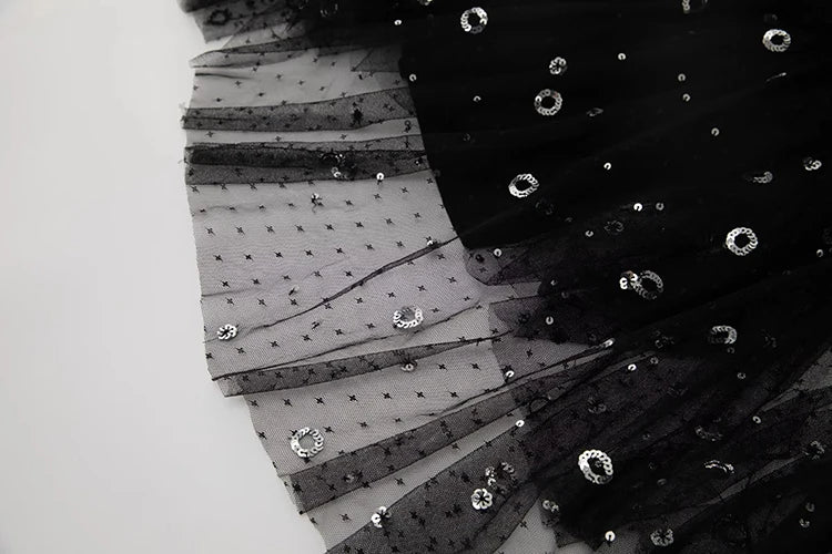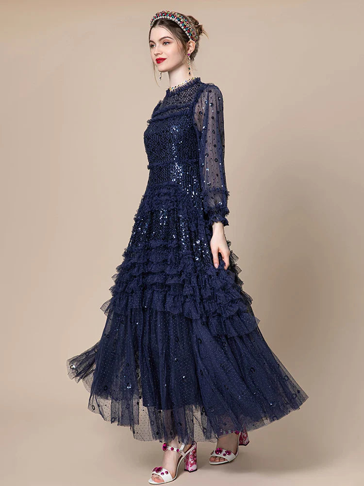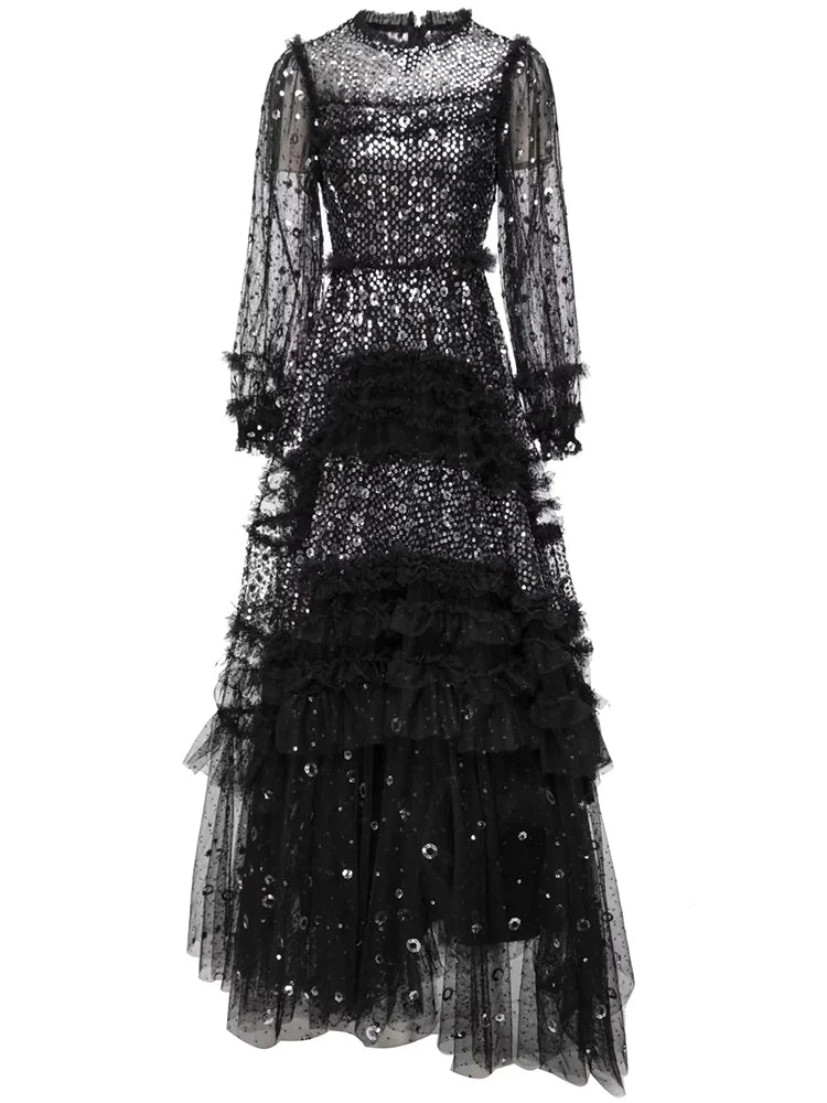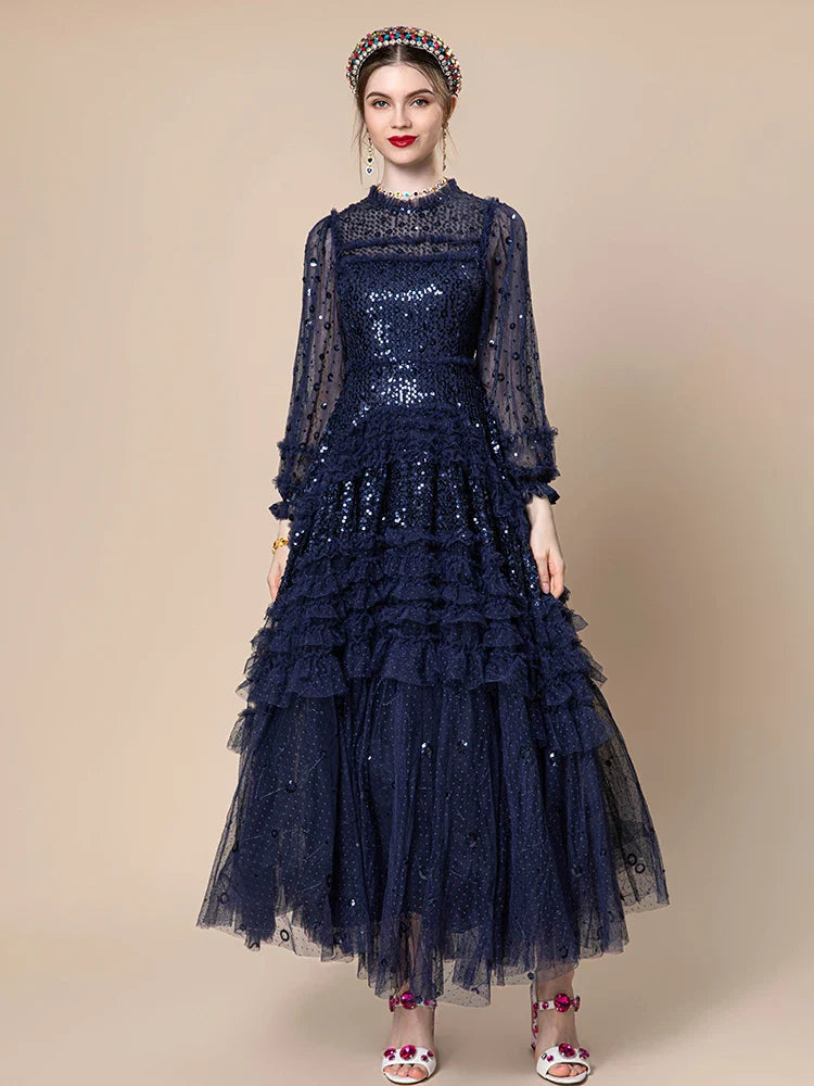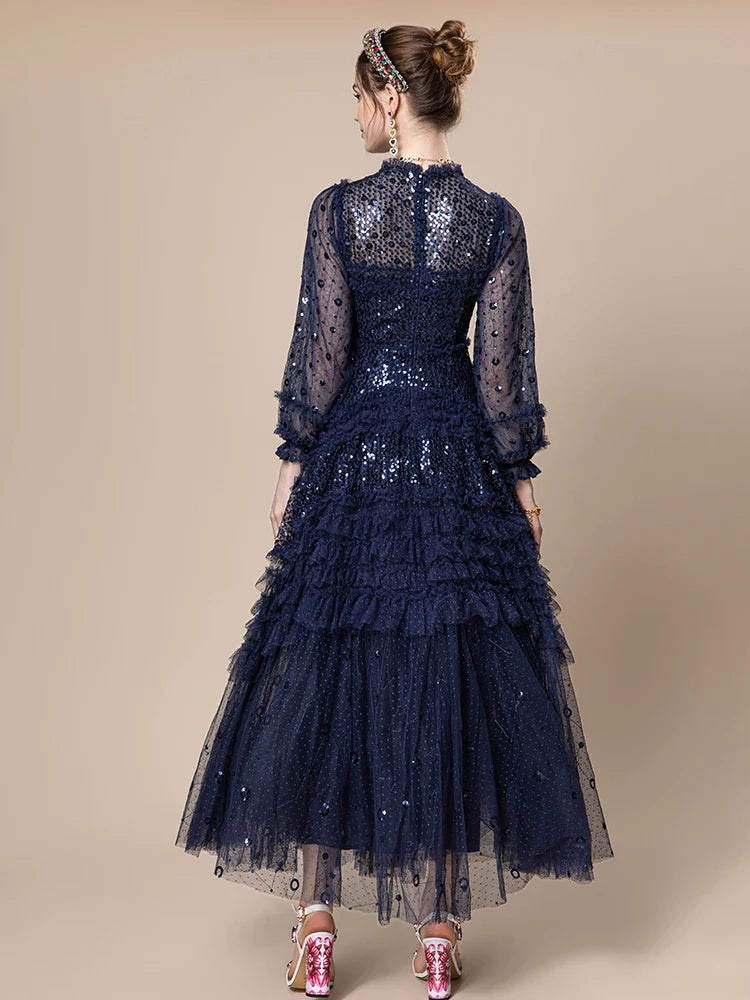 This stunning midi dress blends cascading ruffles with sparkling sequins, creating an elegant and modest silhouette. Perfect for cocktail parties, evening affairs, or formal events, it offers a luxurious fit that ensures comfort throughout the night.