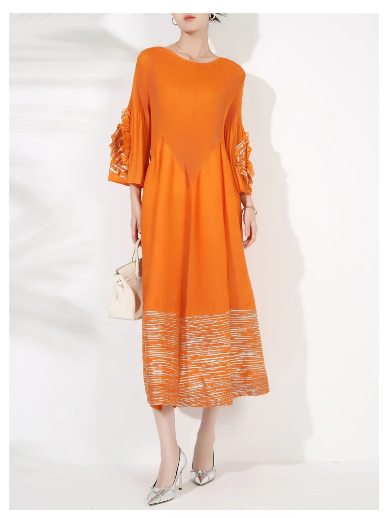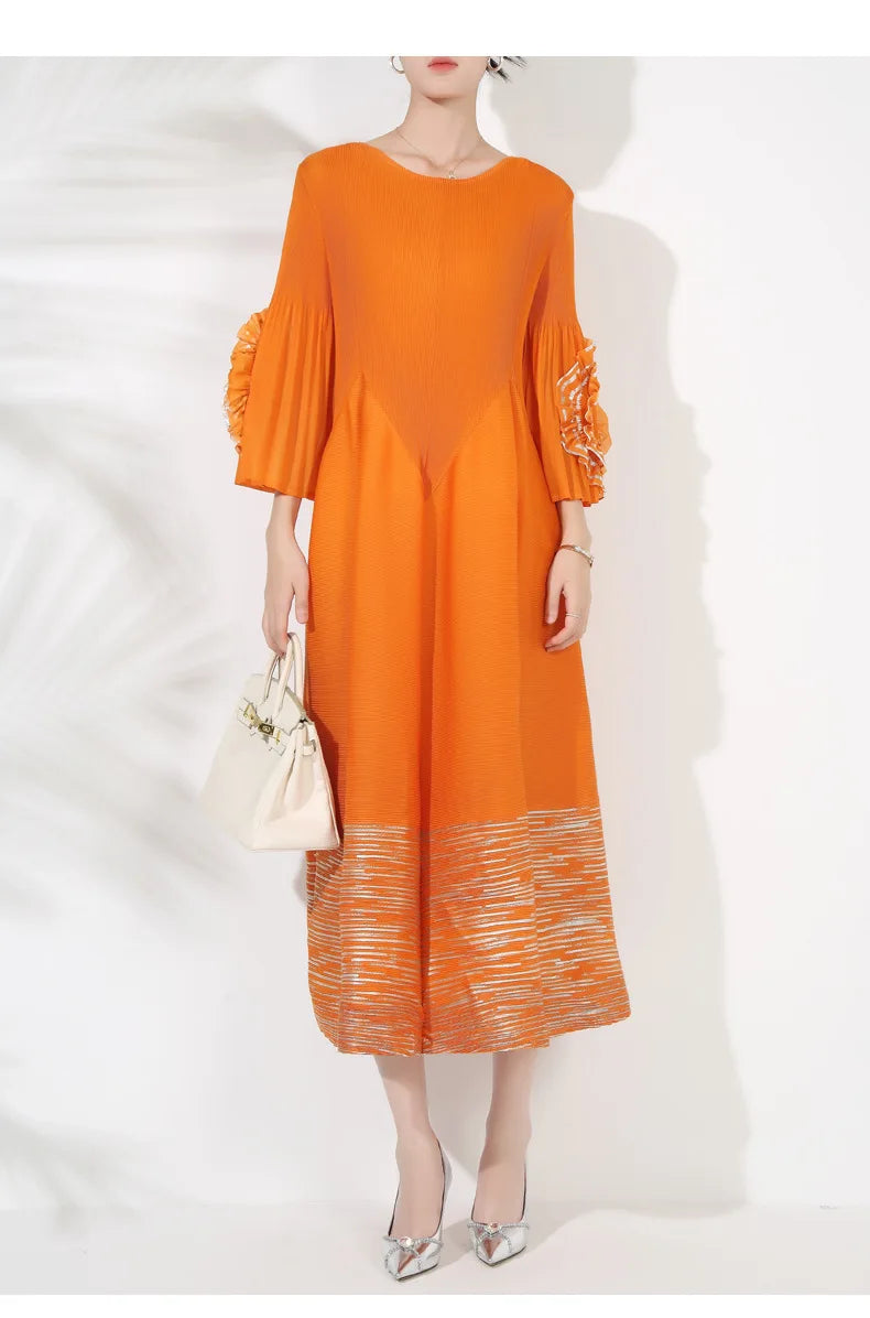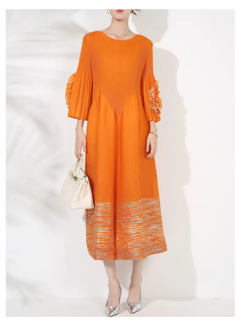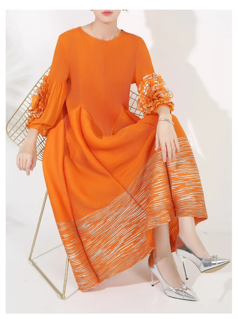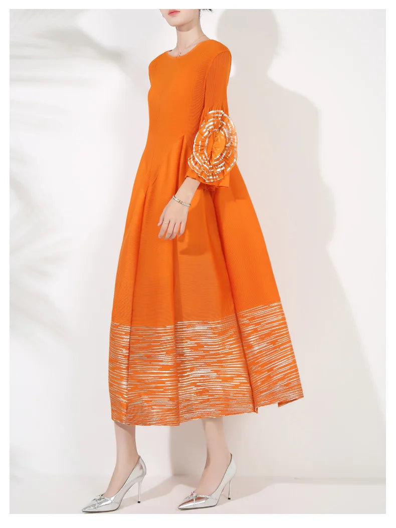 The Couture Pleated Floral 3/4 Sleeve Midi Dress in vibrant orange exudes elegance. Featuring delicate floral embellishments on the sleeves and crafted from genuine pleated fabric, this dress combines comfort and style.