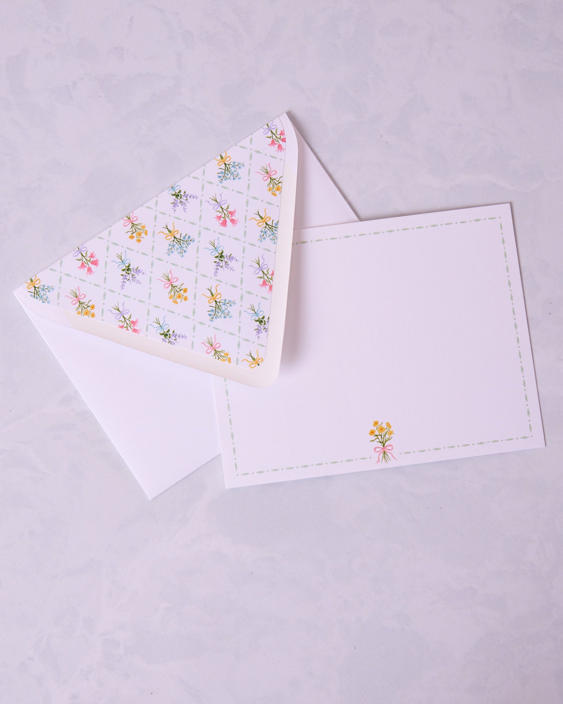 - This charming set includes notecards with a beautiful marigold bouquet and mint dotted border, plus a liner adorned with a variety of bouquets in a dotted mint colored trellis.