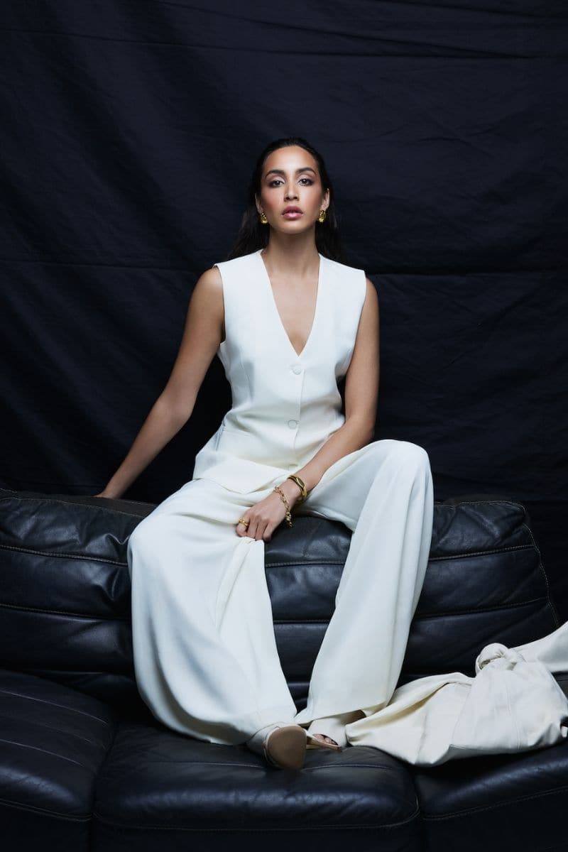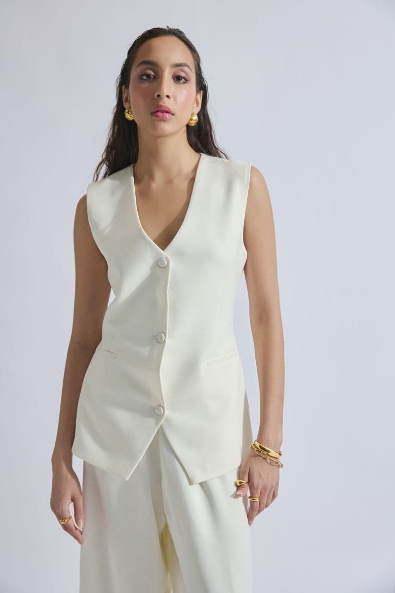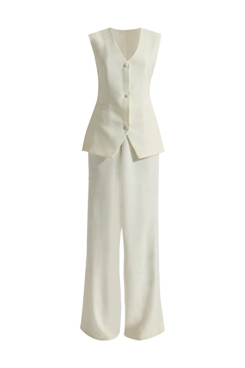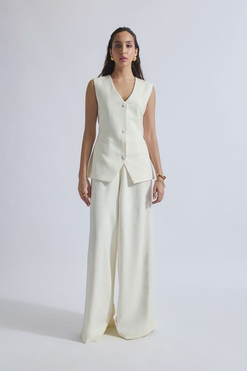 An ensemble featuring an oversized waistcoat paired with tailored trousers, offering a blend of modern flair and timeless elegance.