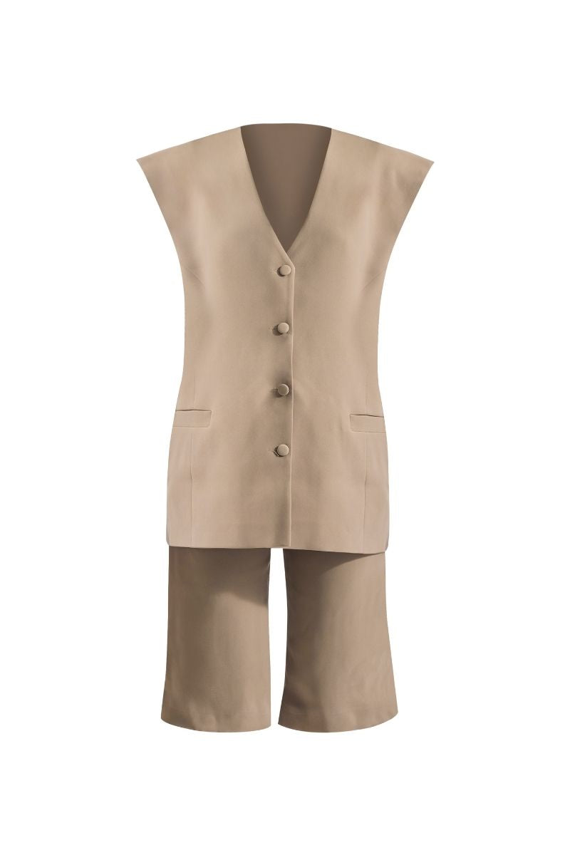 An oversized waistcoat paired with tailored shorts, blending contemporary oversized style with polished sophistication.