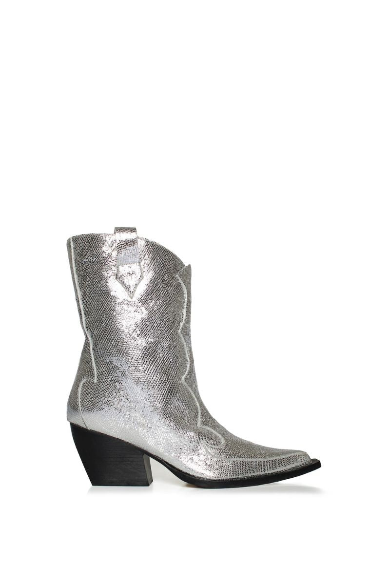 Crafted from stand out metallic silver leather, these ankle-height cowboy boots feature Terry de Havilland's signature attention to detail and quality.