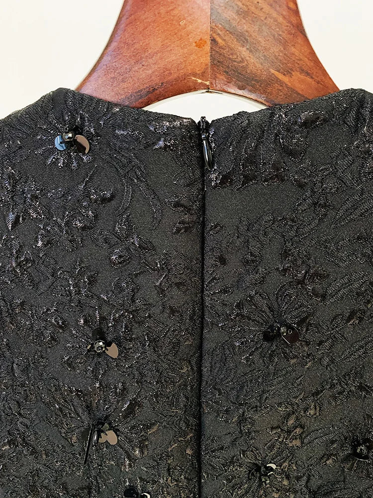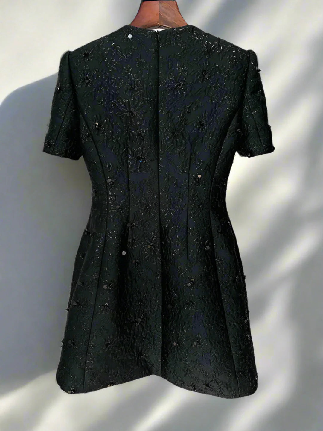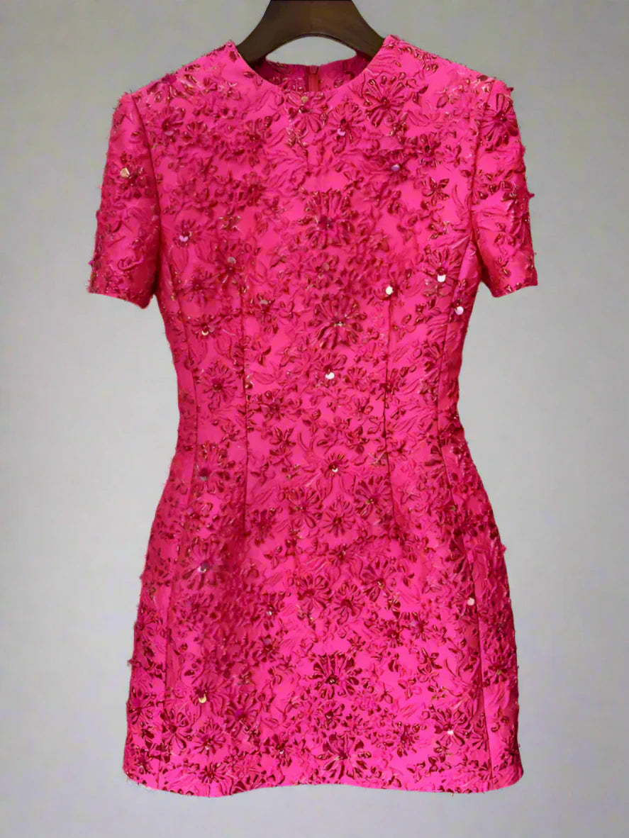 This floral sequin and embroidered mini dress is a must-have for your wardrobe. Combining elegance with a playful twist, the flirty mini length and delicate details make it a standout piece.