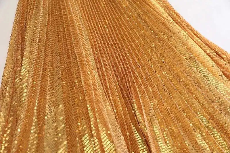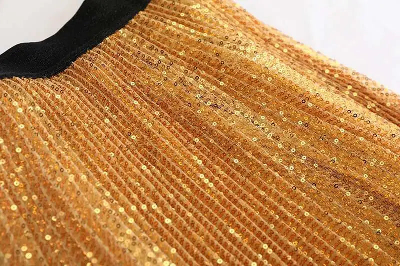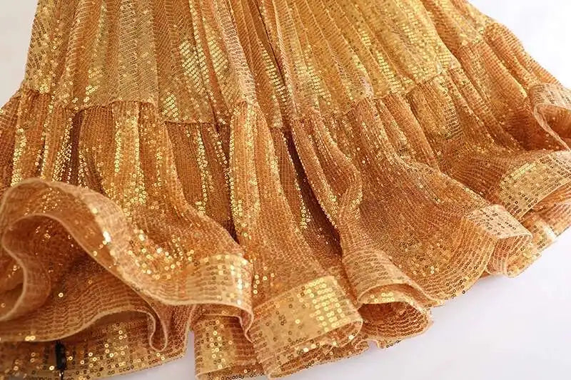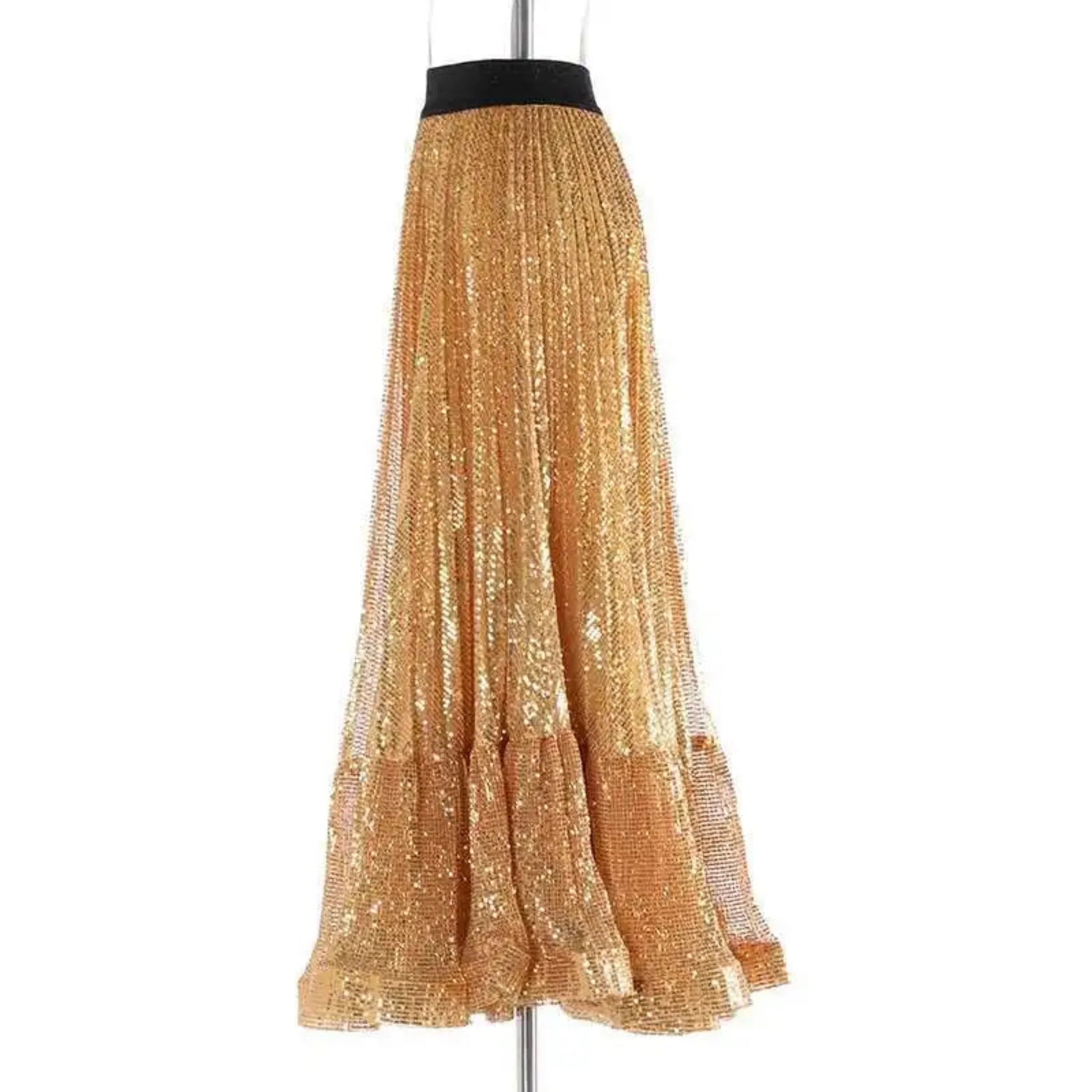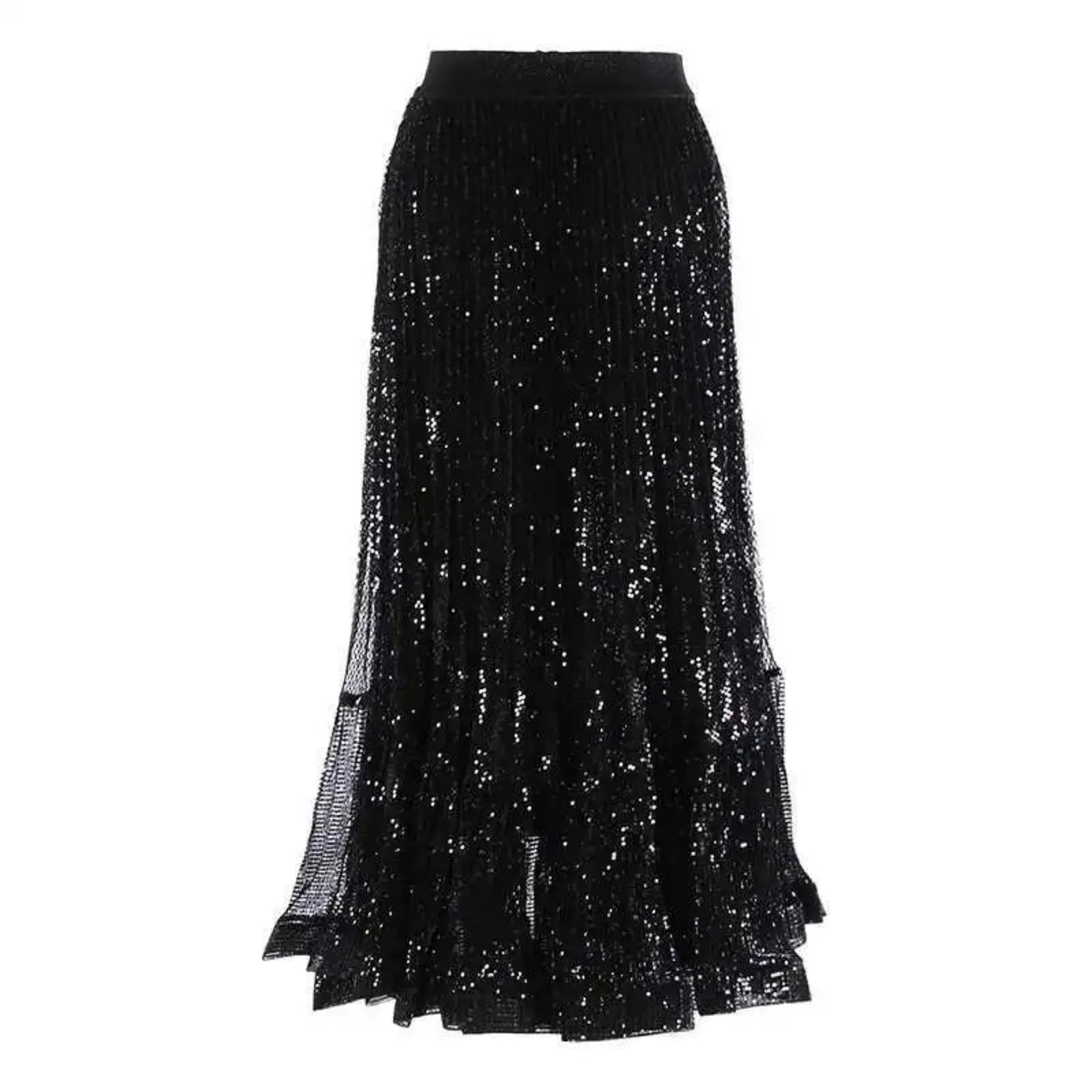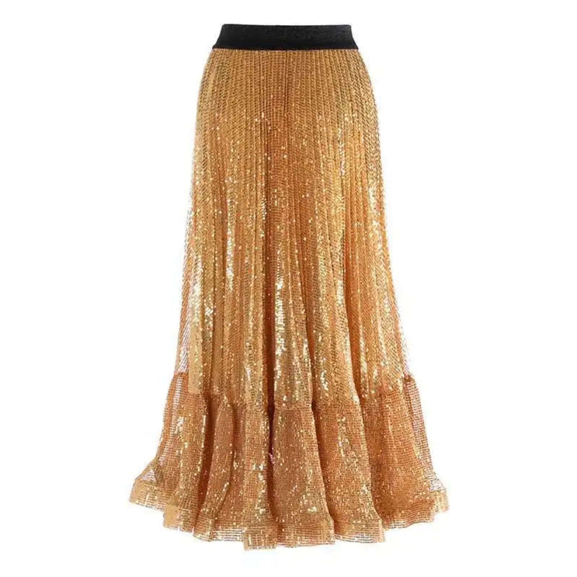 This glamorous midi skirt shines with delicate sequins and soft ruffled details. Designed with a pull-on style and elastic waistband, it offers a stretchy, comfortable fit while delivering feminine elegance and luxury.