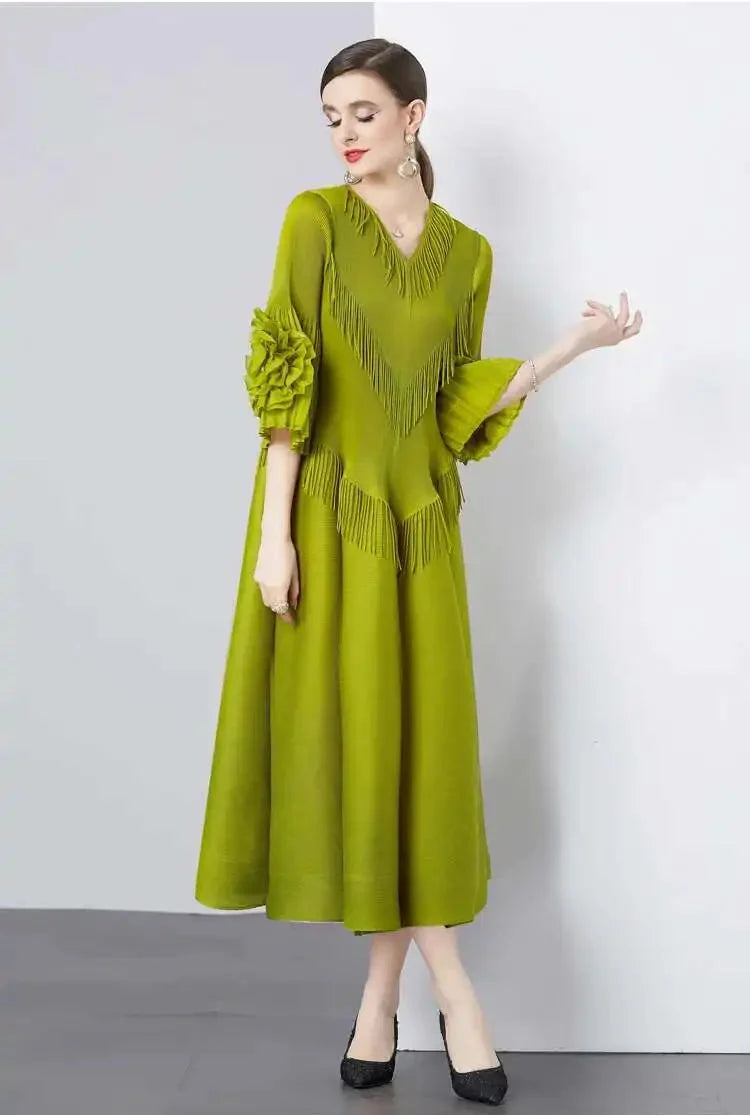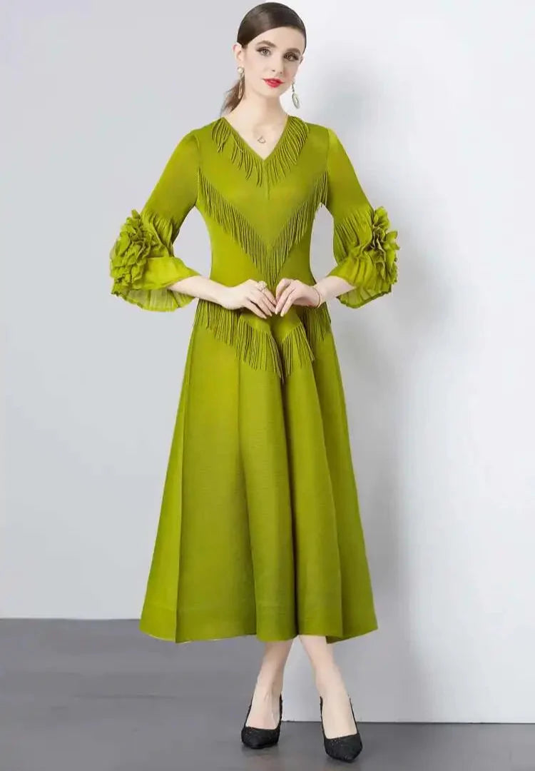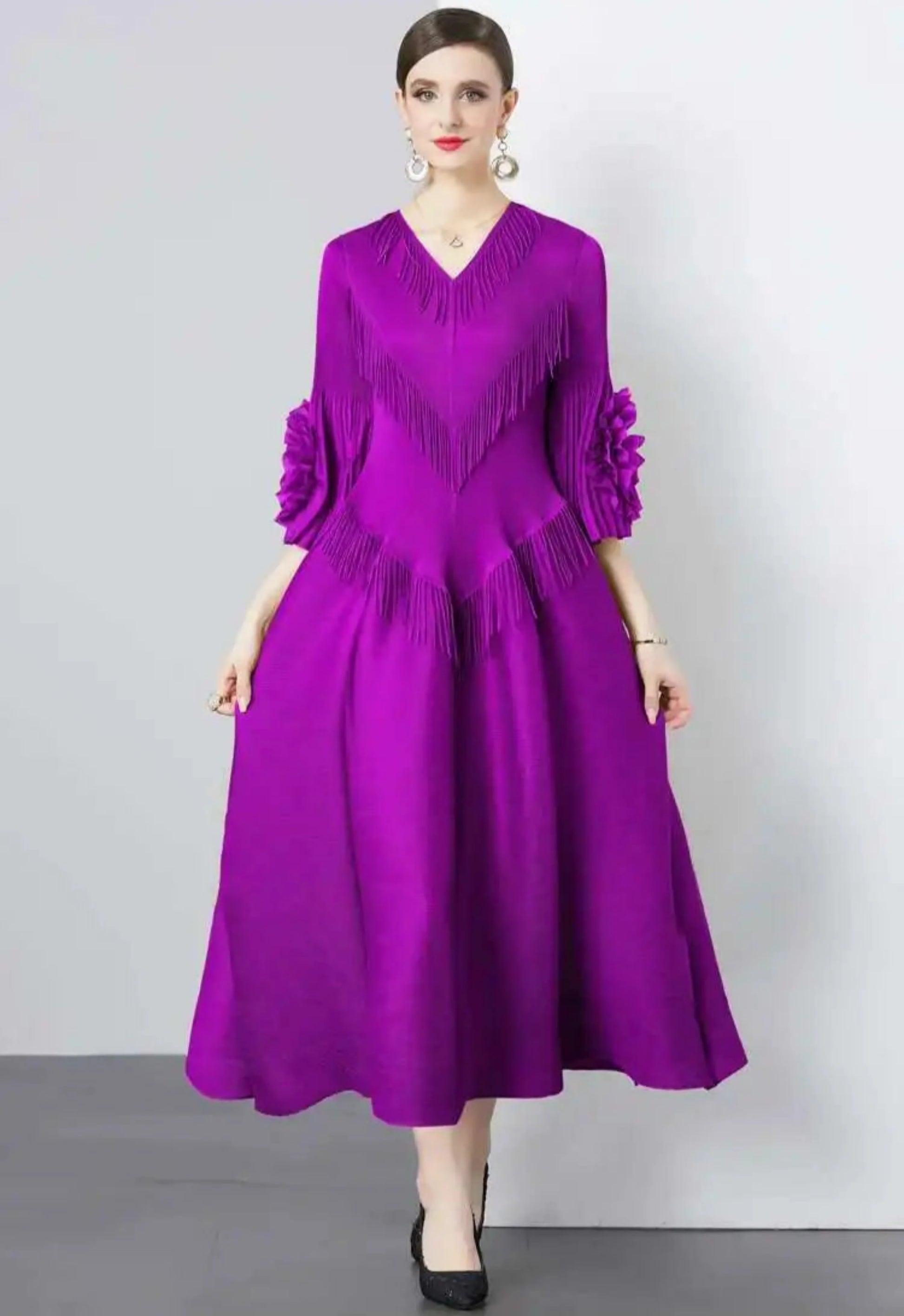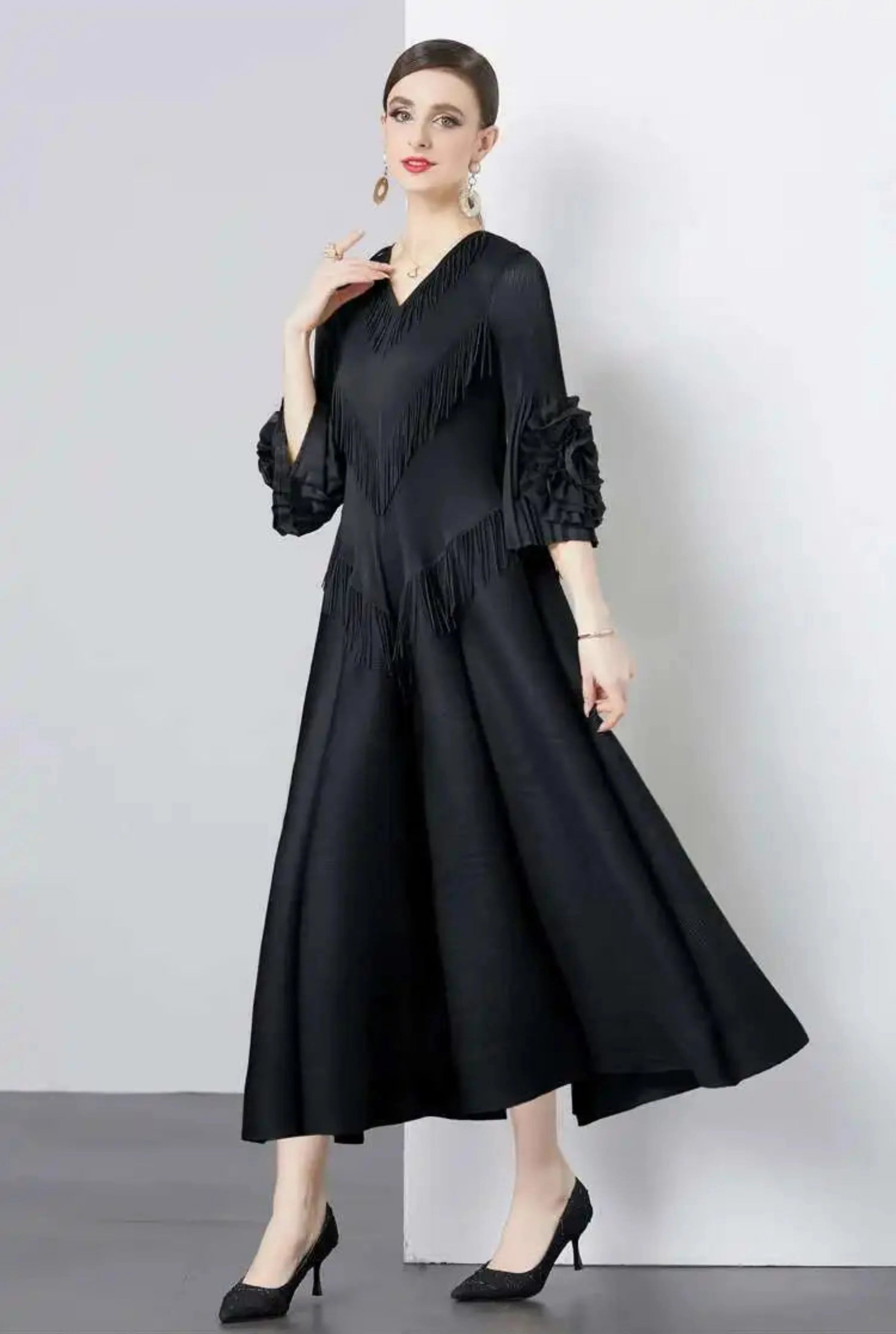 Elegant midi dress featuring a cape sleeve with delicate floral accents on the sleeves. Made from stretchy, wrinkle-resistant Japanese pleats that flow gracefully.