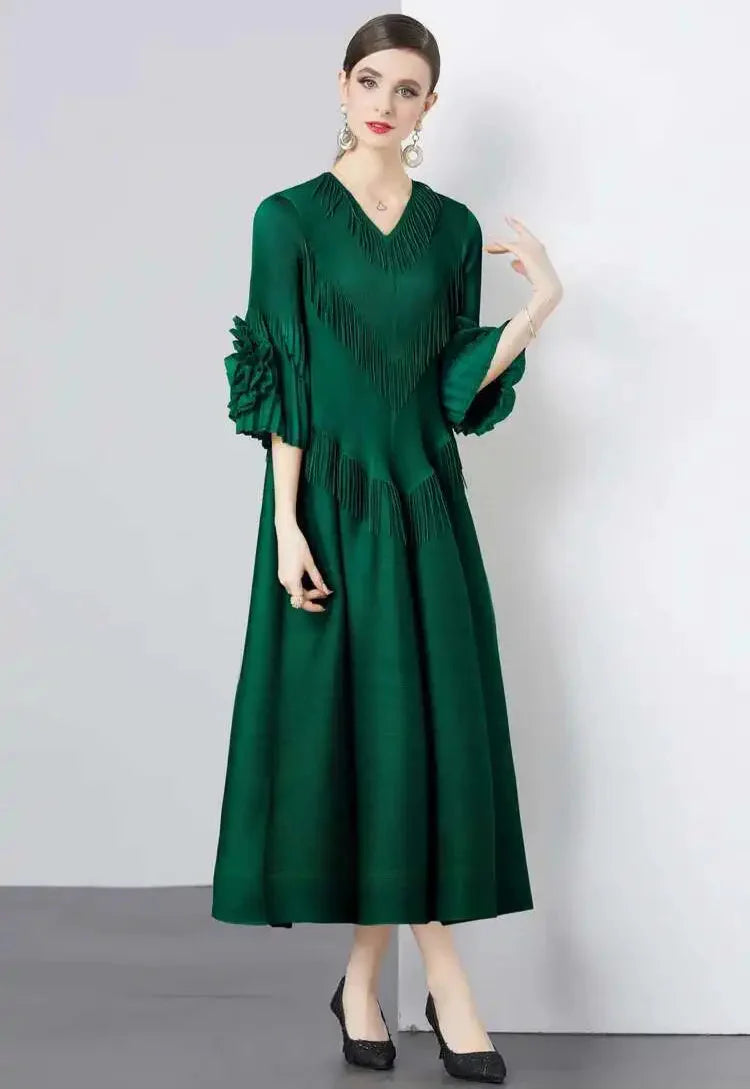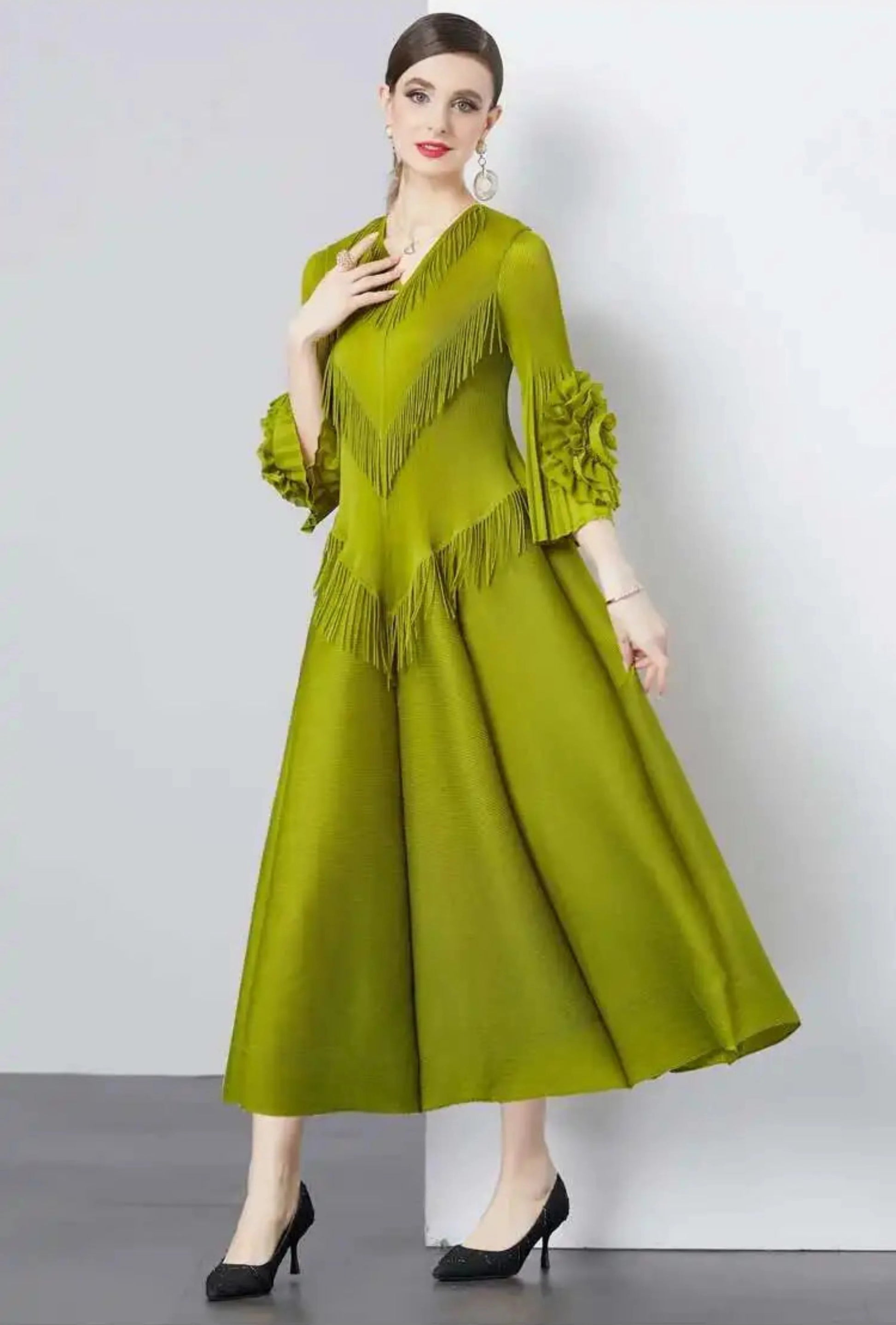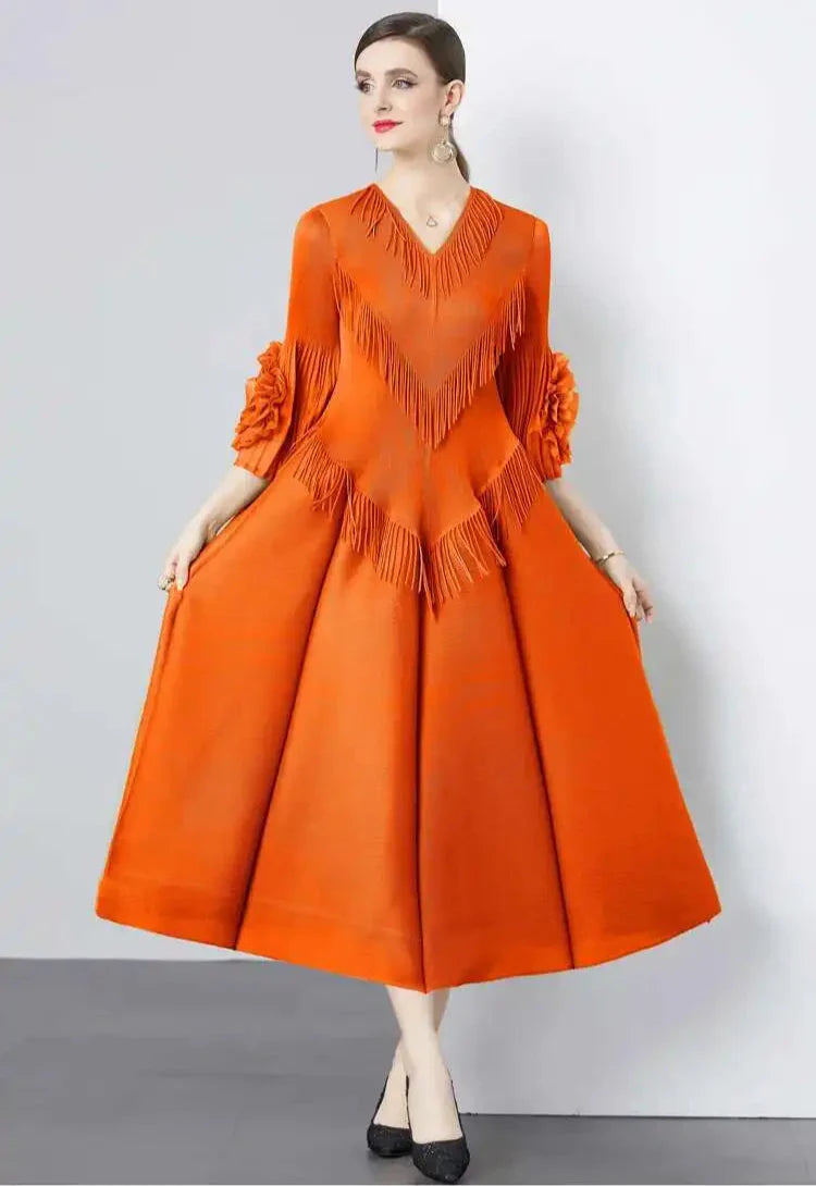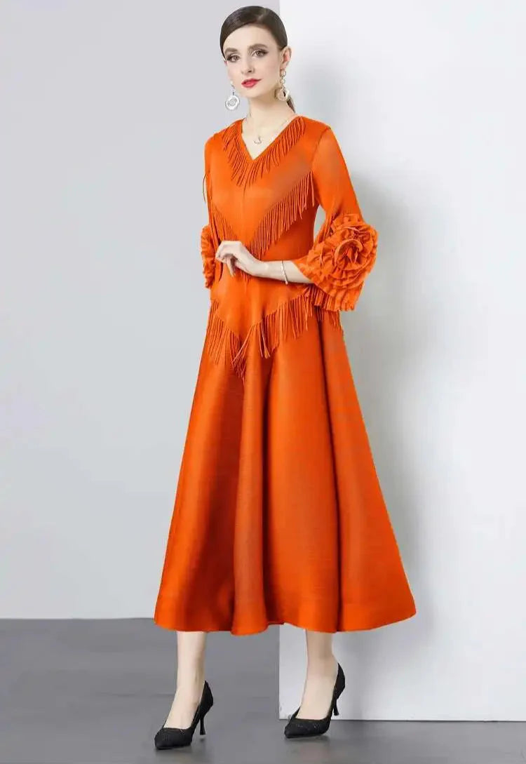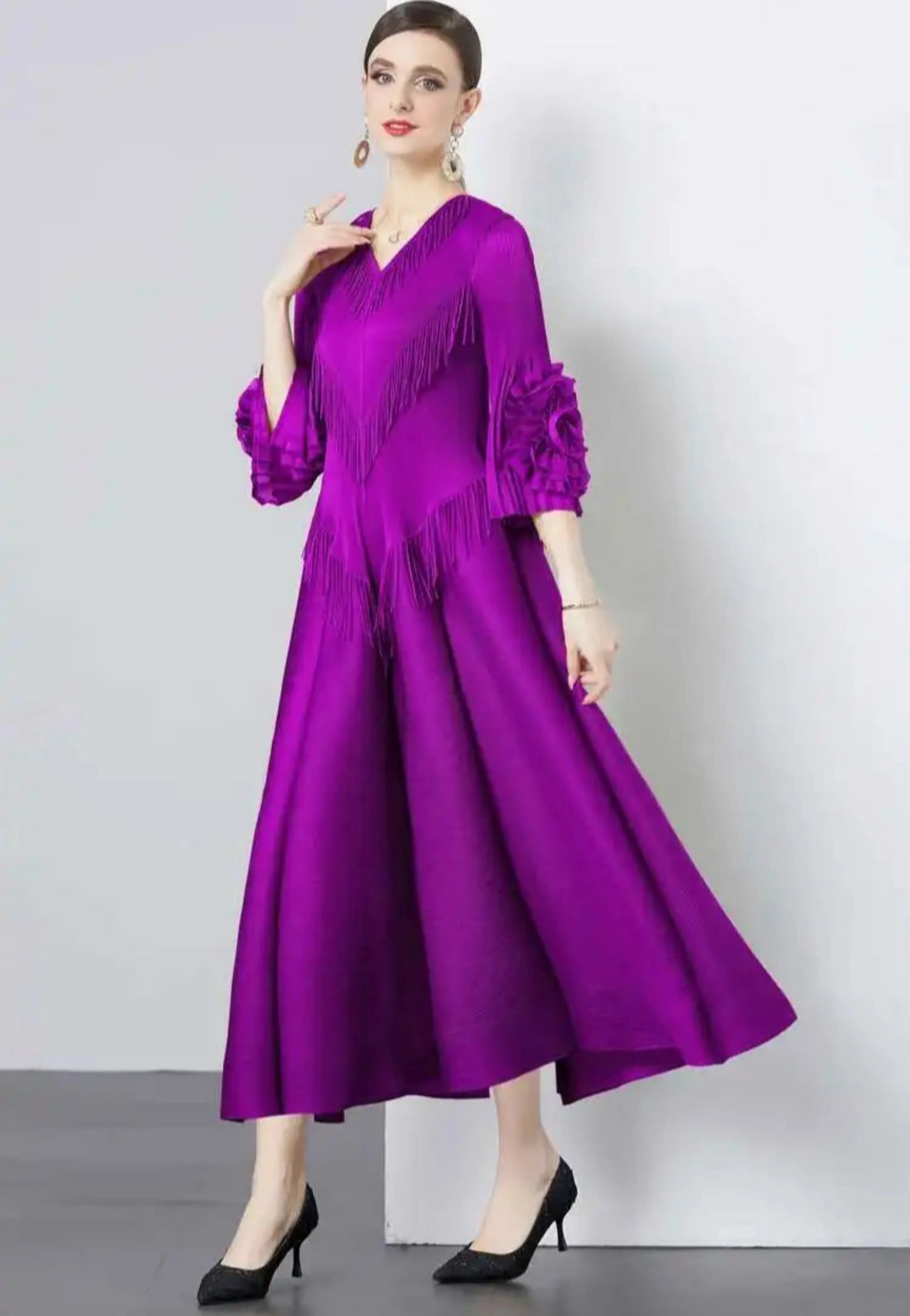 Elegant midi dress featuring a cape sleeve with delicate floral accents on the sleeves. Made from stretchy, wrinkle-resistant Japanese pleats that flow gracefully.