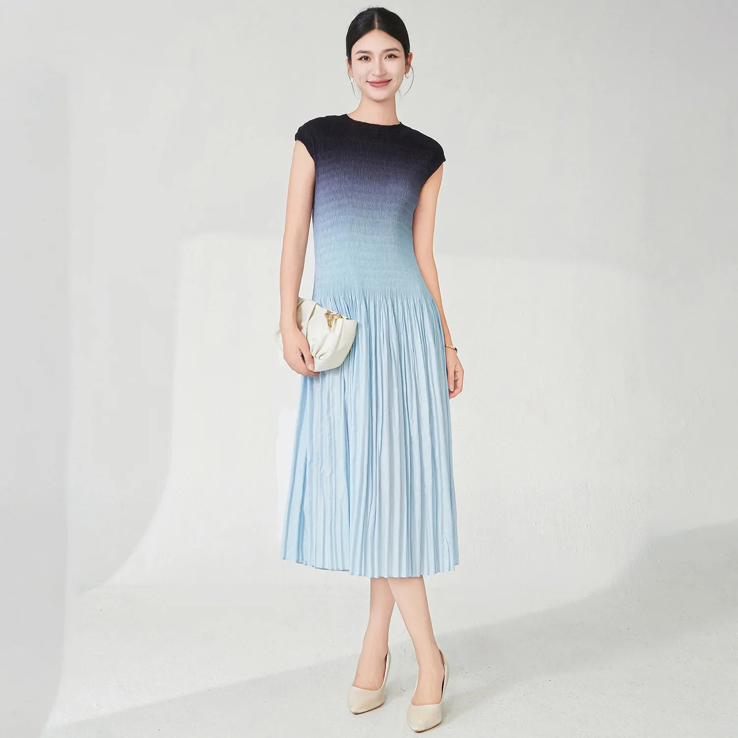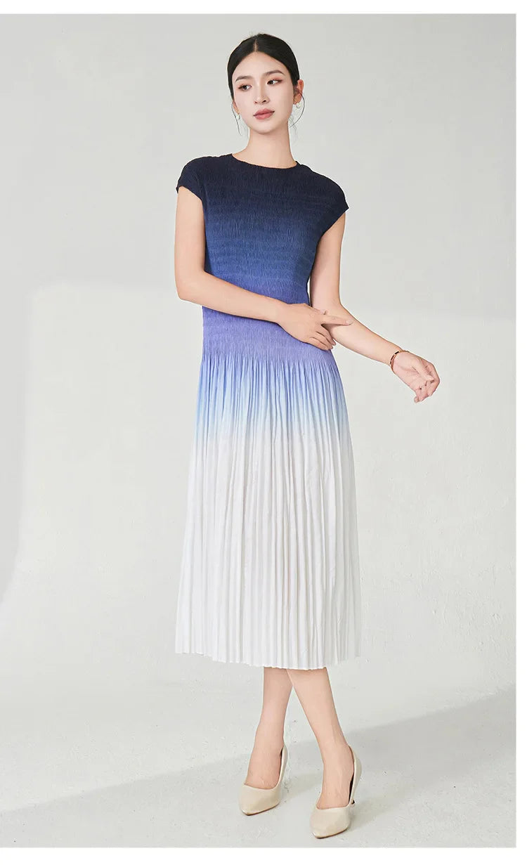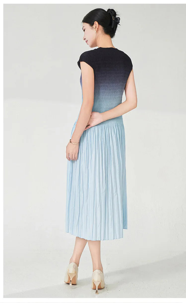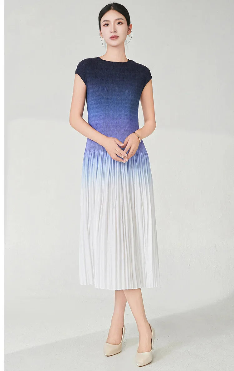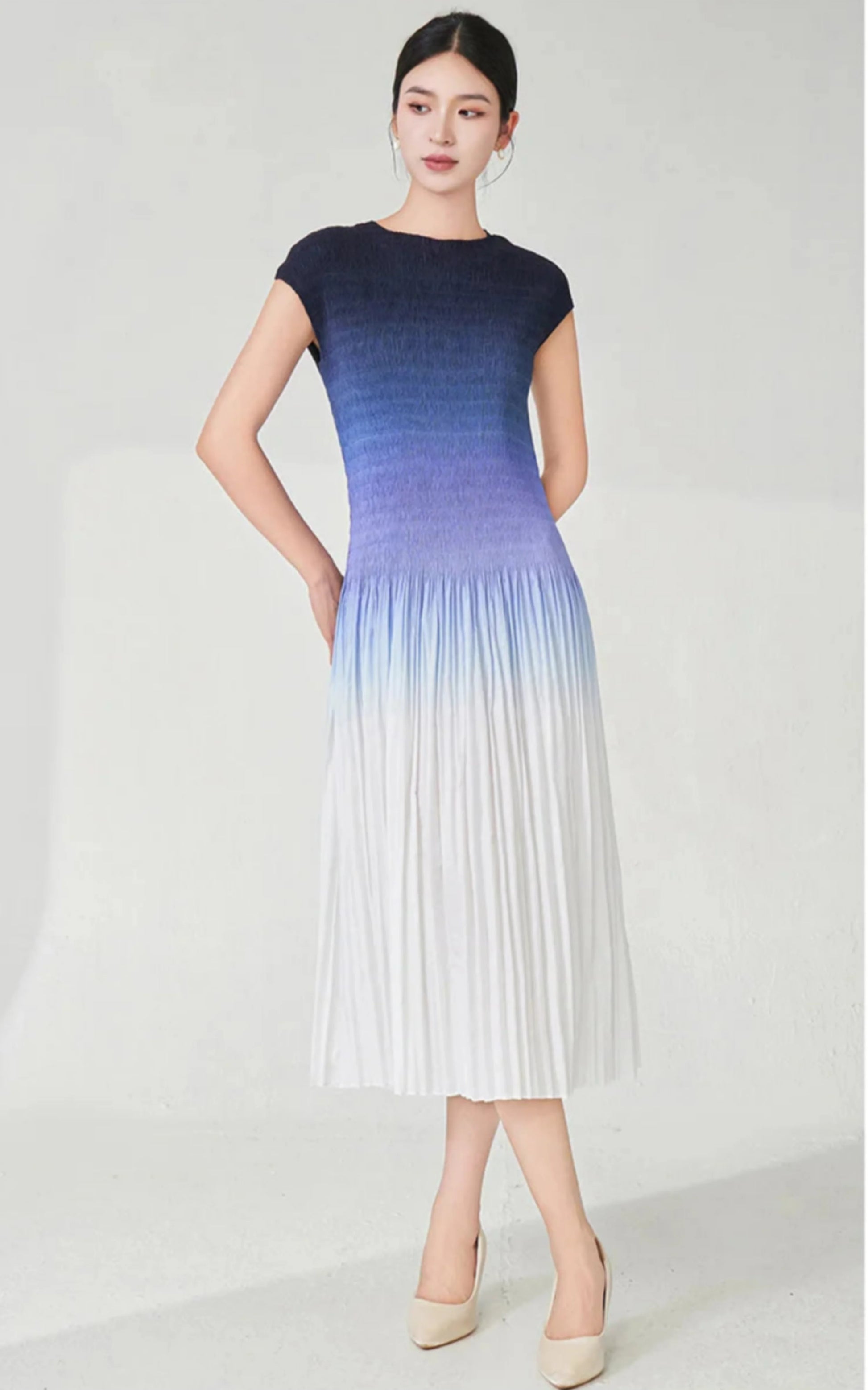 This unique ombré midi dress features contrasting pleat textures and extra short sleeves for a modern, elevated shape.