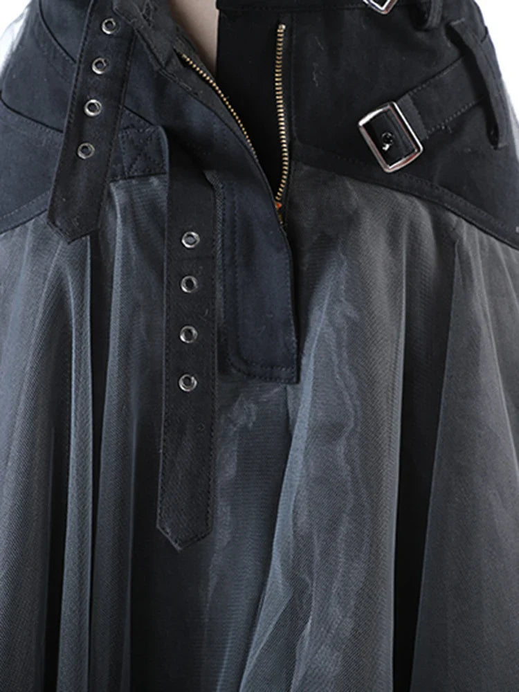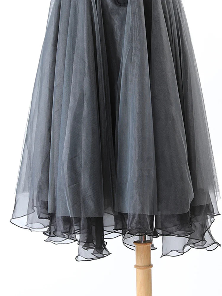 A graceful mid-length skirt crafted from layered gray mesh tulle with delicate pleats. Designed high-waisted for a flattering fit, it blends luxurious texture with elegant, modern style—perfect for both day and evening looks.