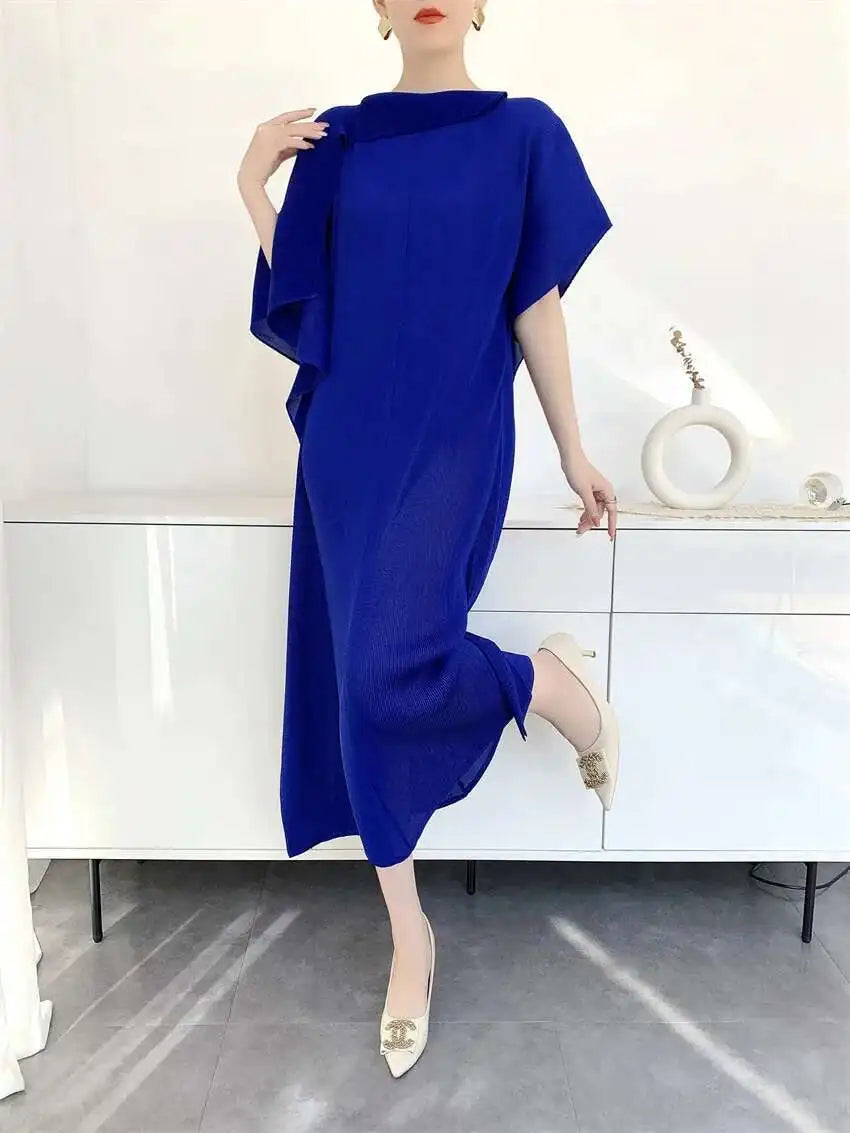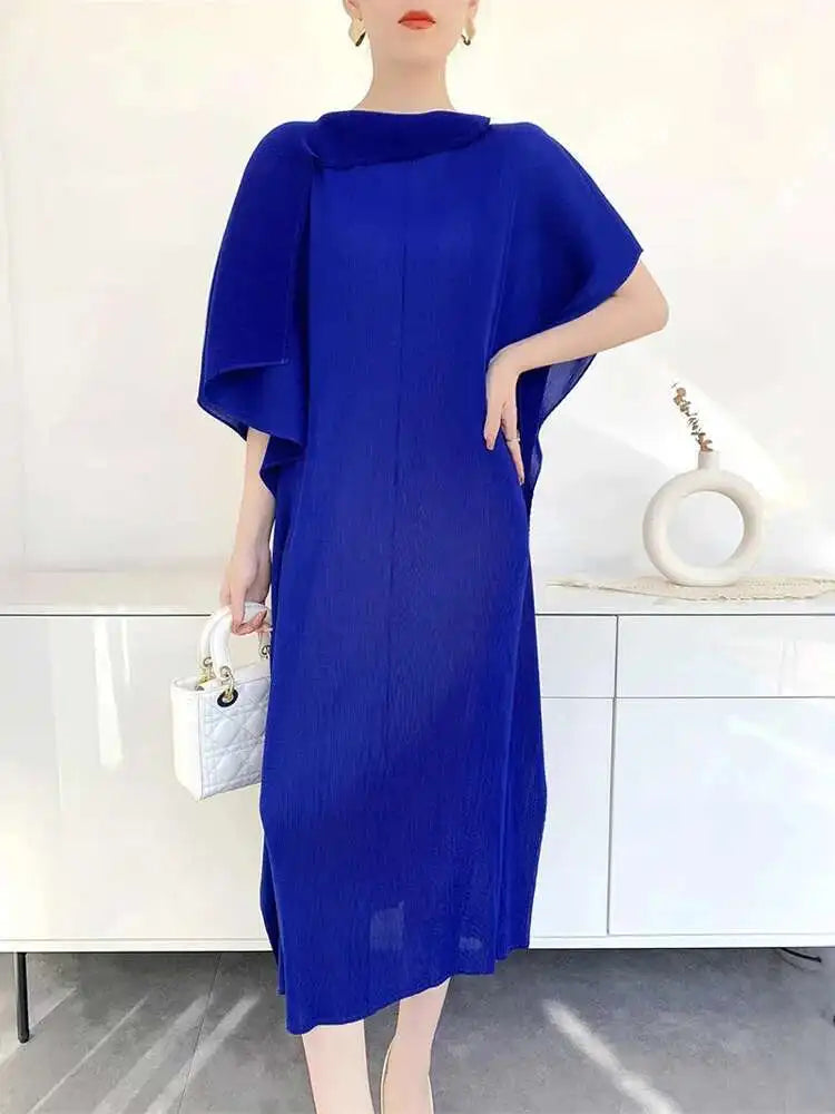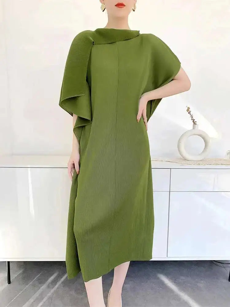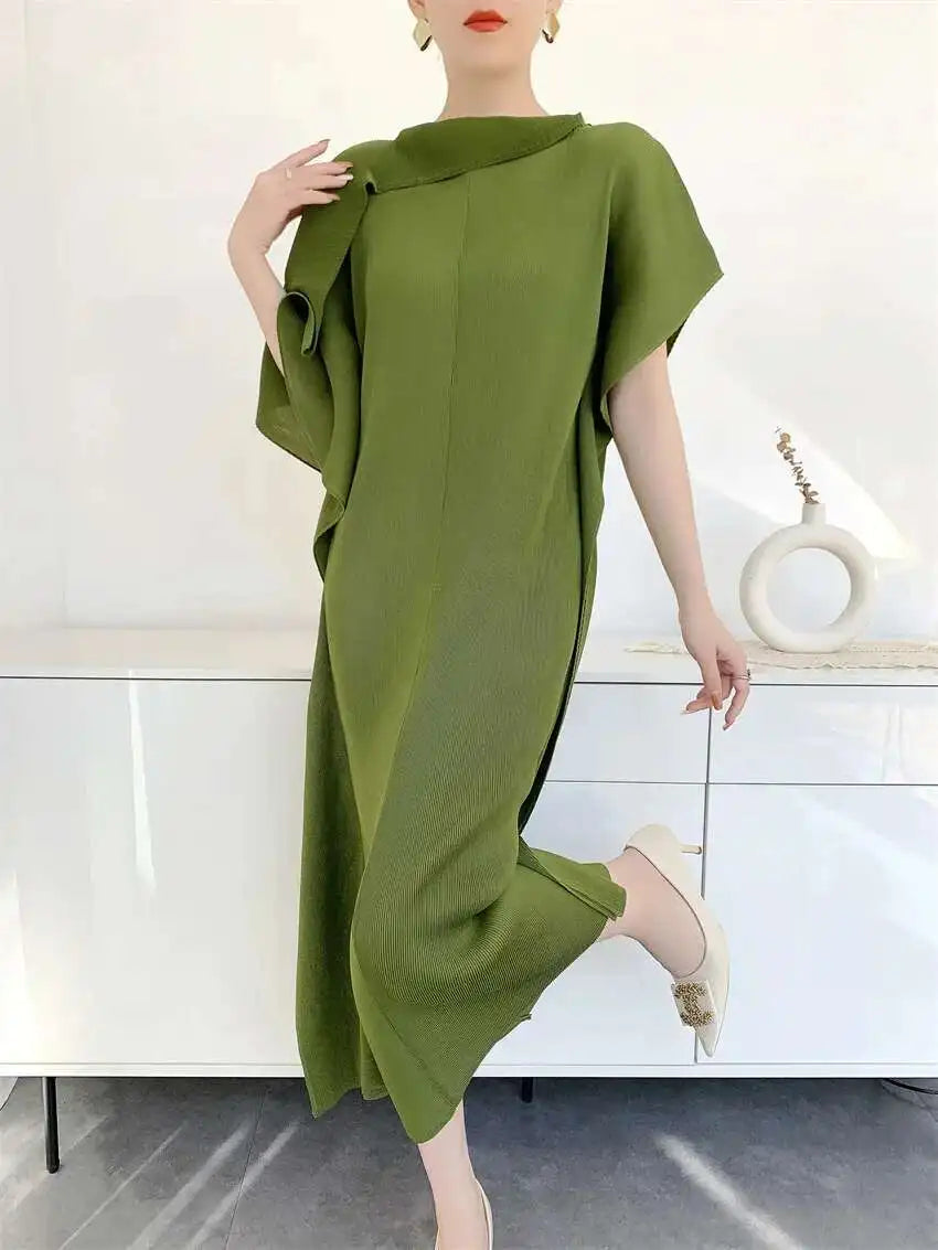 A chic tunic dress featuring stretchy Japanese pleats and short sleeves that create a flattering and comfortable fit.
