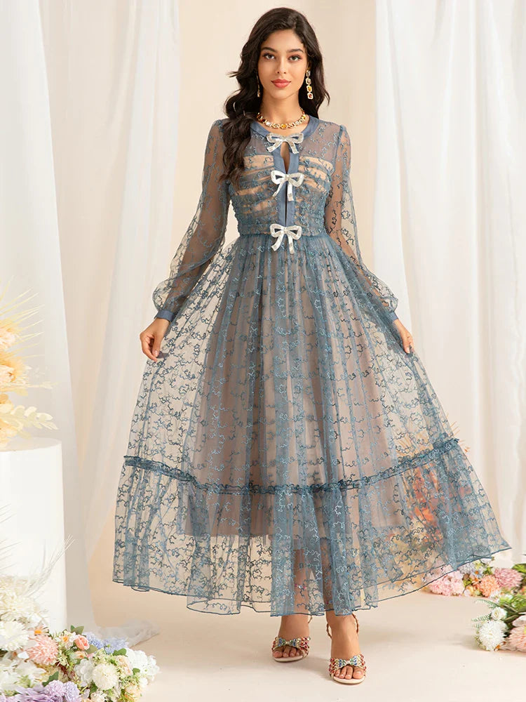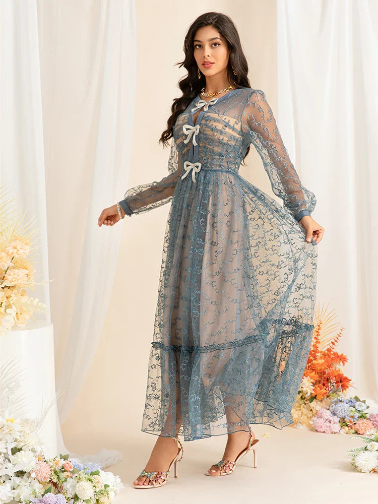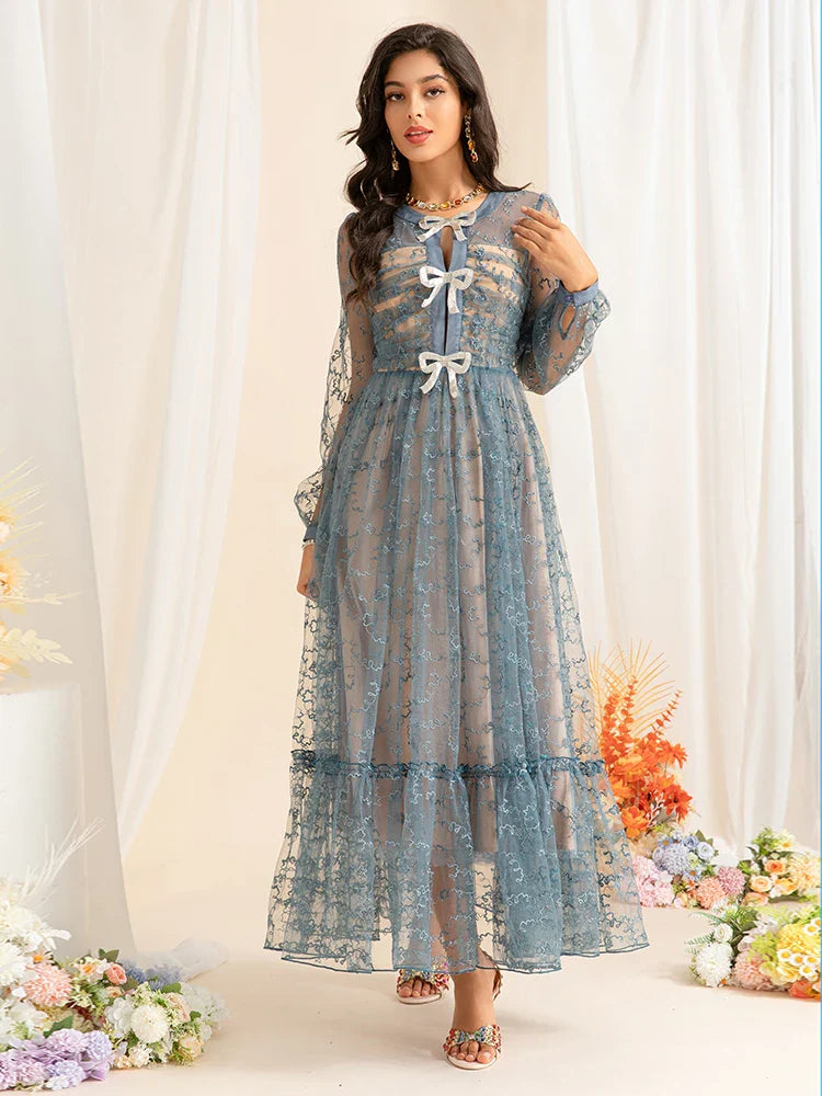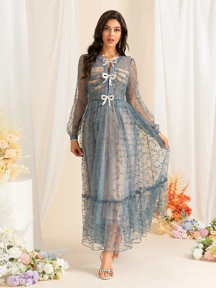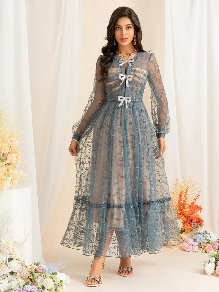 This enchanting midi dress features intricate embroidery, delicate mesh sleeves, and charming bow accents. Designed for elegance, its flowing silhouette creates a timeless look perfect for special occasions.