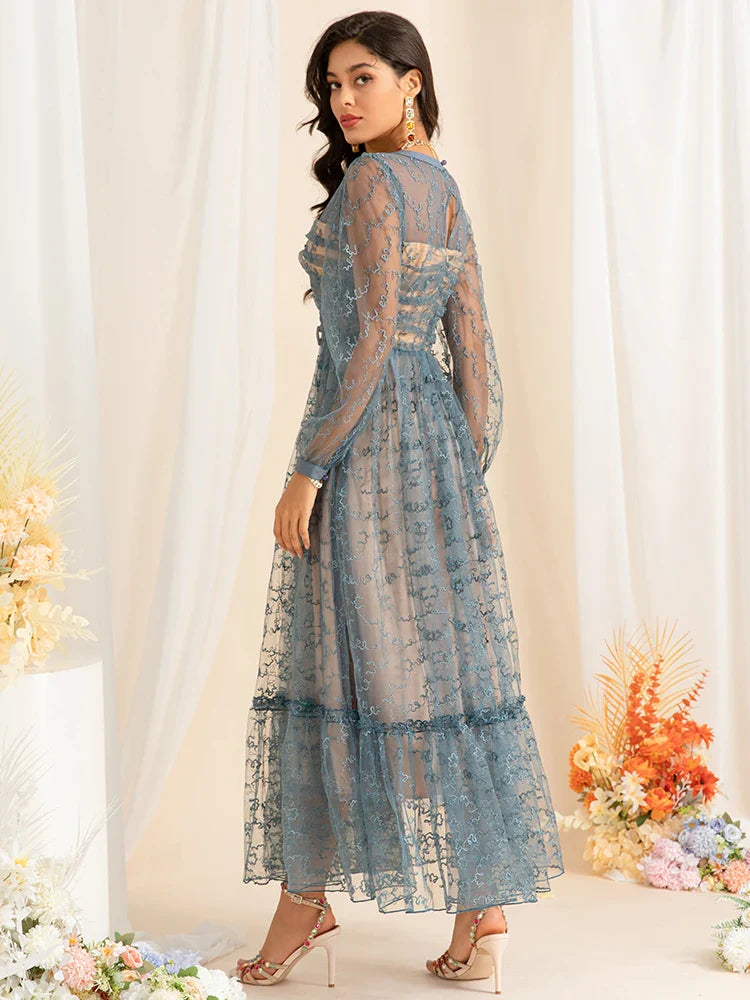 Elegant Blue Embroidered Mesh Long Dress