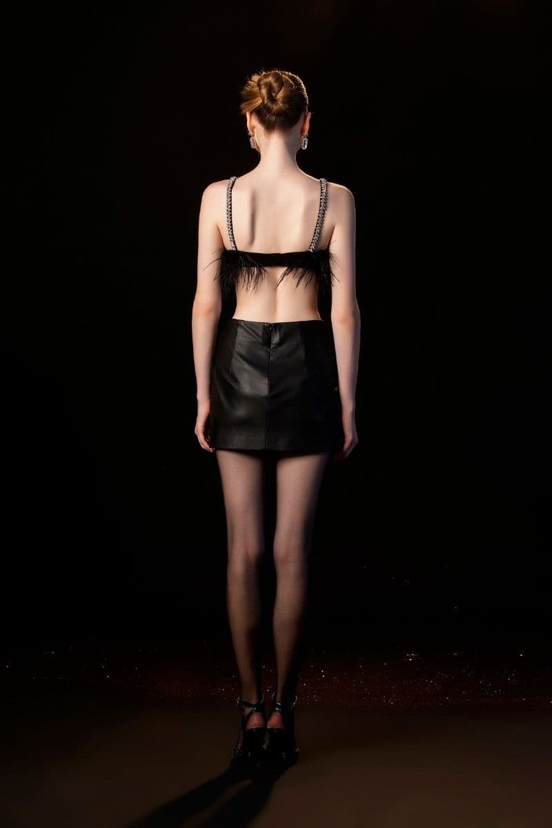 The design features a feathered crop top paired with a short PU leather skirt, exuding youthfulness and modernity. The hand-embellished details add a captivating touch, making this outfit even more appealing.