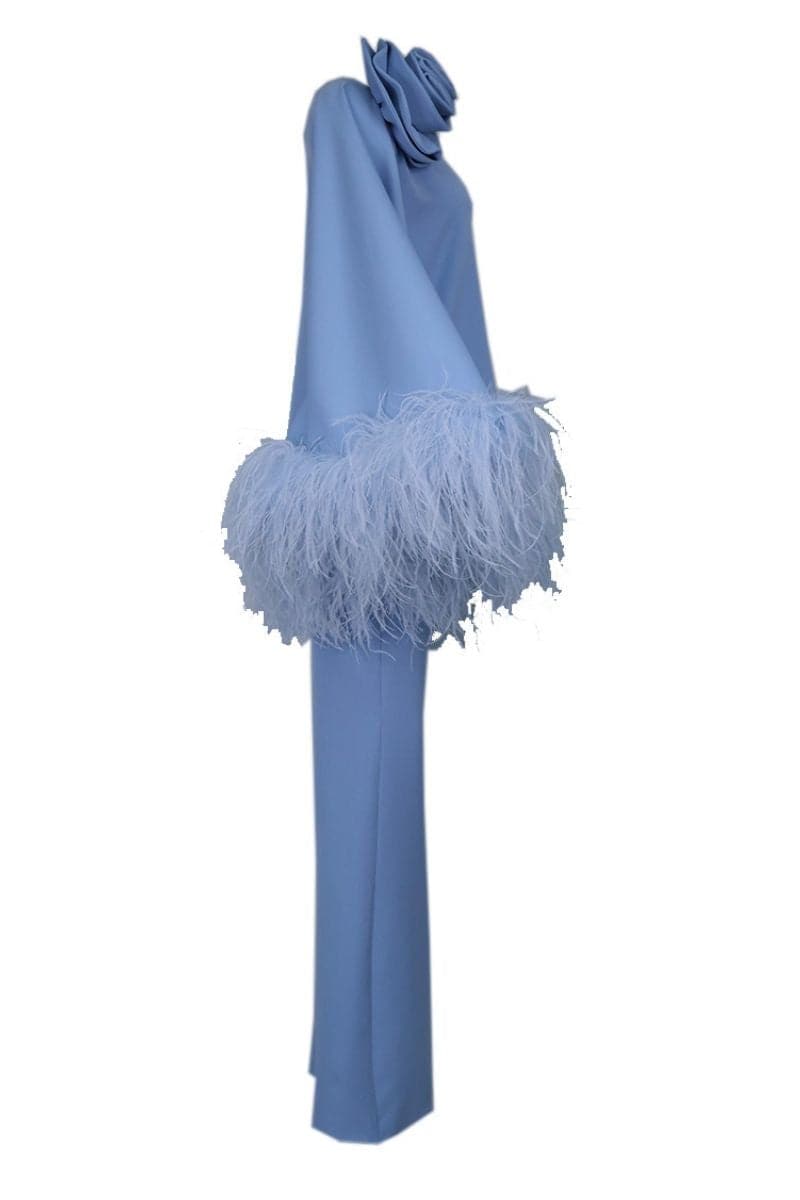 Introducing a chic one-shoulder baby blue top, adorned with a sizable matching fabric flower on the shoulder. The feather detailing all around the top adds an element of sophistication and glamour. Its bell-sleeve design adds an element of sophistication, while maintaining an elegant and easy-to-wear ensemble. Paired with flared cut pants, this set exudes timeless charm. Alternatively, the top can be paired with a variety of options for endless styling possibilities.