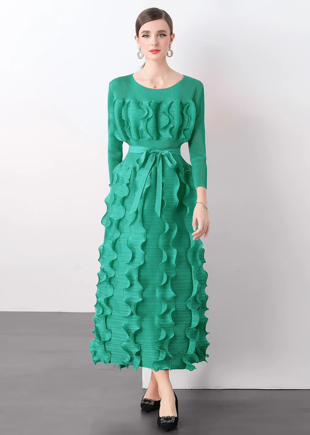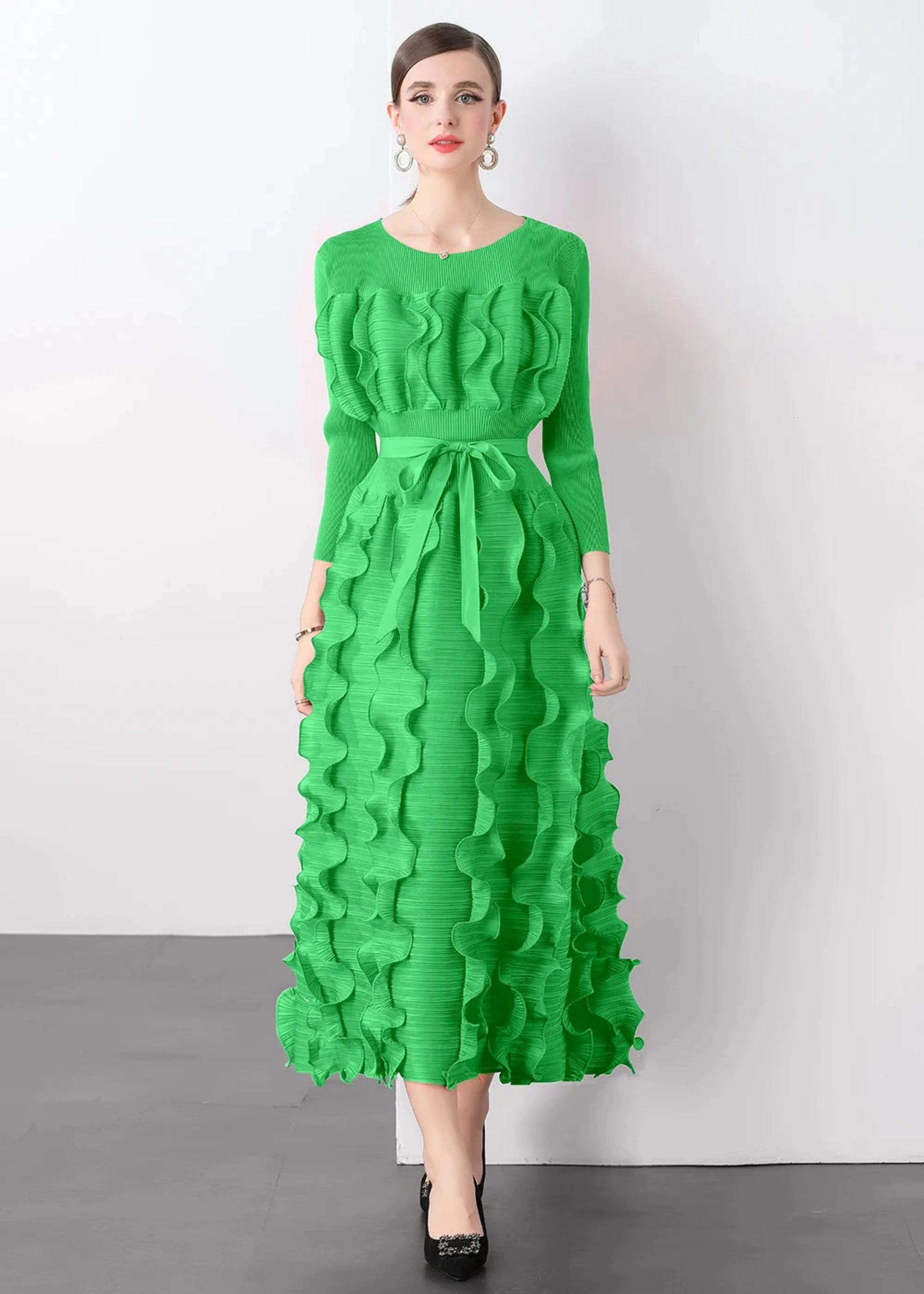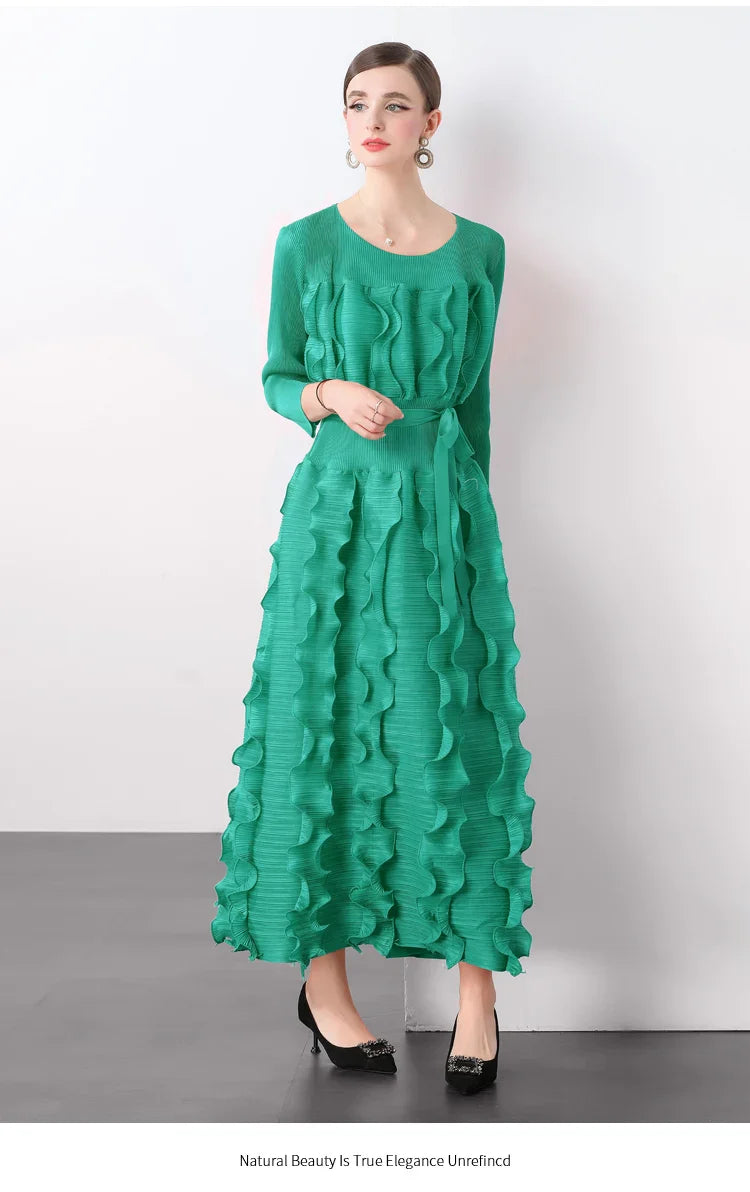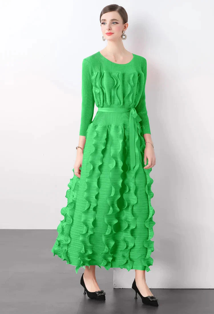 Modest midi dress with a round neckline and full ruffle details. Features a unique pleated texture inspired by Japanese design. Premium stretchy fabric combines luxury with comfort for an elegant, feminine look.