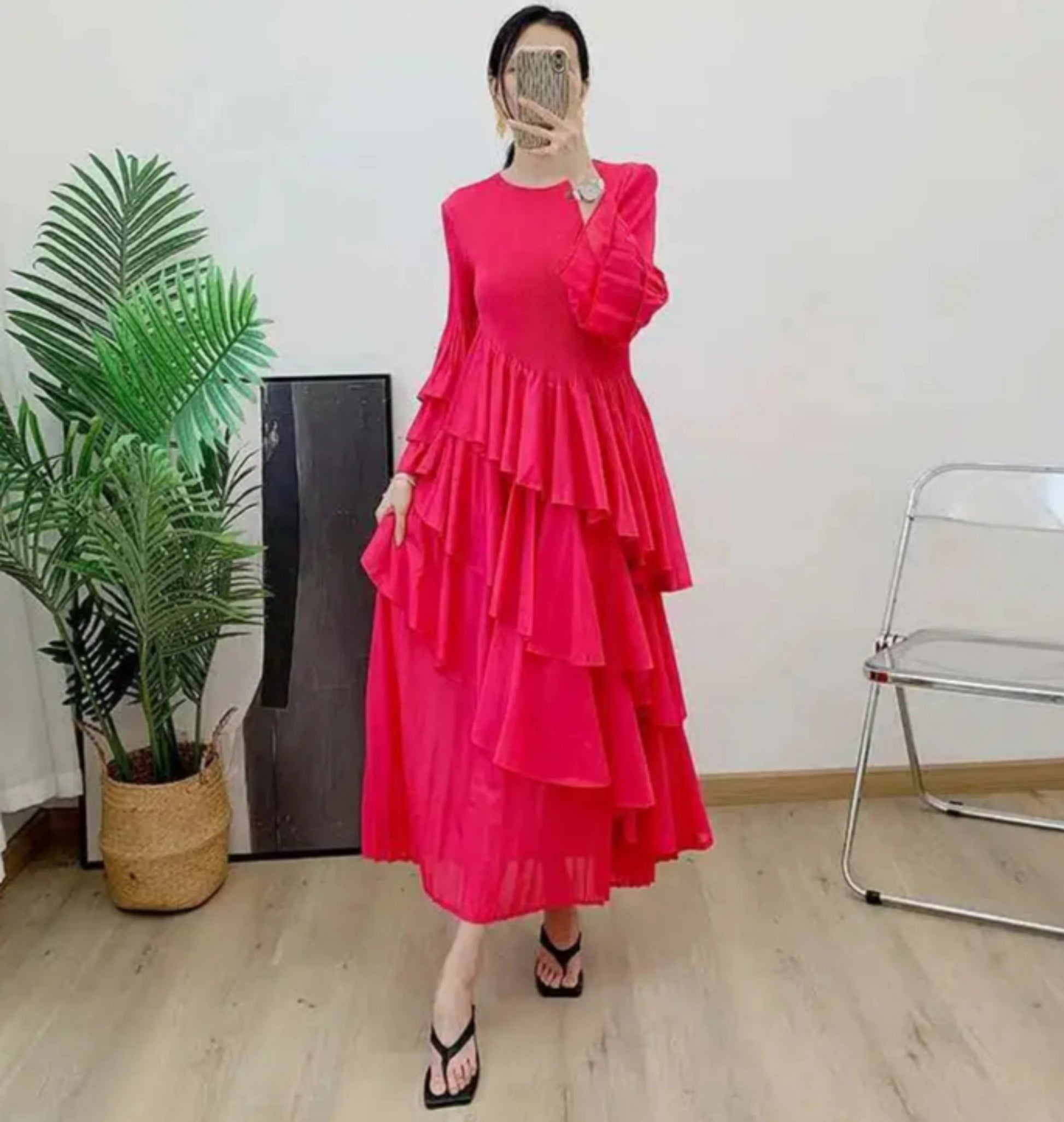 This midi dress blends elegant pleats with an asymmetrical ruffled design, crafted from premium Japanese plissé fabric. The unique silhouette features flowing ruffles that add movement and dimension, while the structured pleats provide a refined shape.