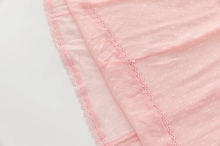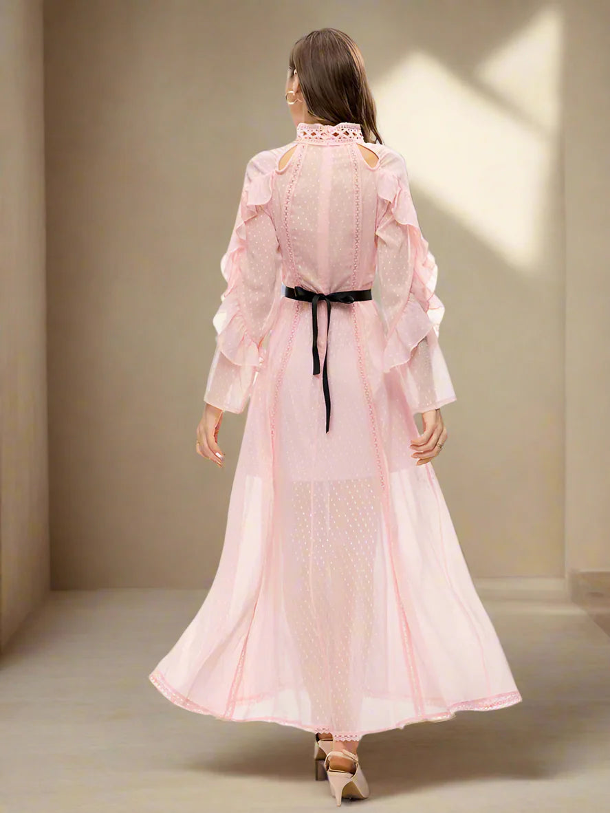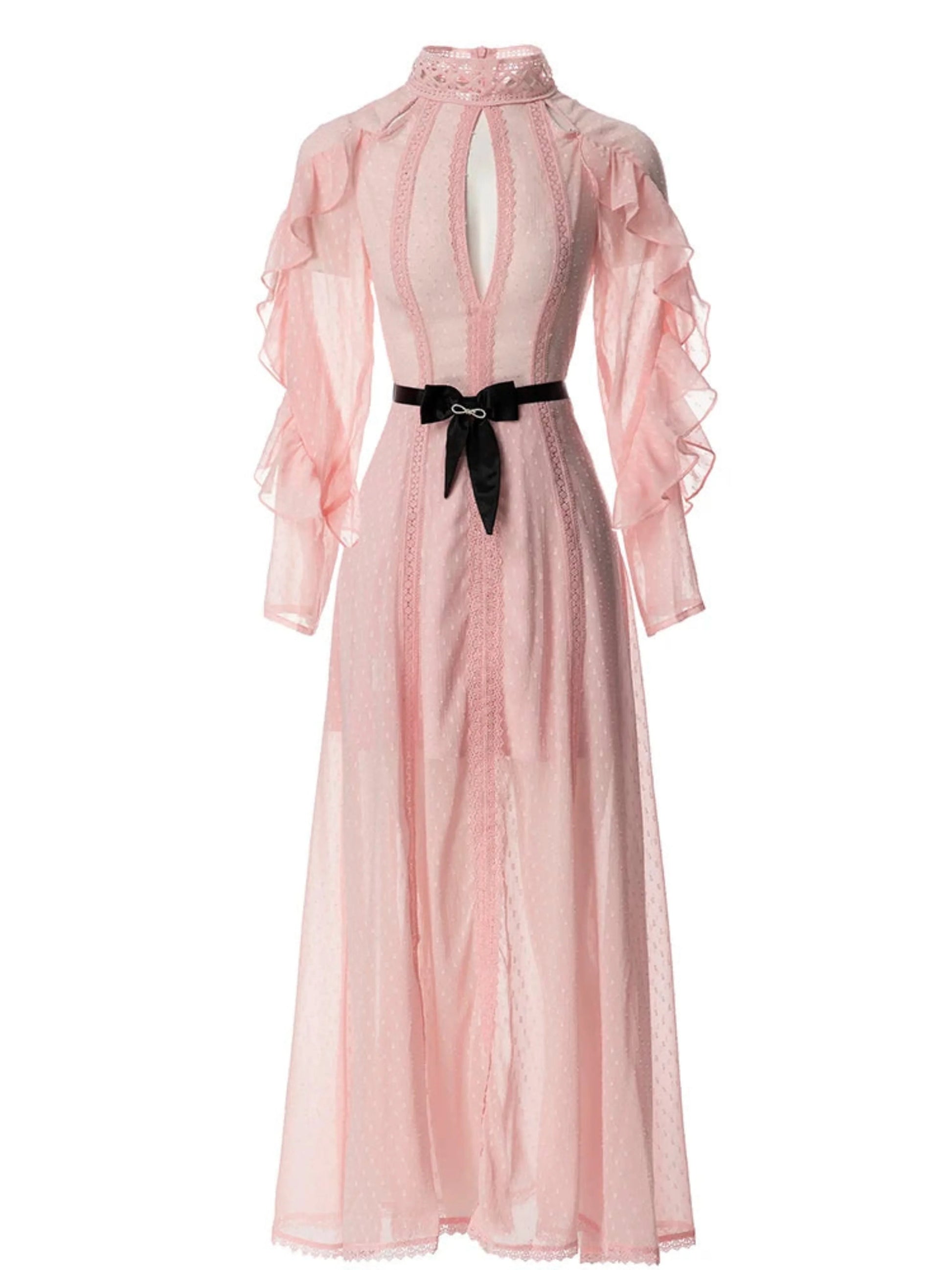 This delicate chiffon midi dress features soft ruffle detailing and a sheer pink hue that enhances its refined, feminine design. With long sleeves and a midi length, the dress is crafted from lightweight chiffon that feels smooth against the skin.