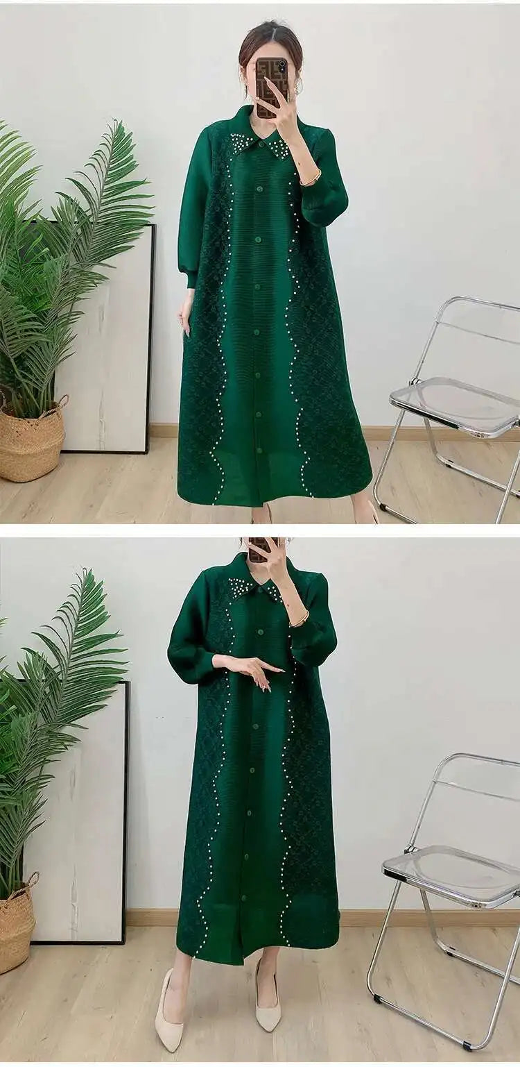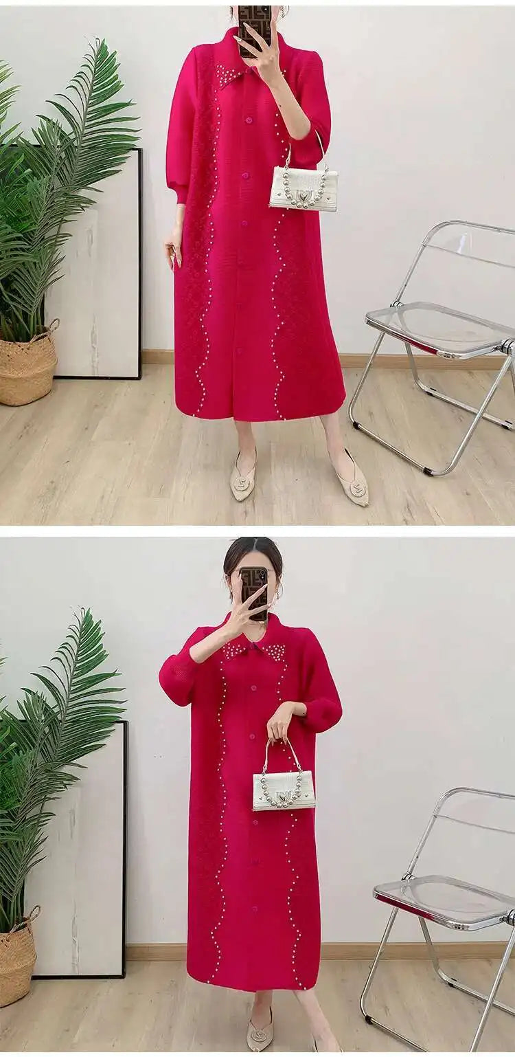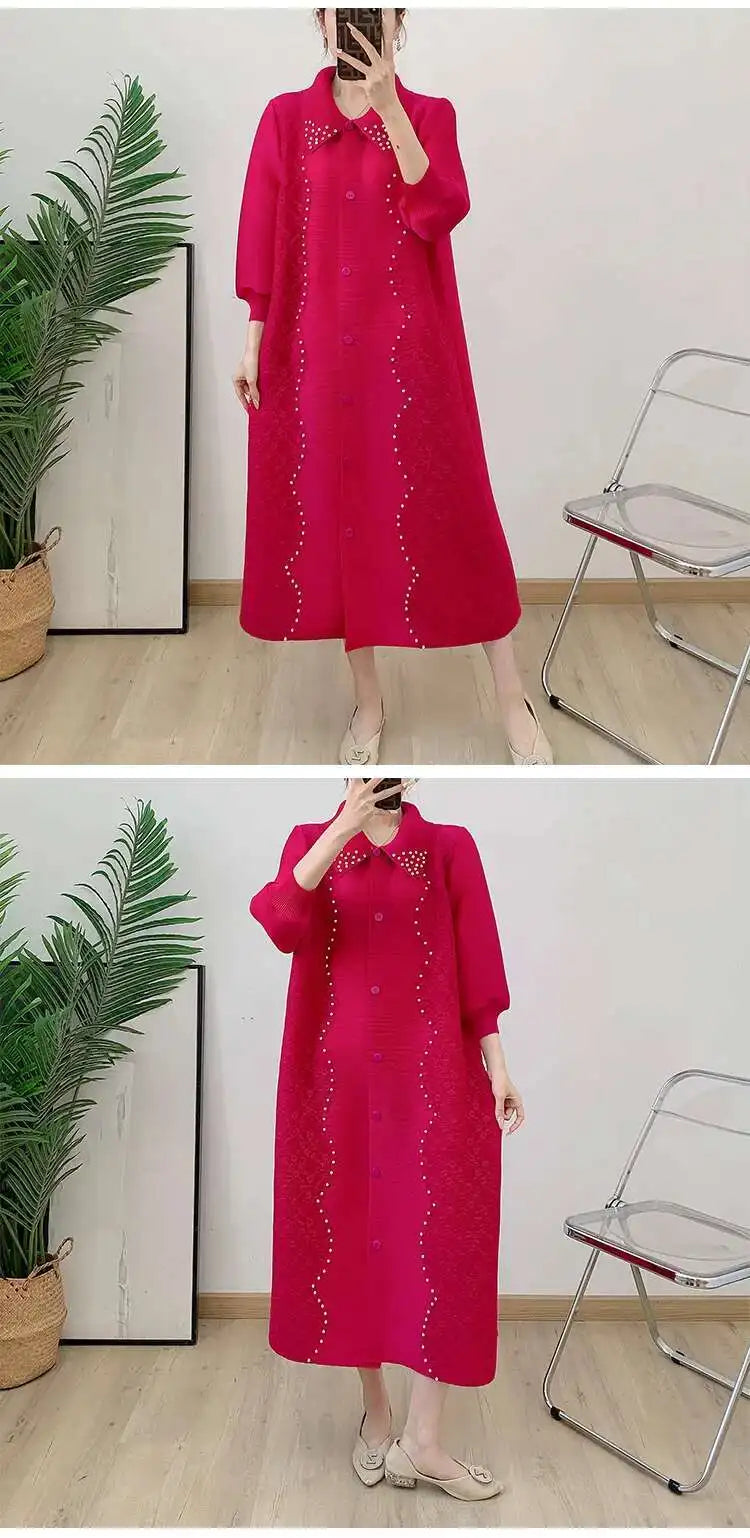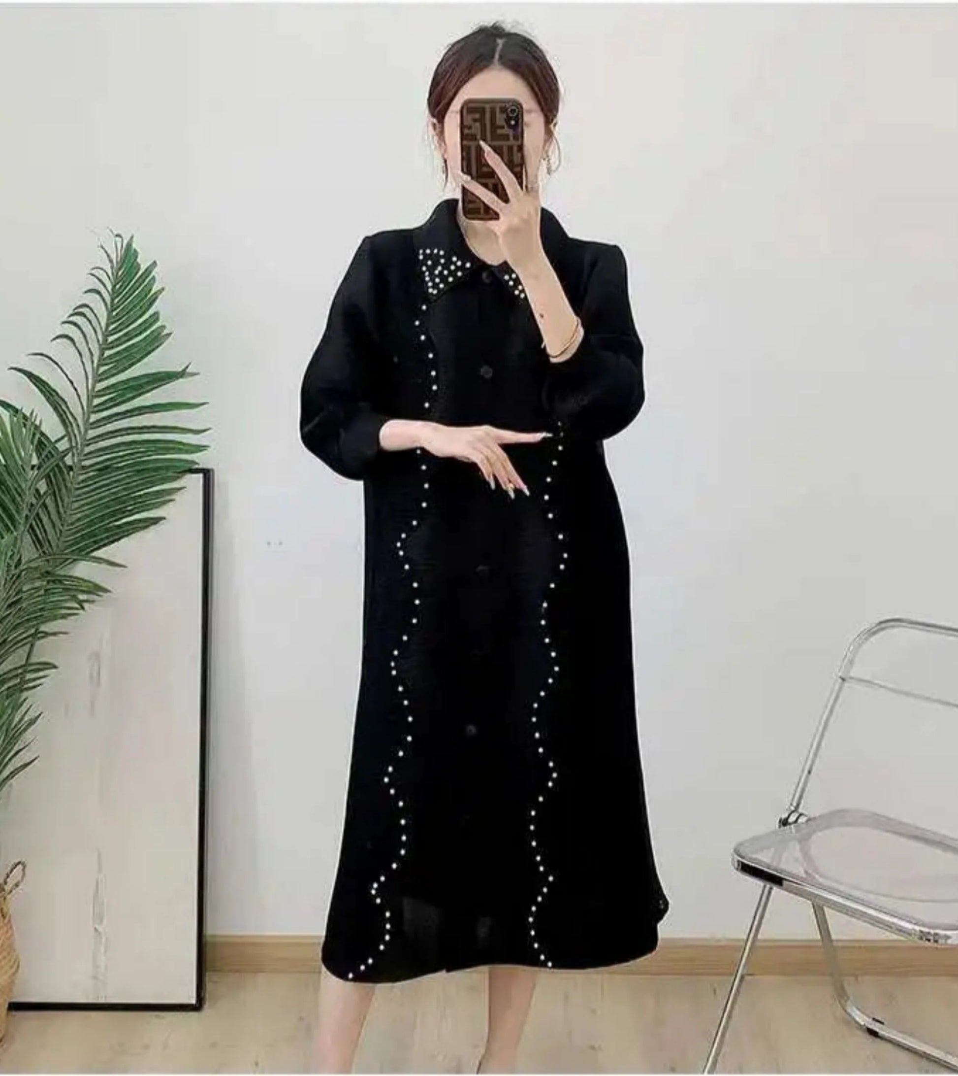 This oversized blouse dress features Japanese pleats crafted with premium fabric and detailed with beaded accents for a luxurious finish.