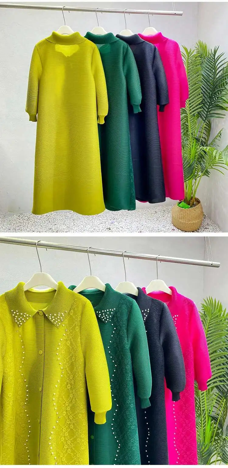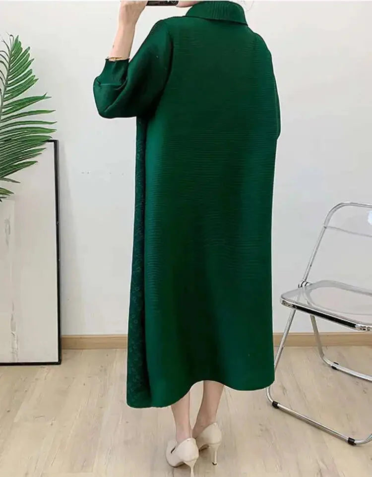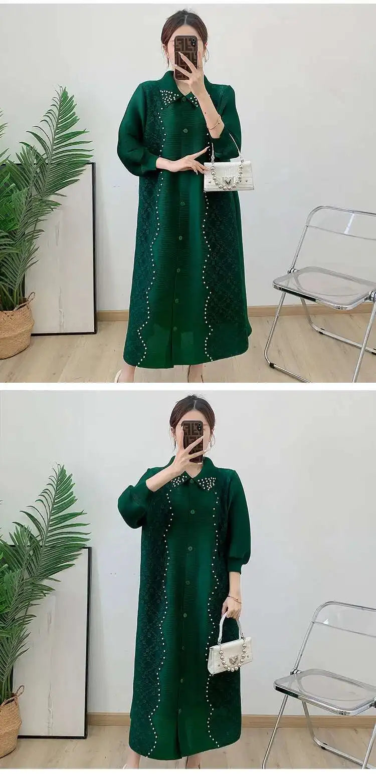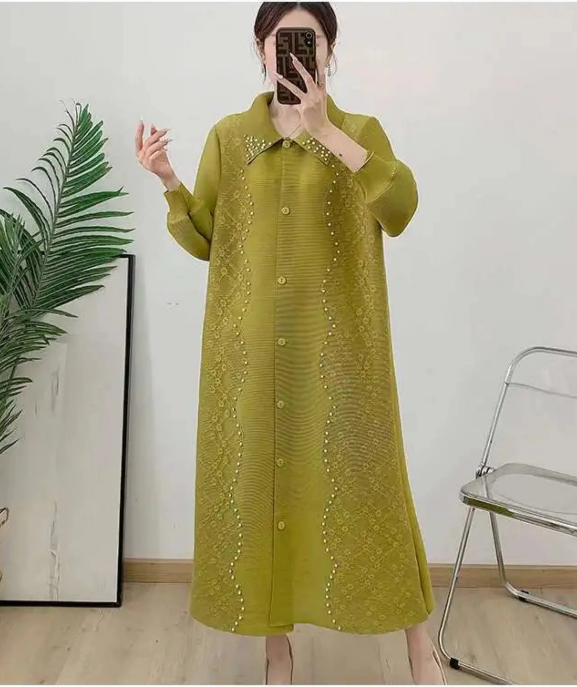 This oversized blouse dress features Japanese pleats crafted with premium fabric and detailed with beaded accents for a luxurious finish.