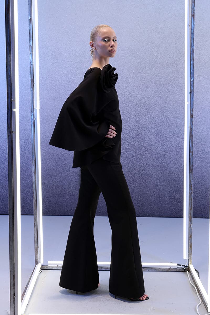 Introducing a chic one-shoulder black top, adorned with a sizable matching fabric flower on the shoulder. Its bell-sleeve design adds an element of sophistication while maintaining an elegant and easy-to-wear ensemble. Paired with flared cut pants, this set exudes timeless charm. Pants comes in size XS,S,M,L,XL,XXL. Alternatively, the top can be paired with a variety of options for endless styling possibilities.
