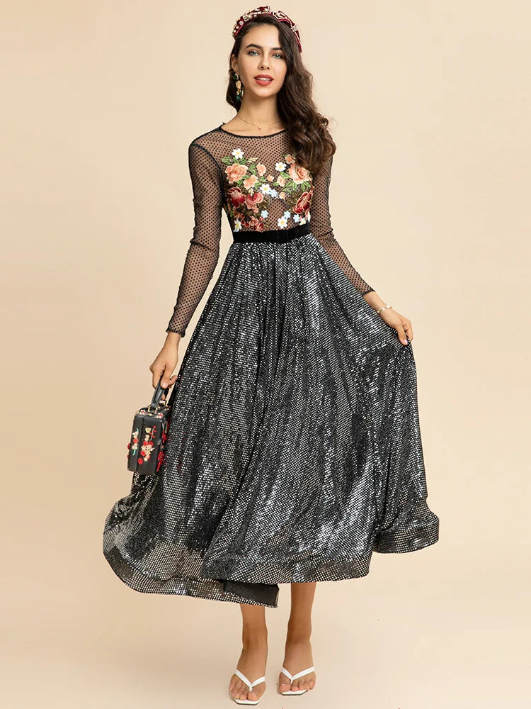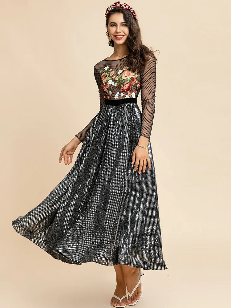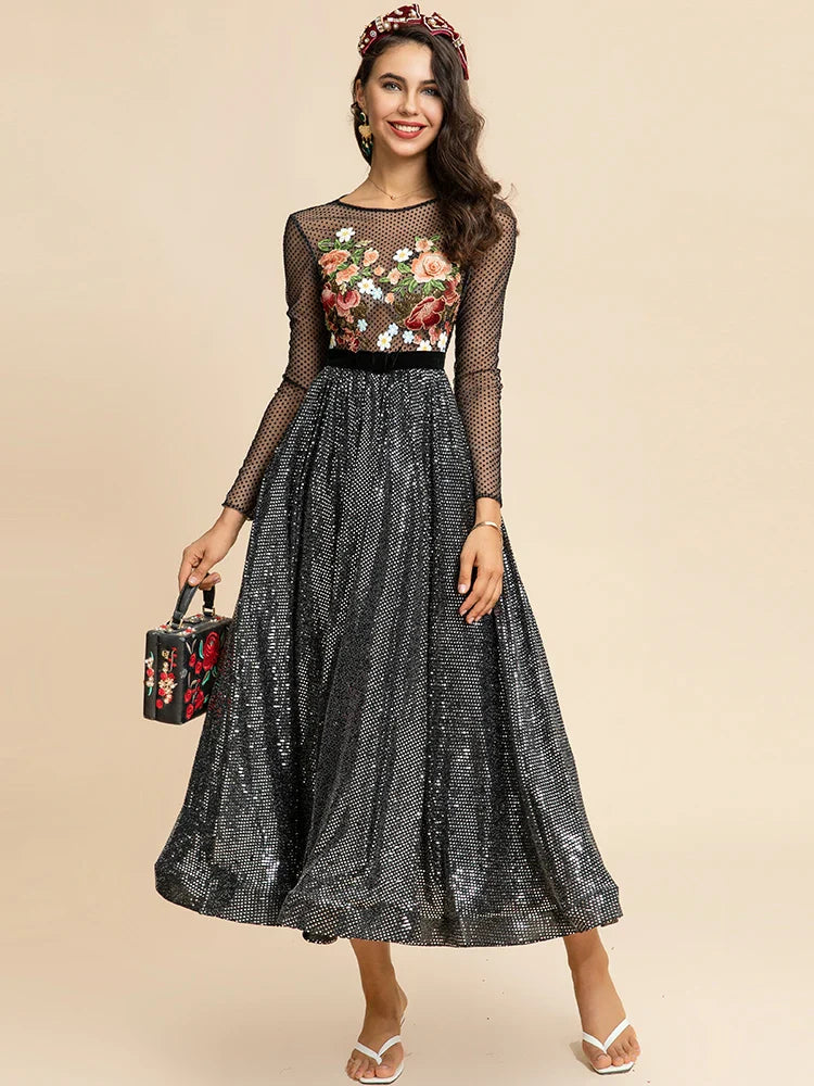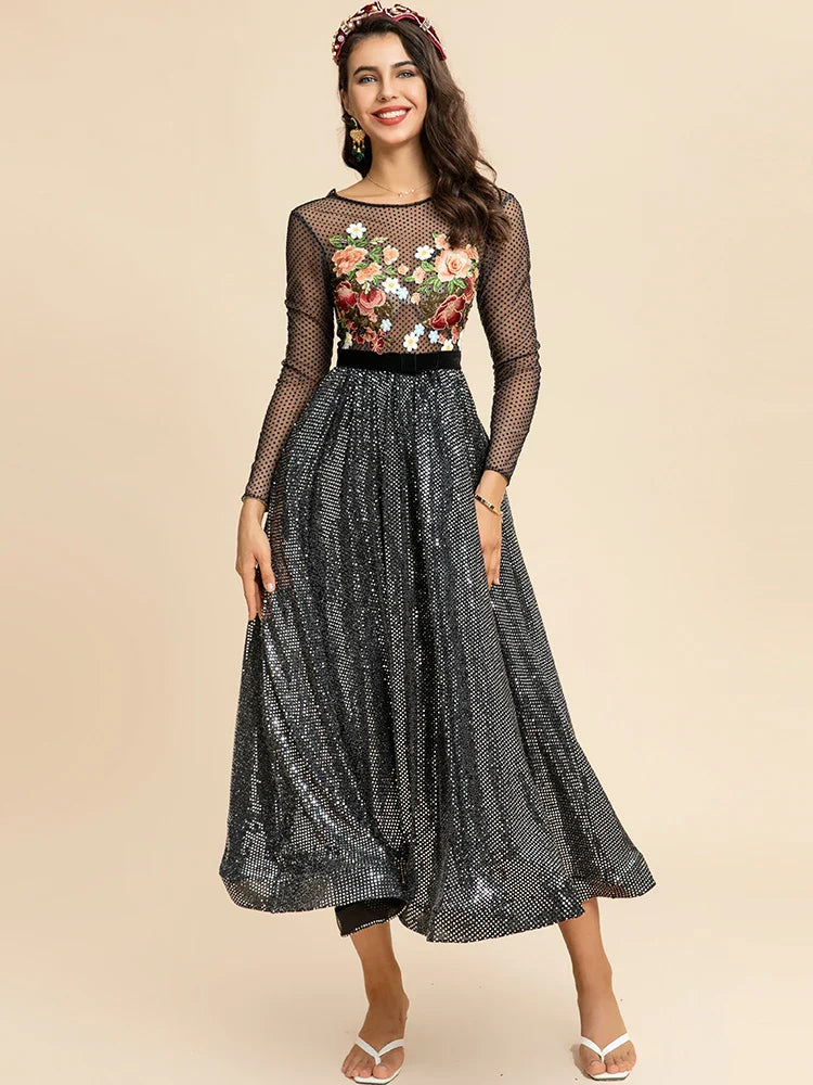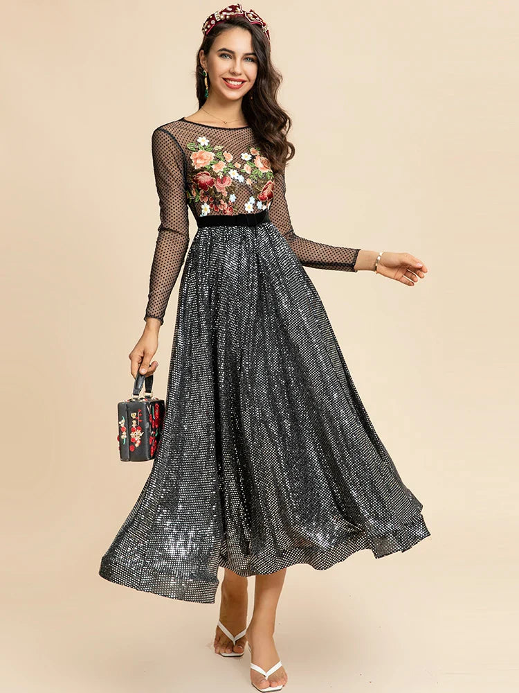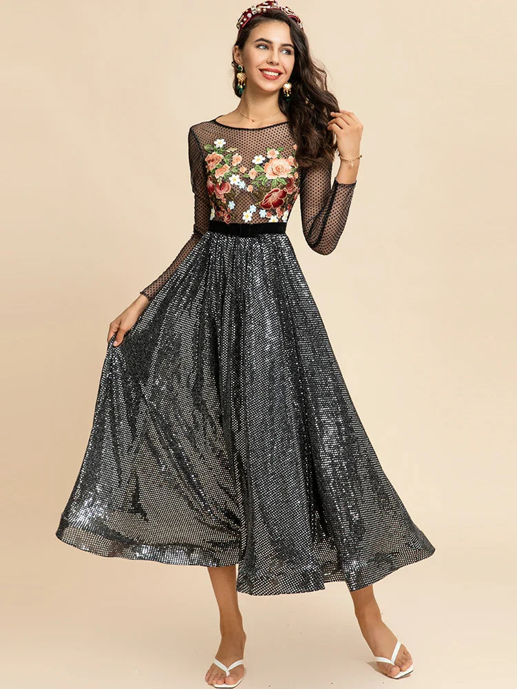 Floral Embroidery Sheer Sleeve Sequin Dress