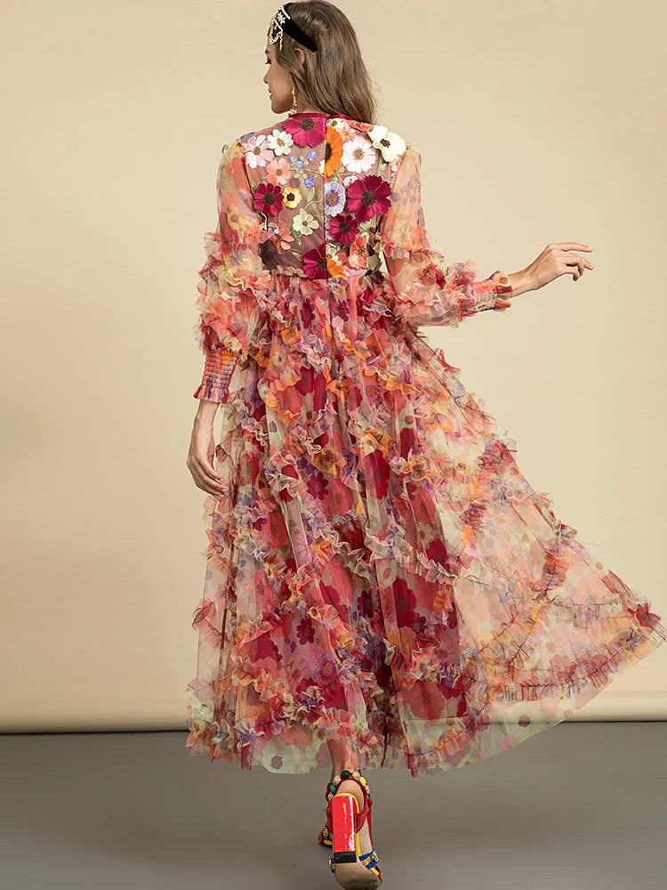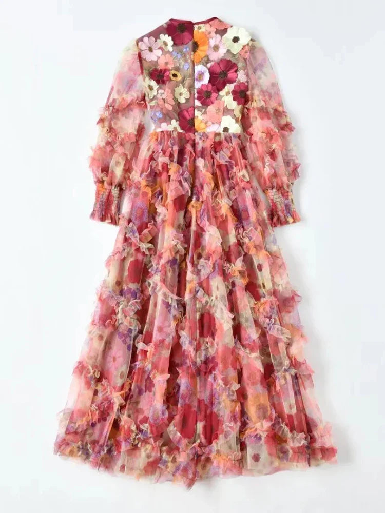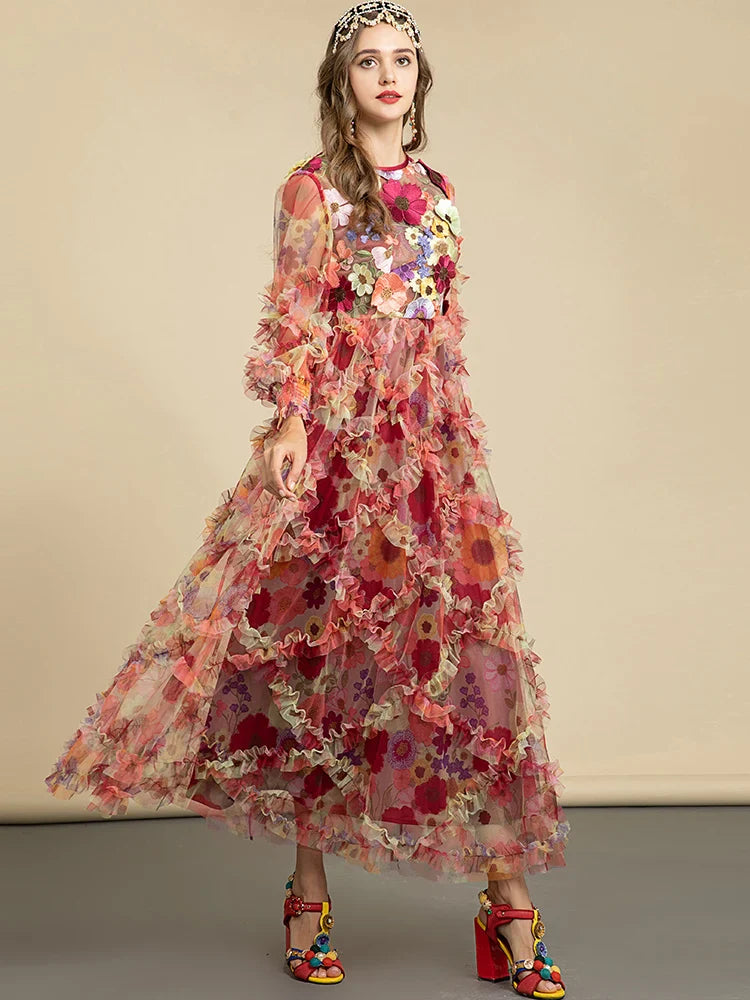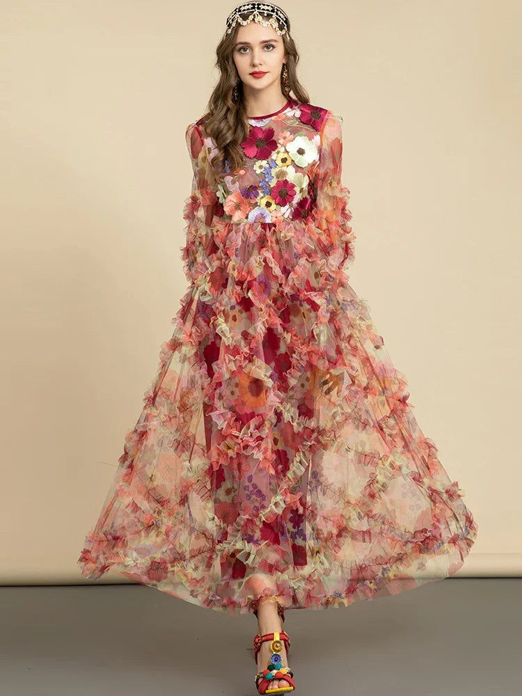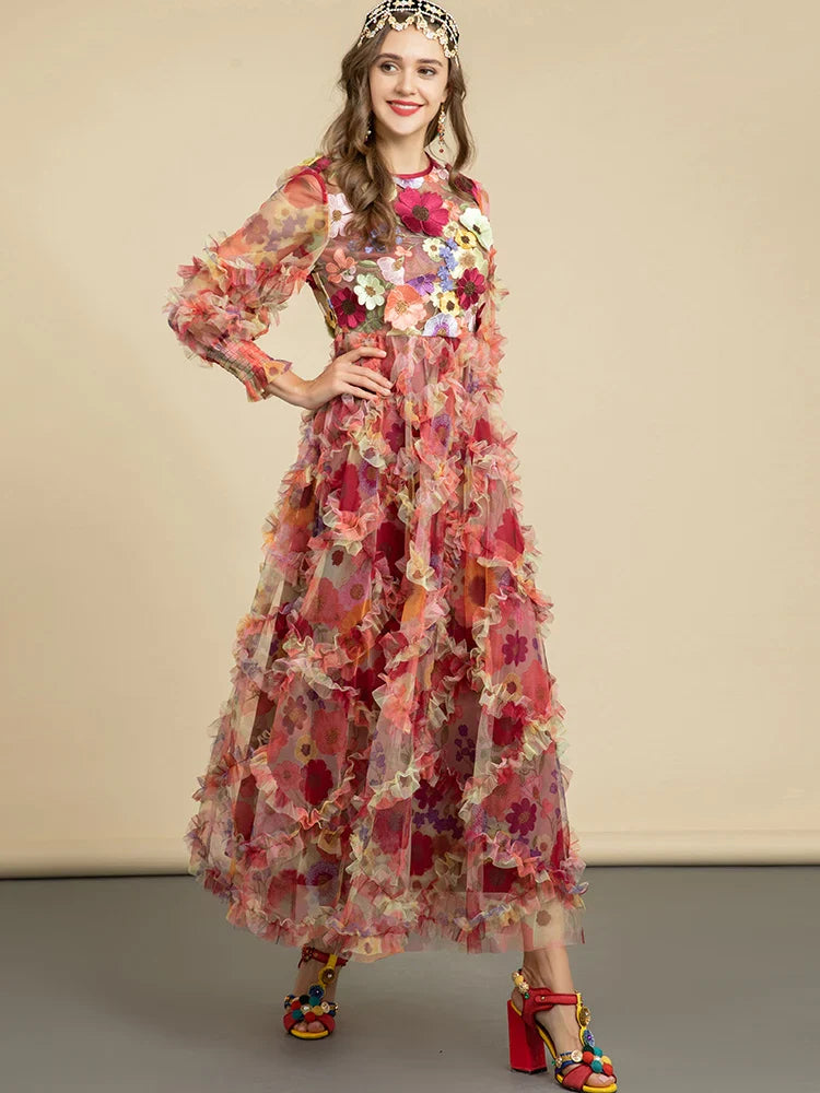 A graceful choice for weddings, formal occasions, or special evenings out. Designed with delicate 3D floral embellishments, cascading ruffles, and sheer long sleeves for timeless sophistication.