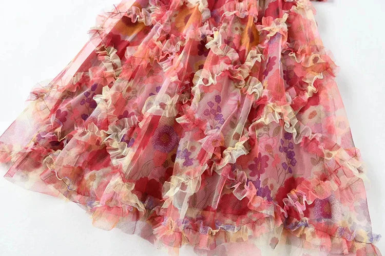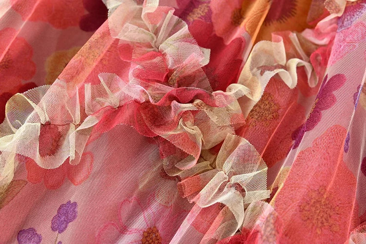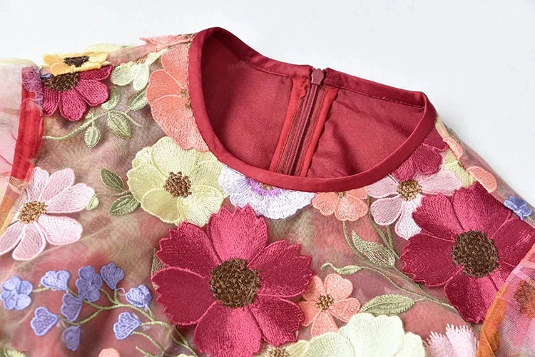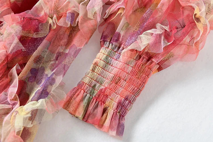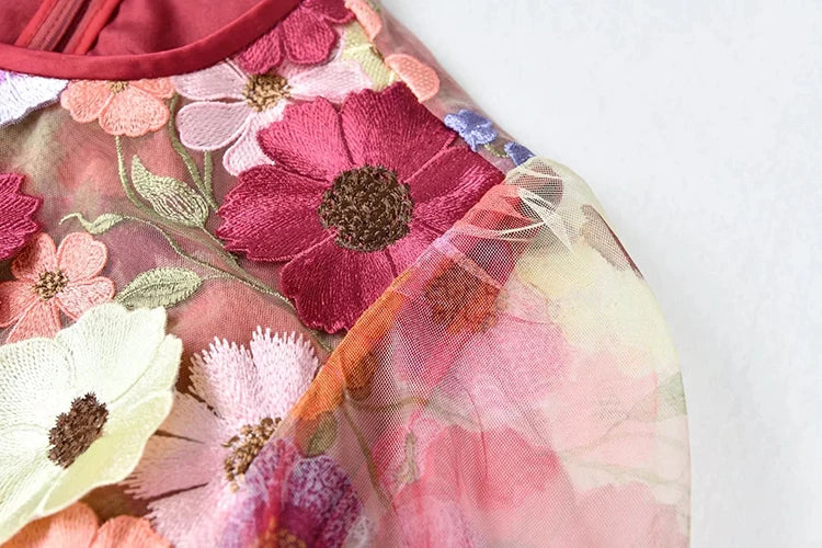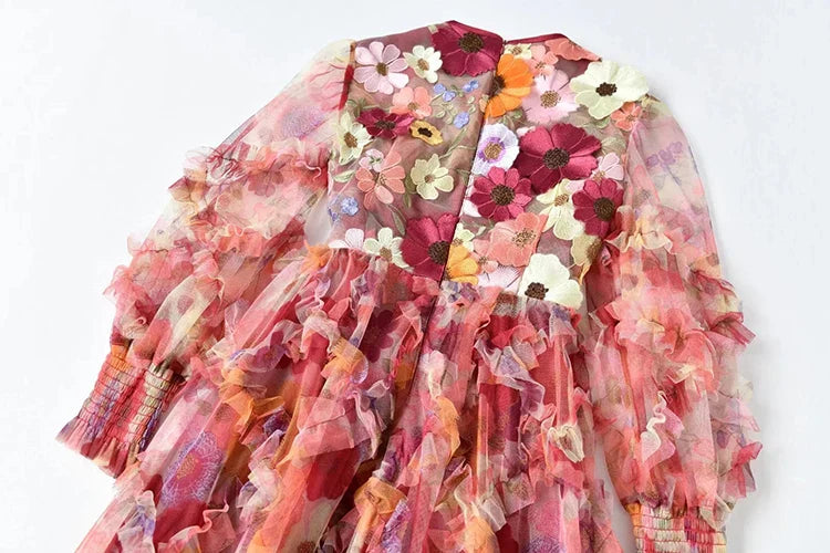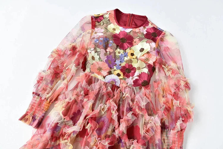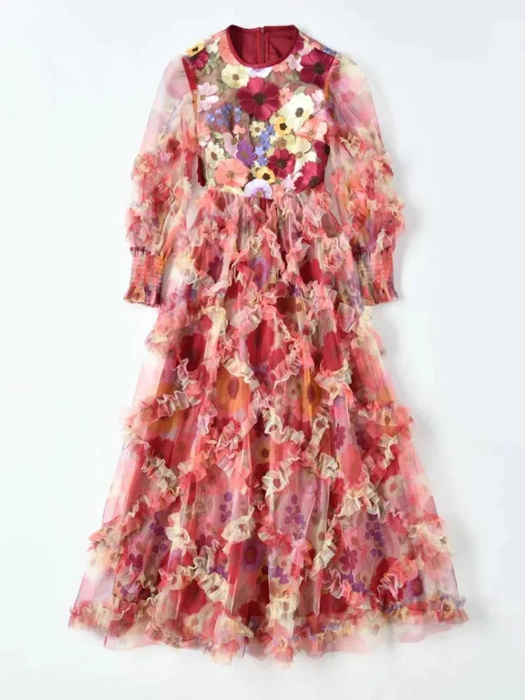 A graceful choice for weddings, formal occasions, or special evenings out. Designed with delicate 3D floral embellishments, cascading ruffles, and sheer long sleeves for timeless sophistication.