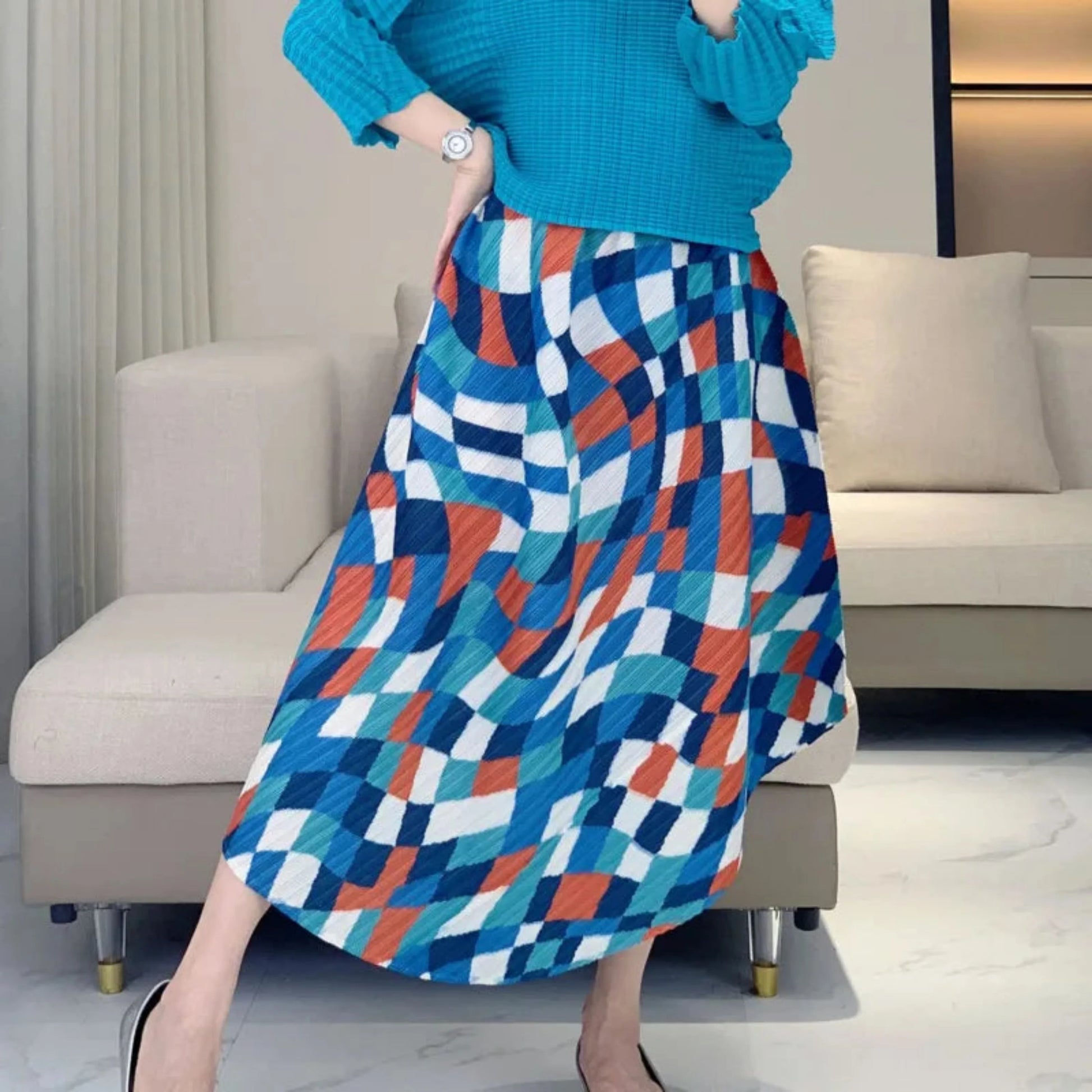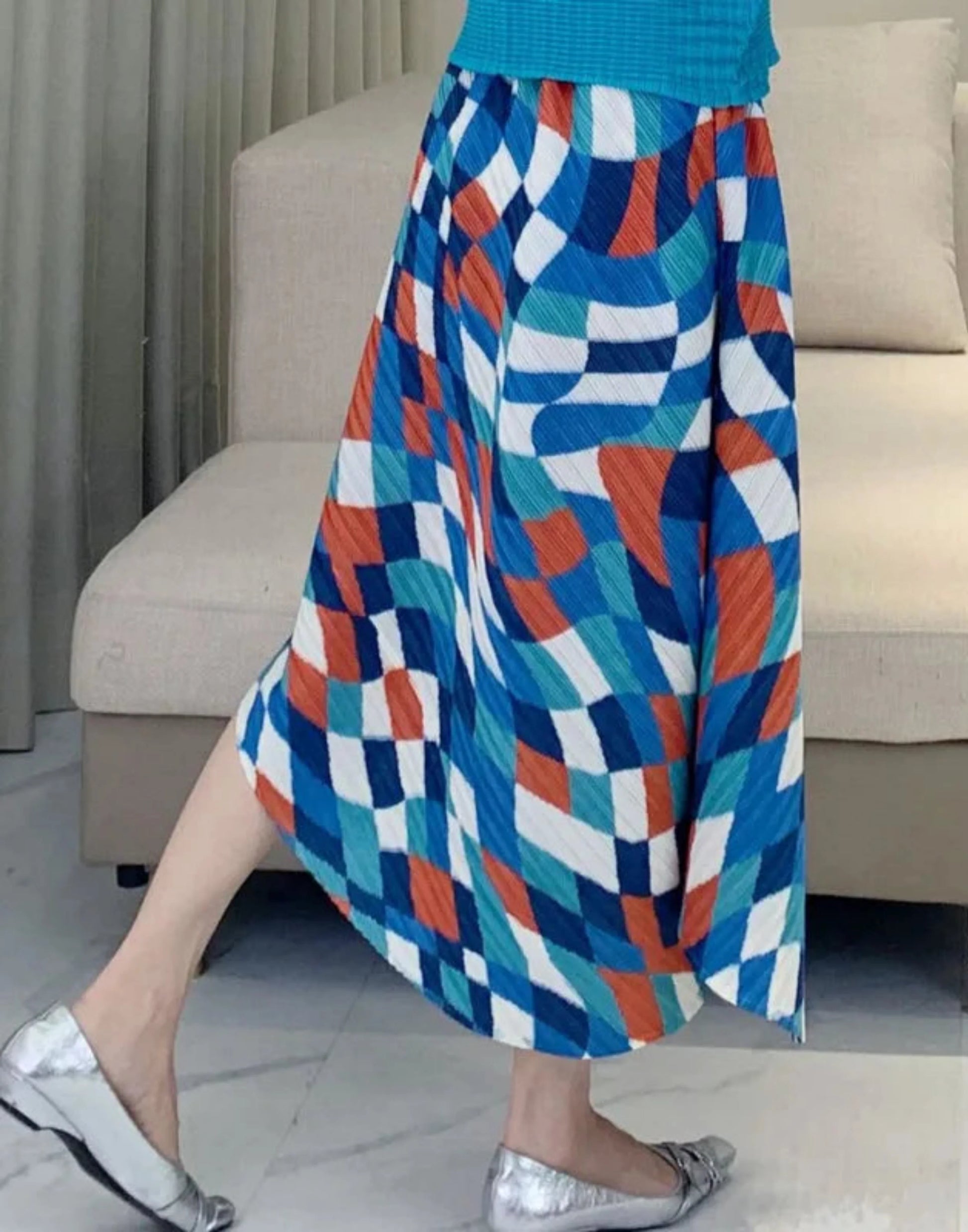 Luxury midi skirt with a unique avant-garde geometric design, made from wrinkle-resistant Japanese pleats. Features a pull-on style with a stretchy elastic waistband.