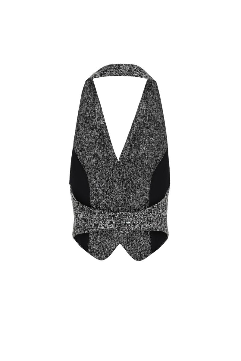 Made from fine tweed fabric, this elegant two-piece set features a halter neckline and a back slit detail for a sophisticated touch. With the skirt's floor-length design, it exudes the exclusivity and refinement of a high-end fashion piece.