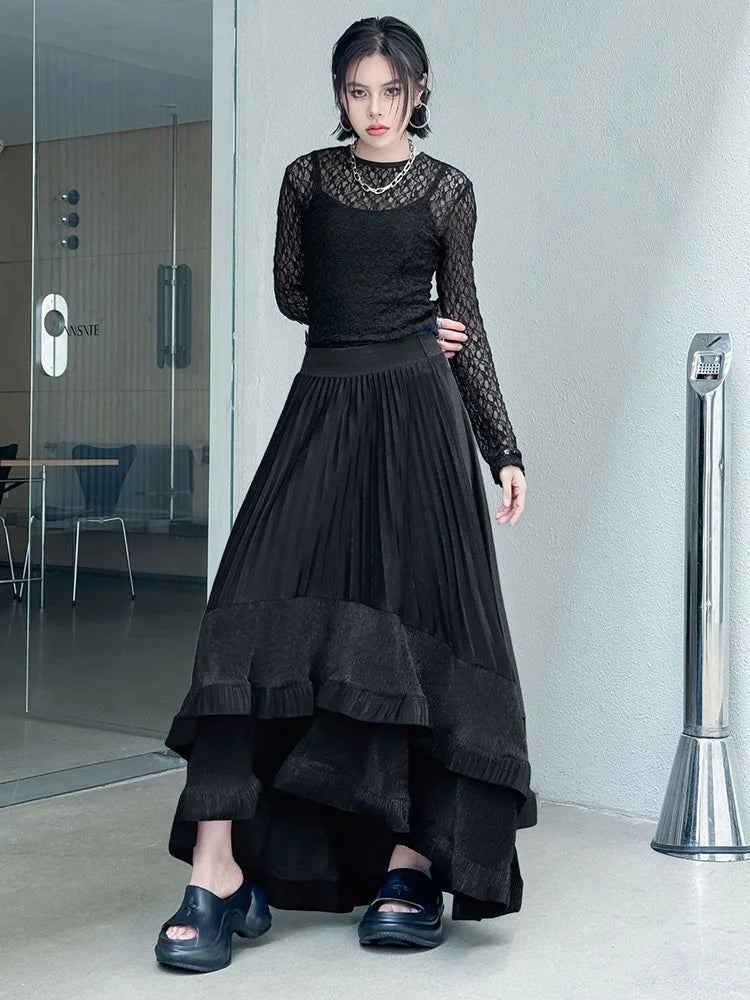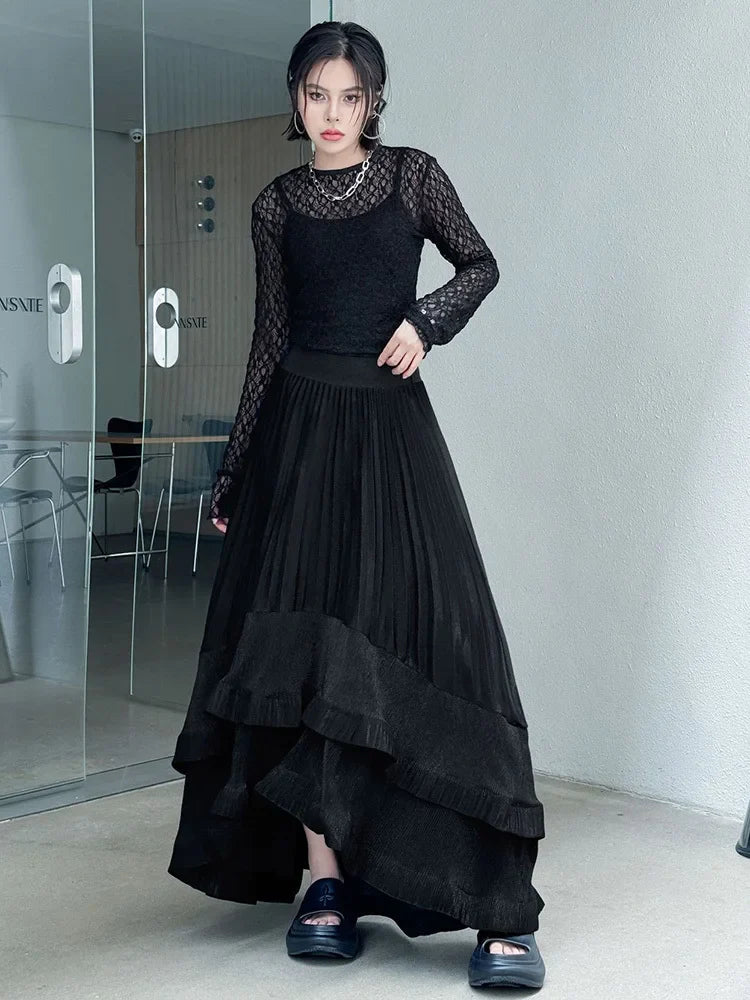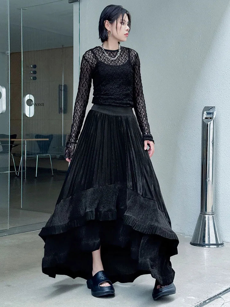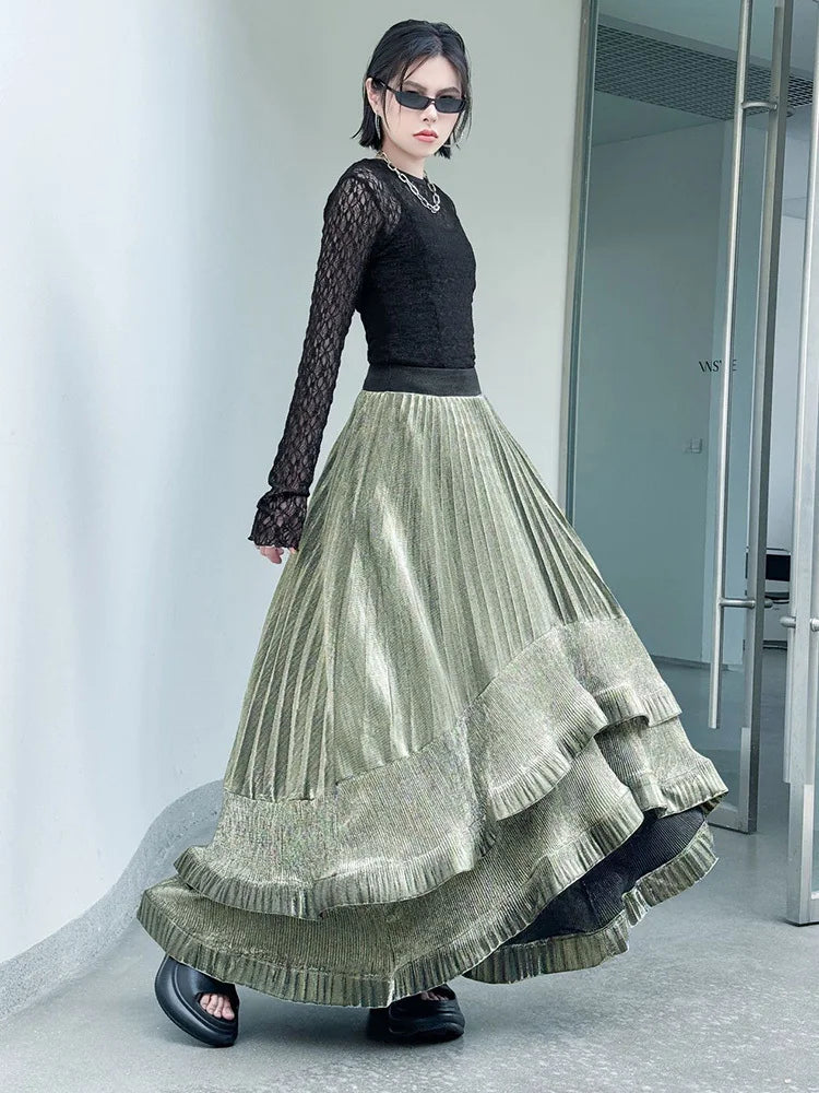 This striking maxi skirt features asymmetric pleats in a luxe metallic finish. Designed with a pull-on elastic waistband for comfort and ease, it blends avant-garde style with long, flowing elegance. Perfect for making a bold statement at any event.