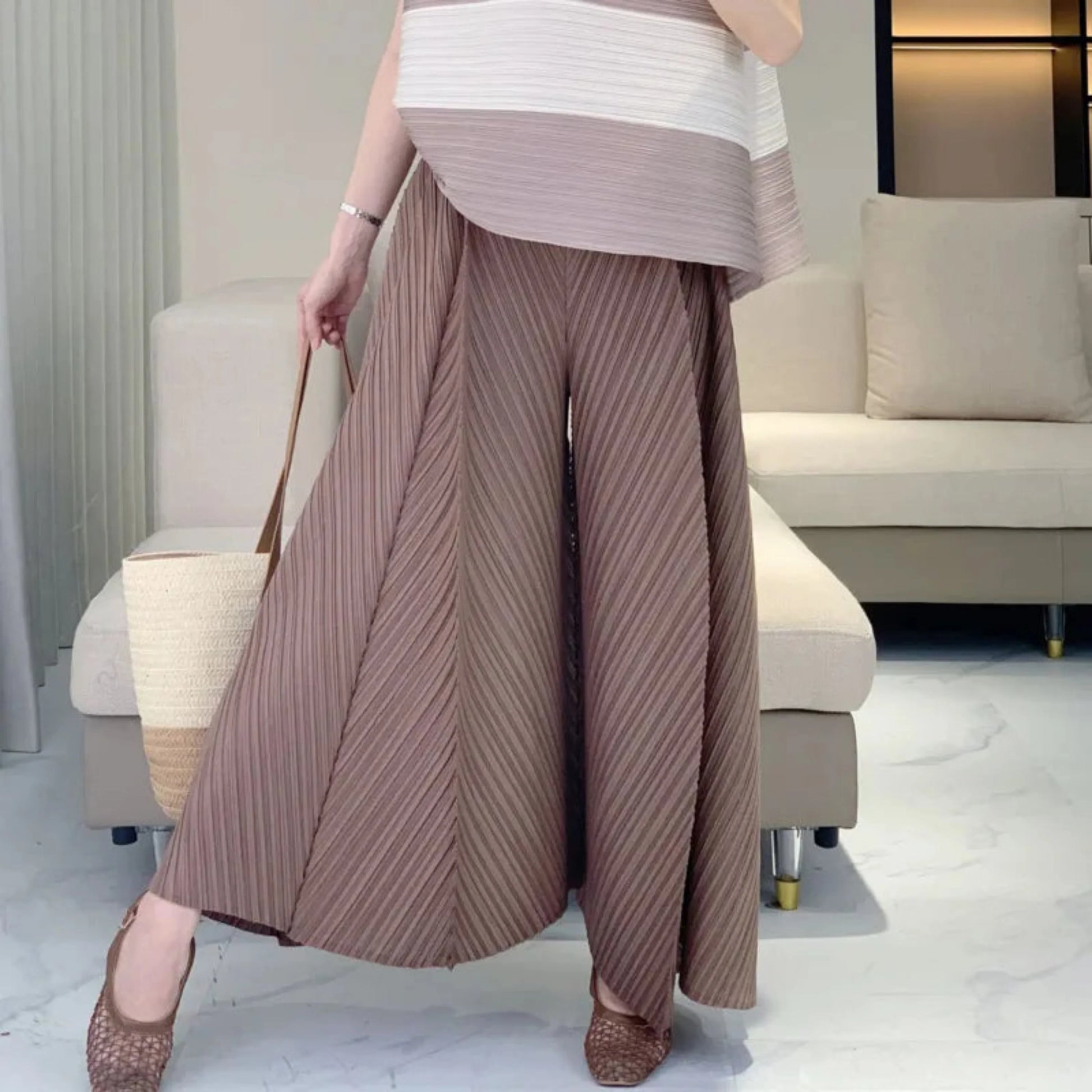 High-waisted, wide-leg pants featuring authentic Japanese pleats. Pull-on style with elastic waistband for a flawless fit.