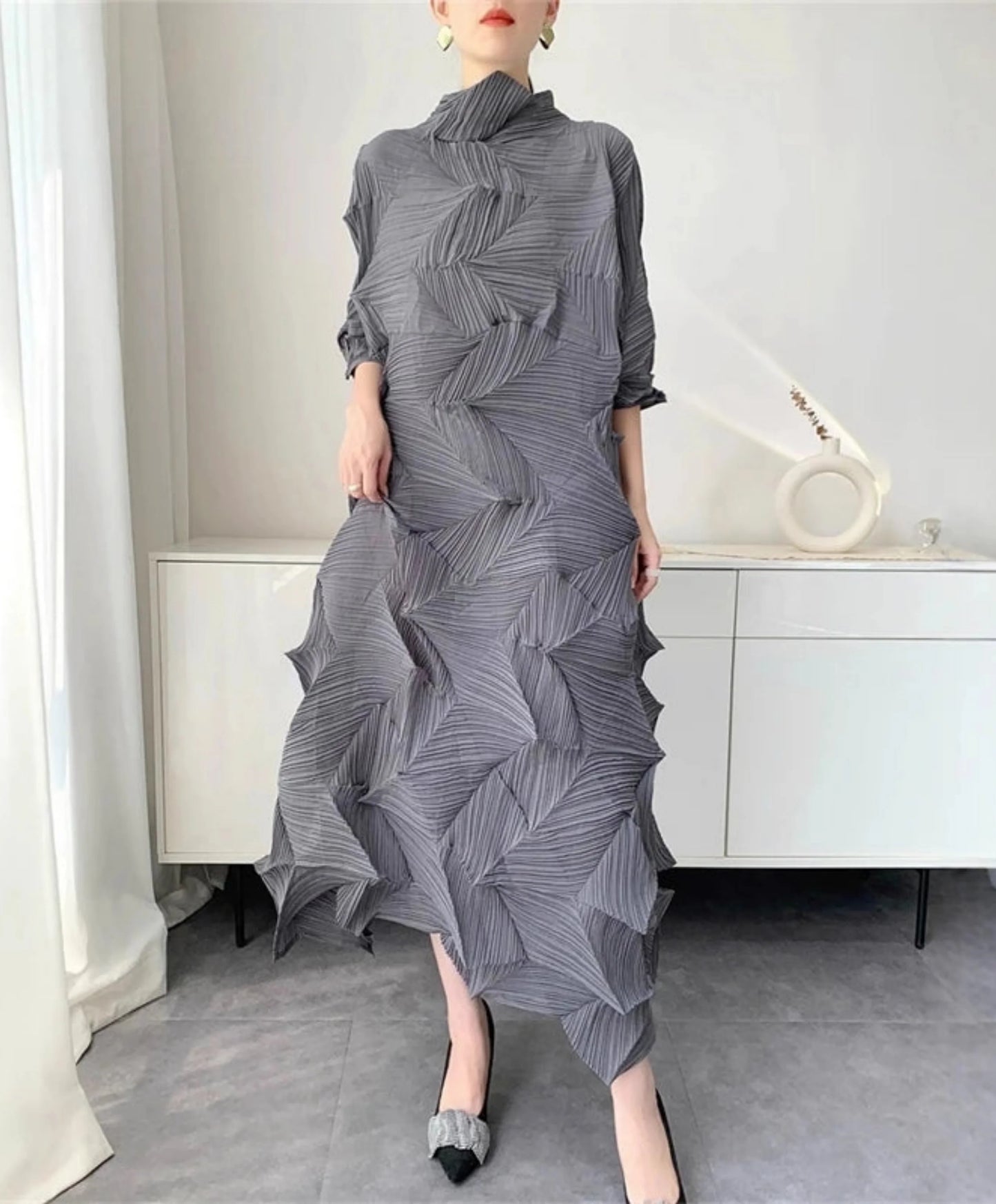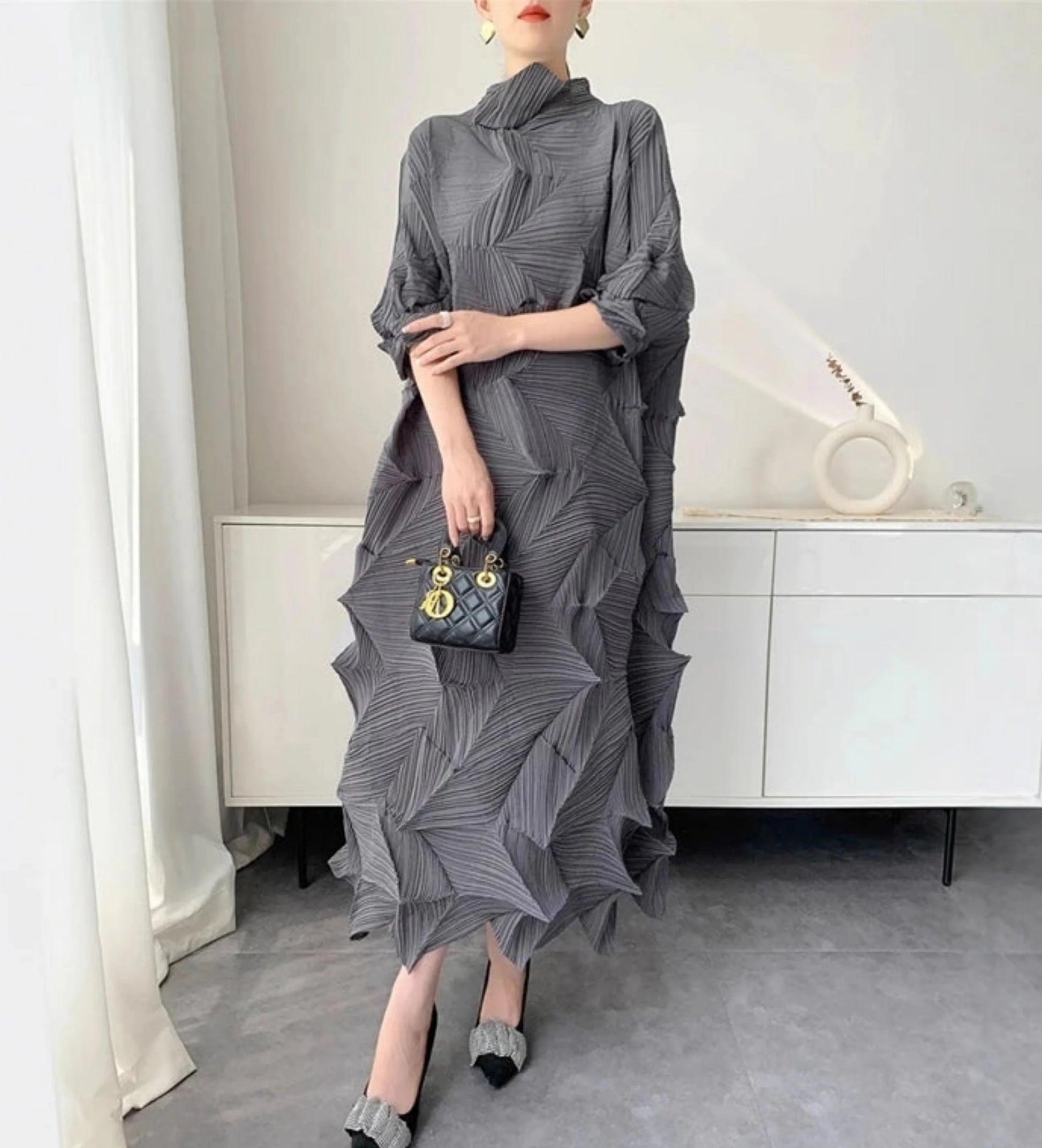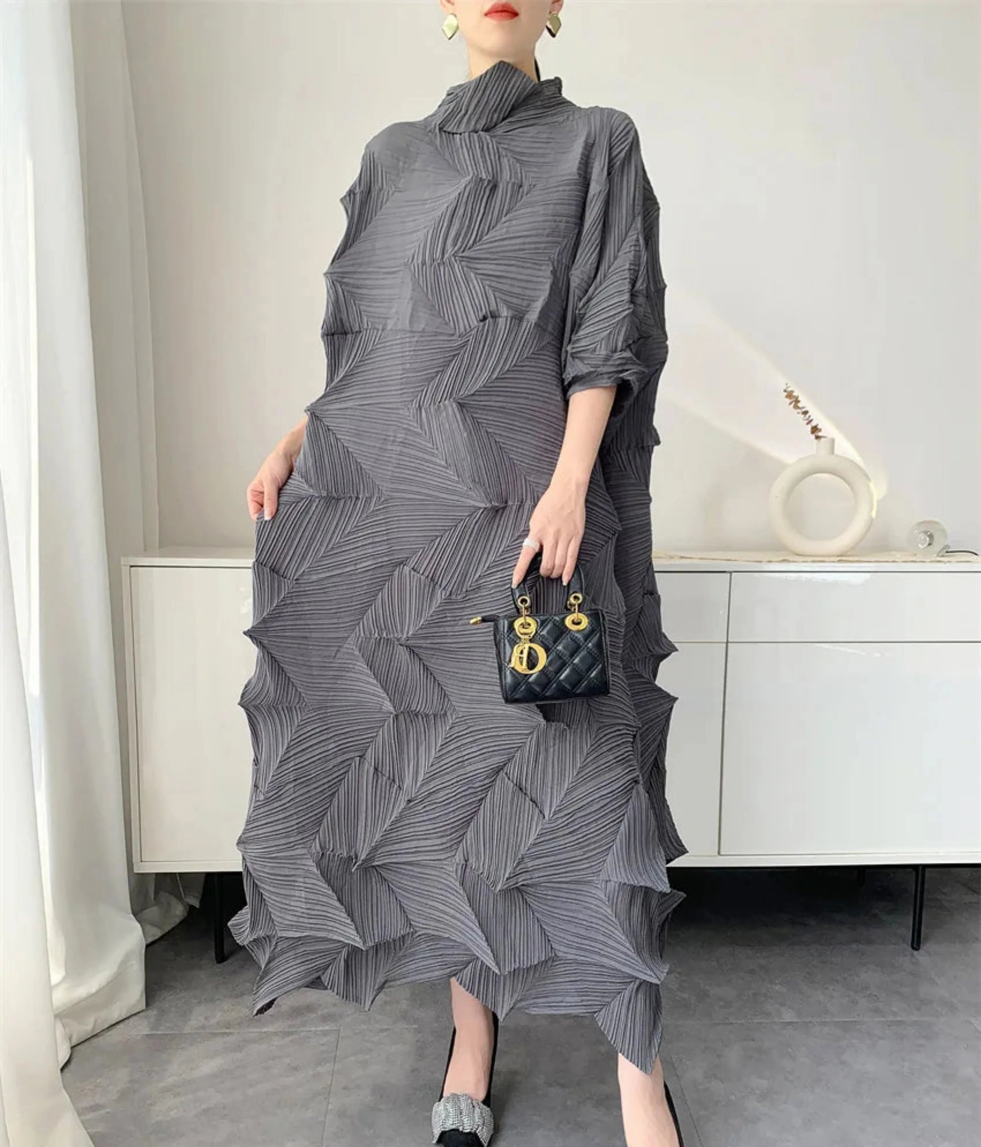 This Japanese pleated midi dress combines luxury with comfort. Featuring 3/4 sleeves and an oversized fit, the diamond-textured fabric adds subtle elegance and visual interest.