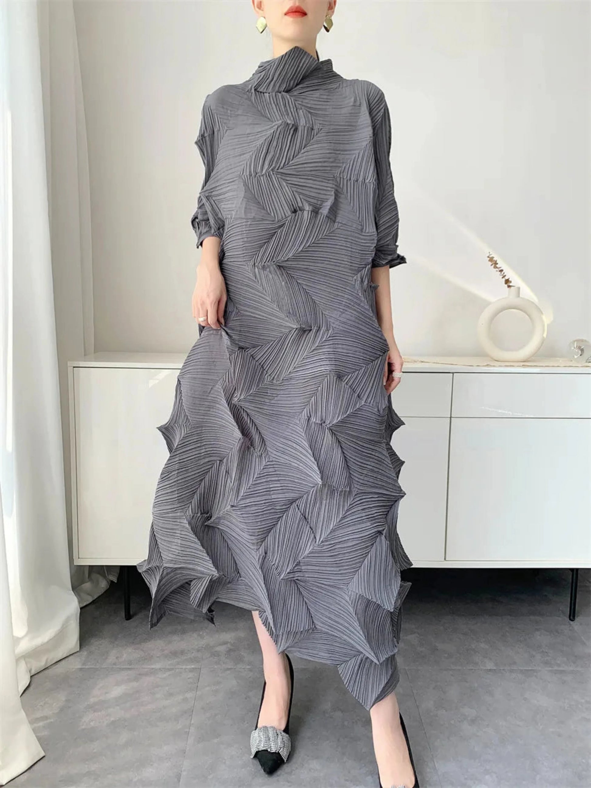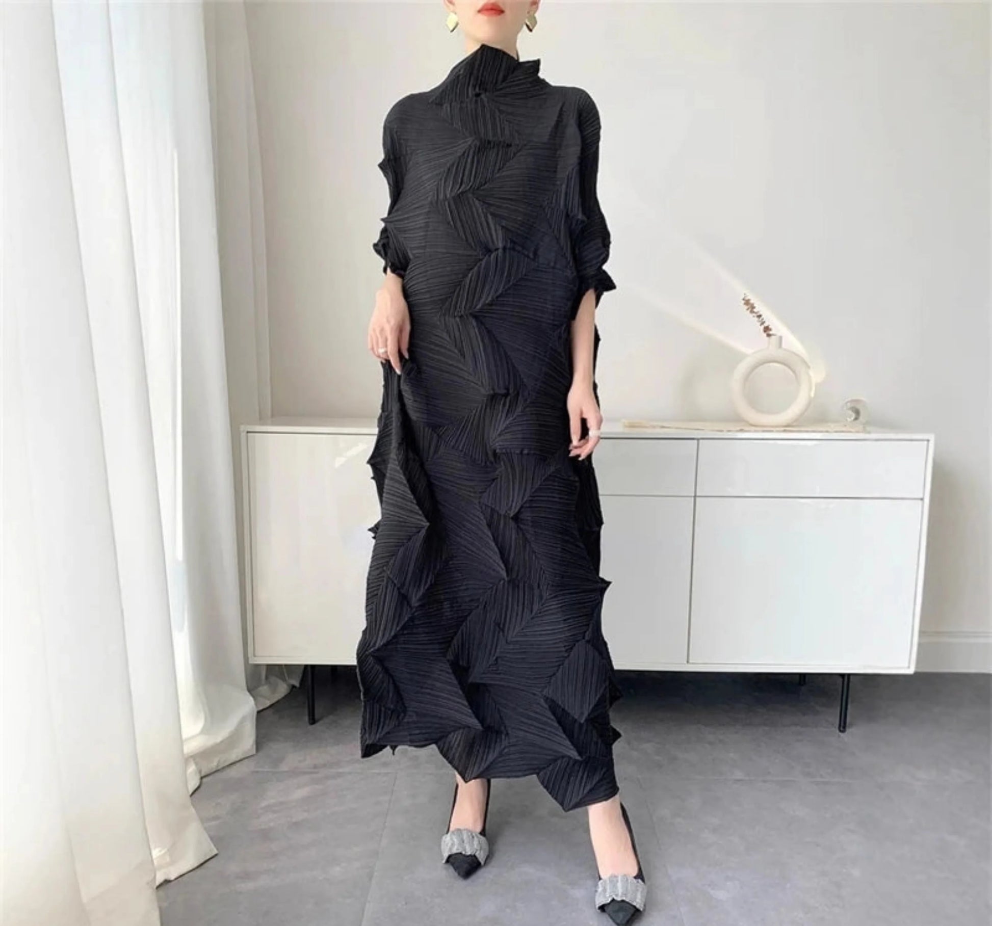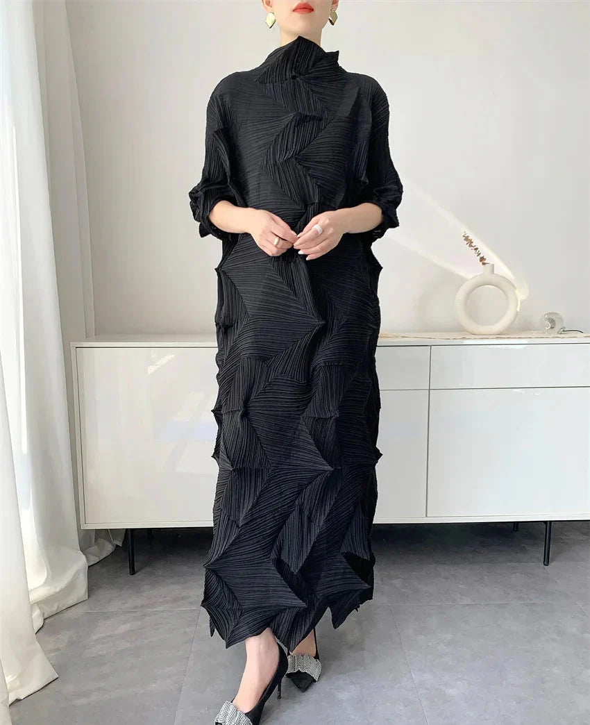 This Japanese pleated midi dress combines luxury with comfort. Featuring 3/4 sleeves and an oversized fit, the diamond-textured fabric adds subtle elegance and visual interest.
