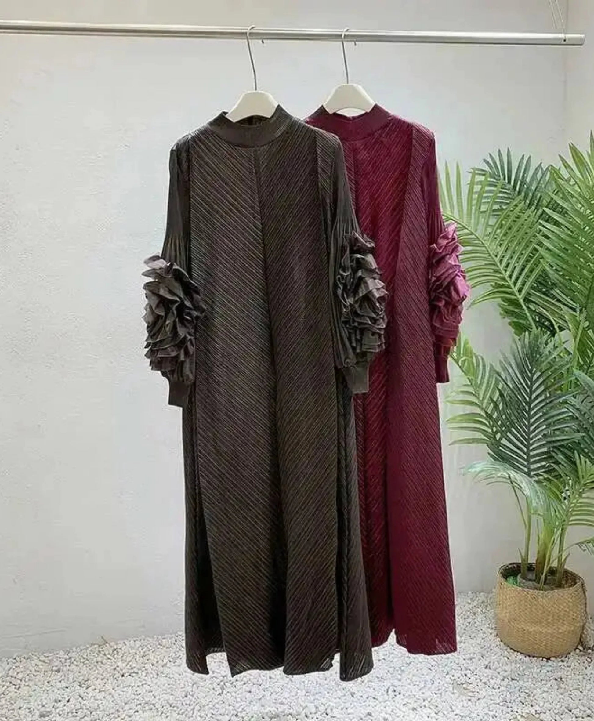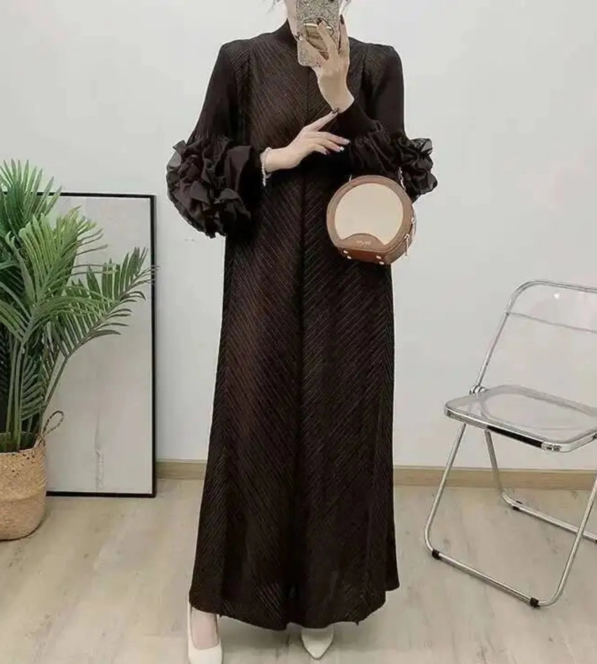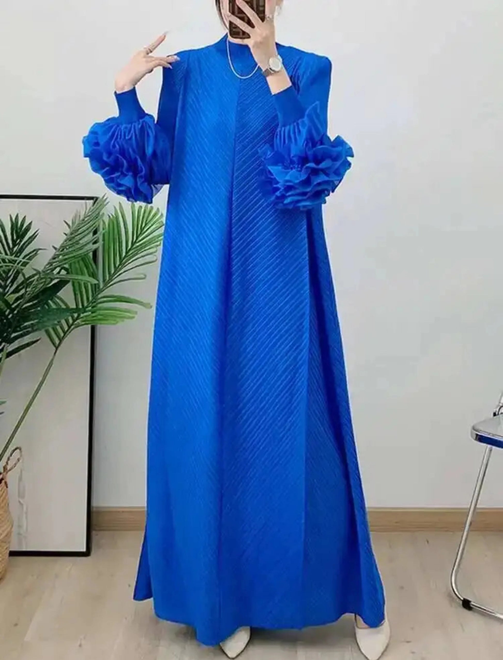 This maxi dress blends Japanese pleats with flowing ruffle sleeves for a refined, graceful look. Designed with stretchy, wrinkle-resistant fabric, it delivers both comfort and luxury.