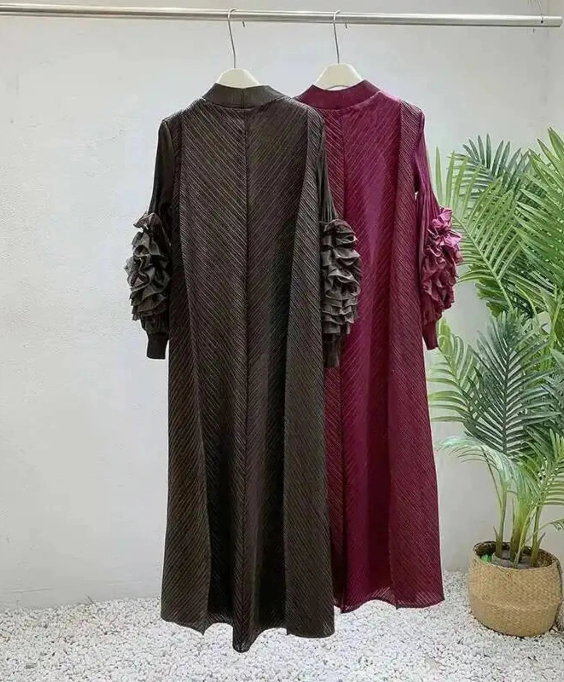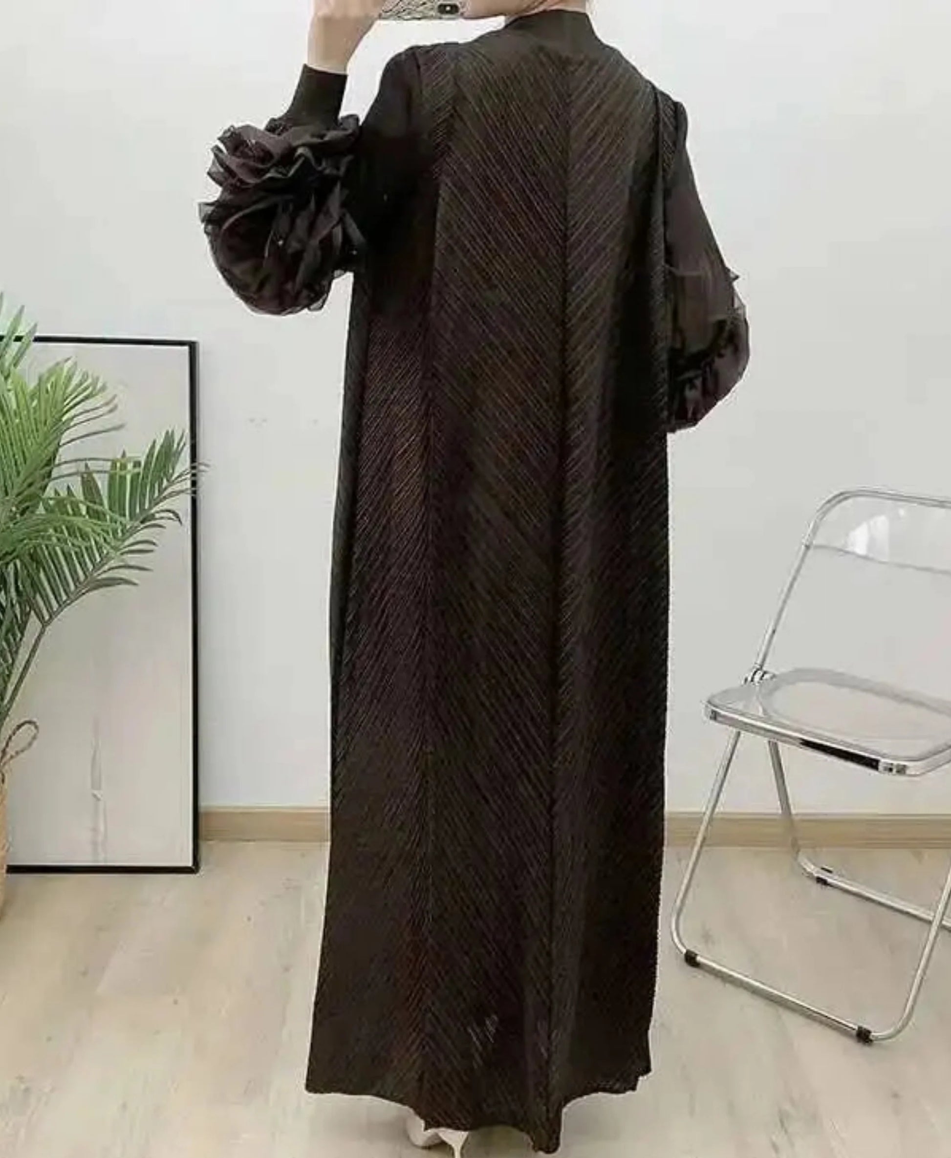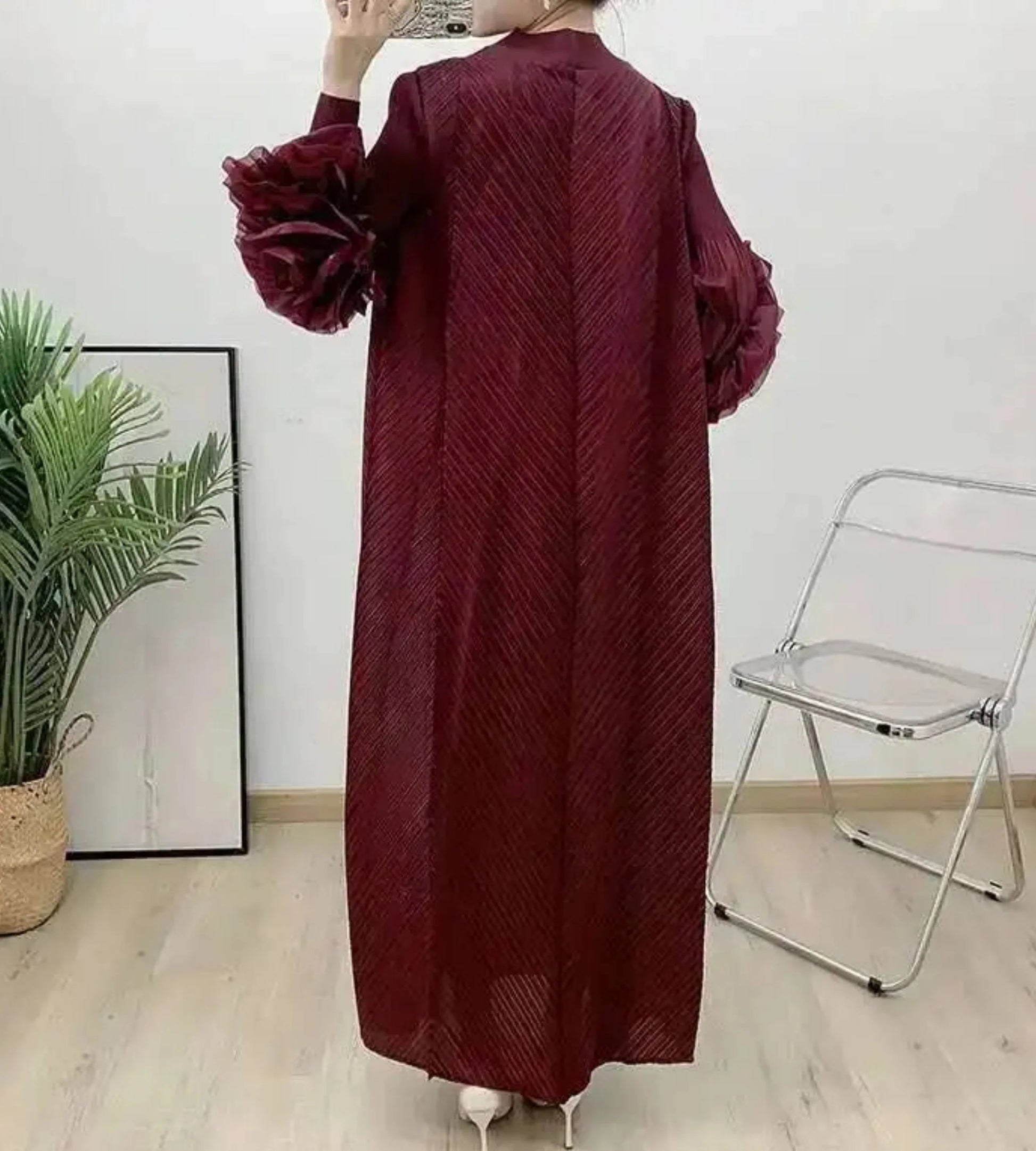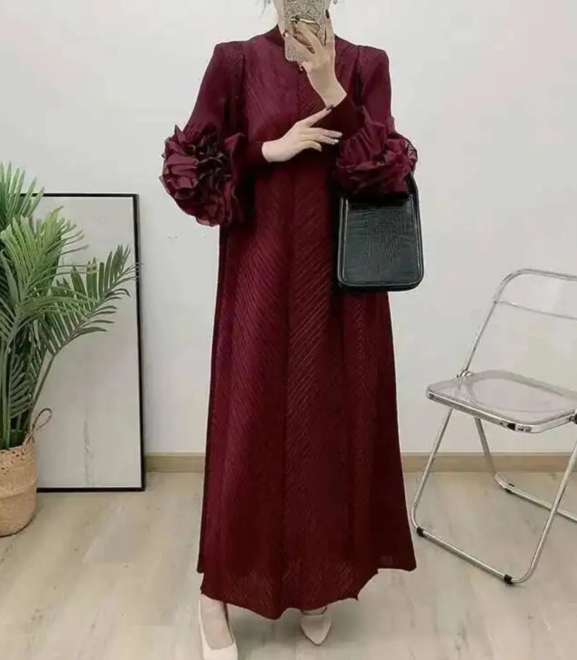 This maxi dress blends Japanese pleats with flowing ruffle sleeves for a refined, graceful look. Designed with stretchy, wrinkle-resistant fabric, it delivers both comfort and luxury.