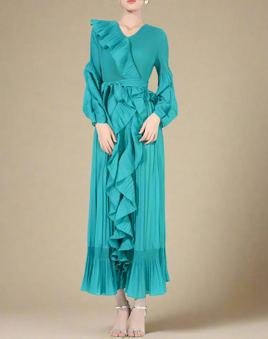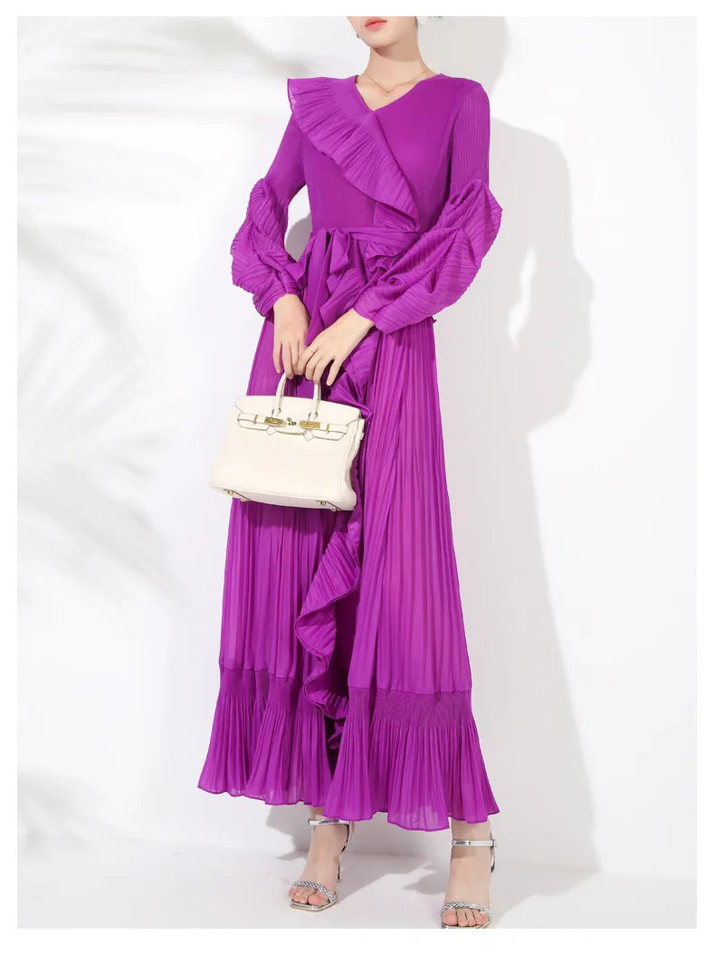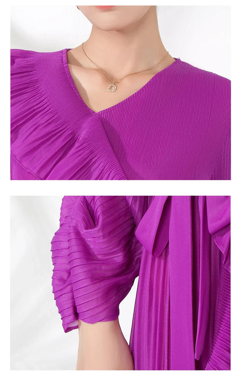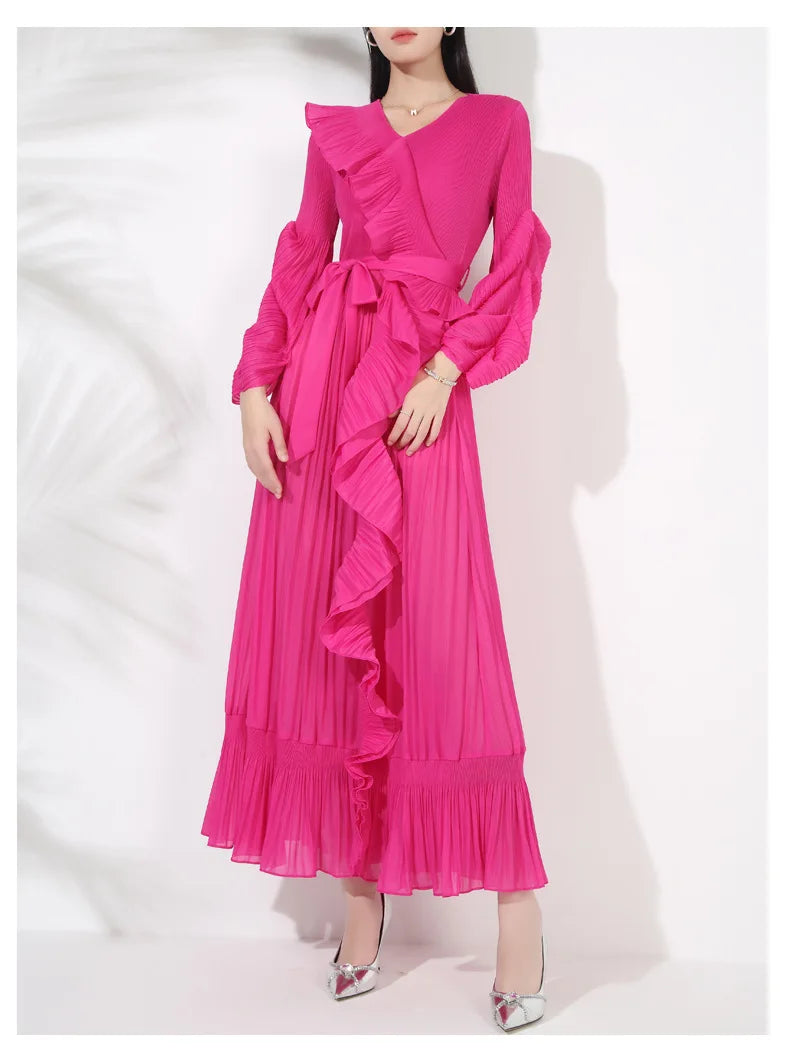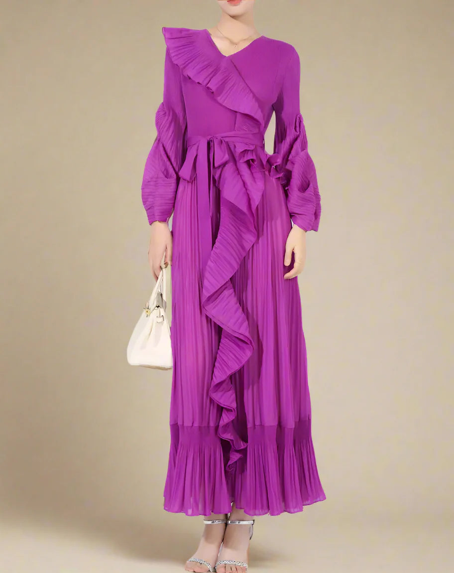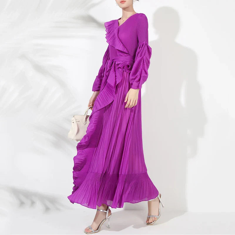 This beautiful Japanese pleated midi dress blends elegance and comfort. Featuring a V-neck and long sleeves with delicate ruffle detailing, it moves beautifully with every step.