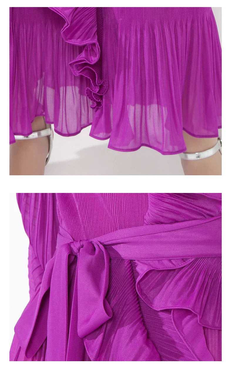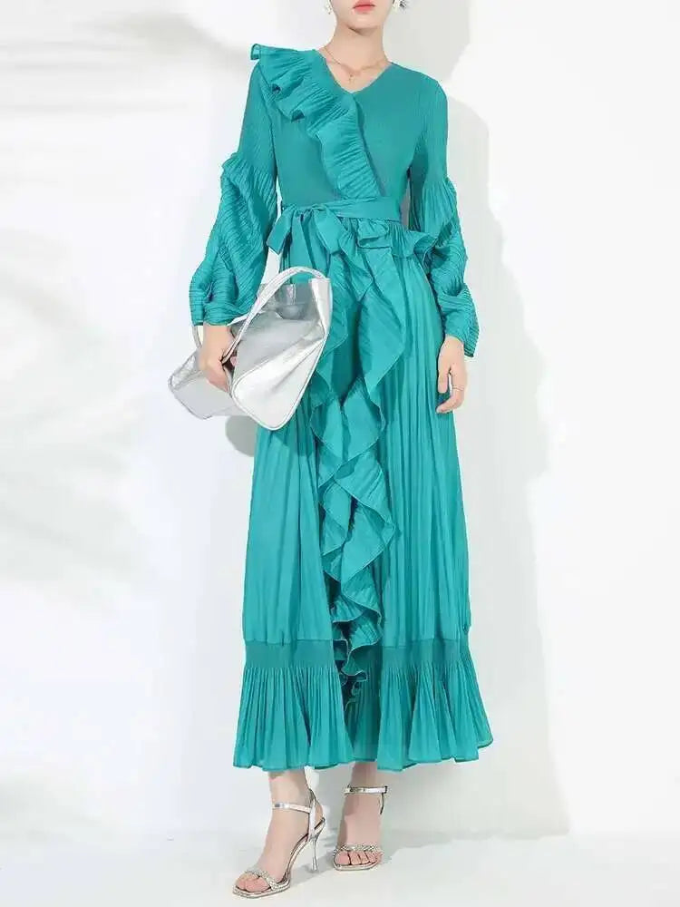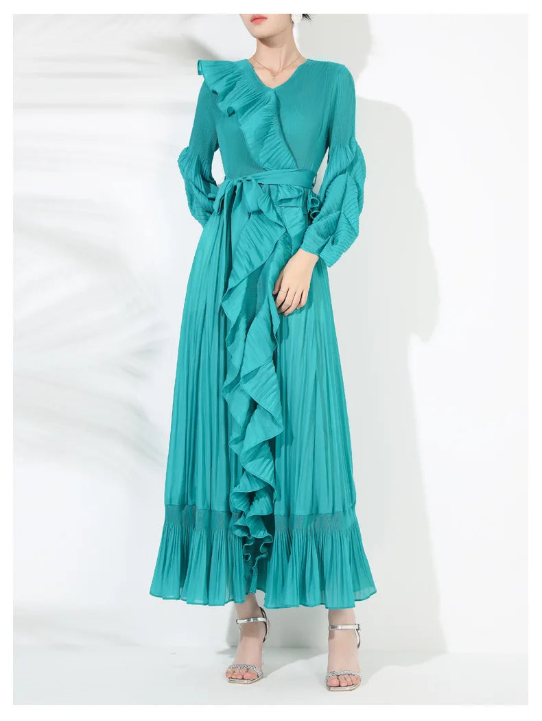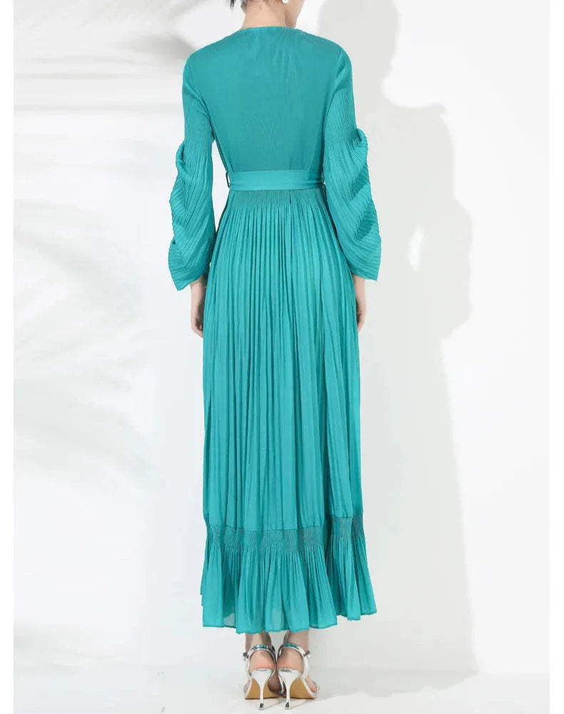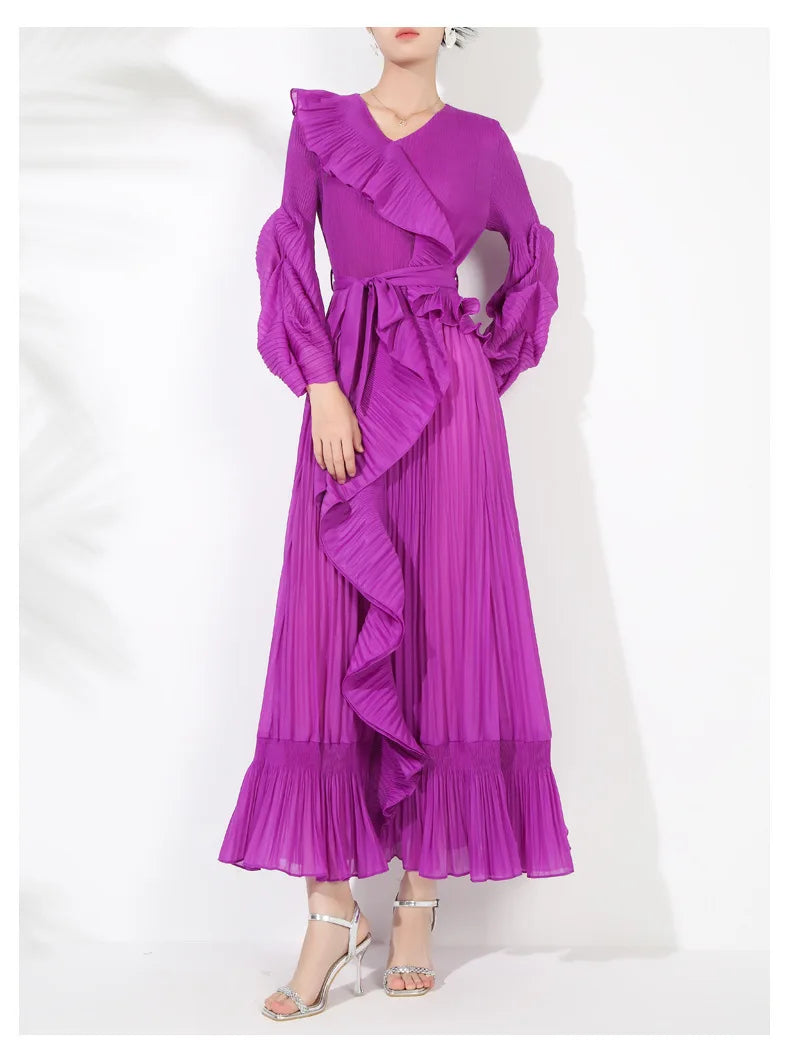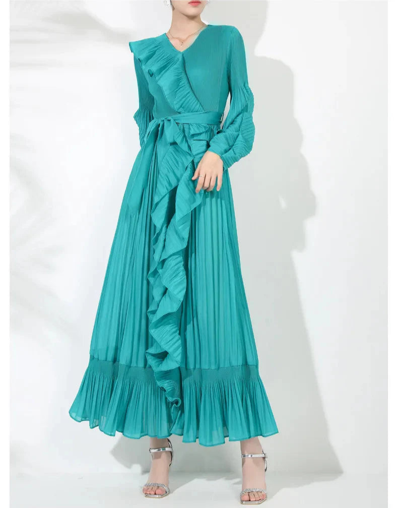 This beautiful Japanese pleated midi dress blends elegance and comfort. Featuring a V-neck and long sleeves with delicate ruffle detailing, it moves beautifully with every step.