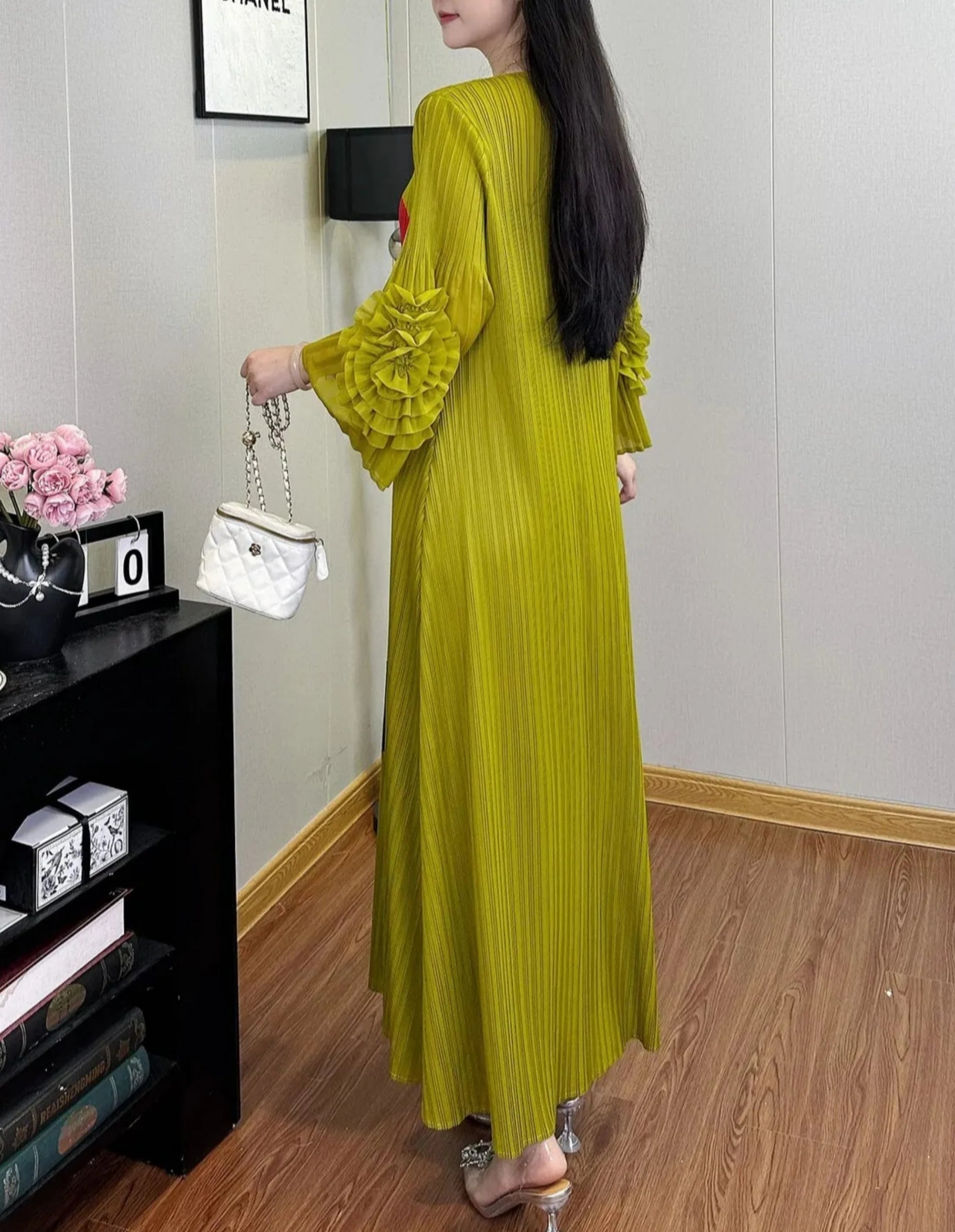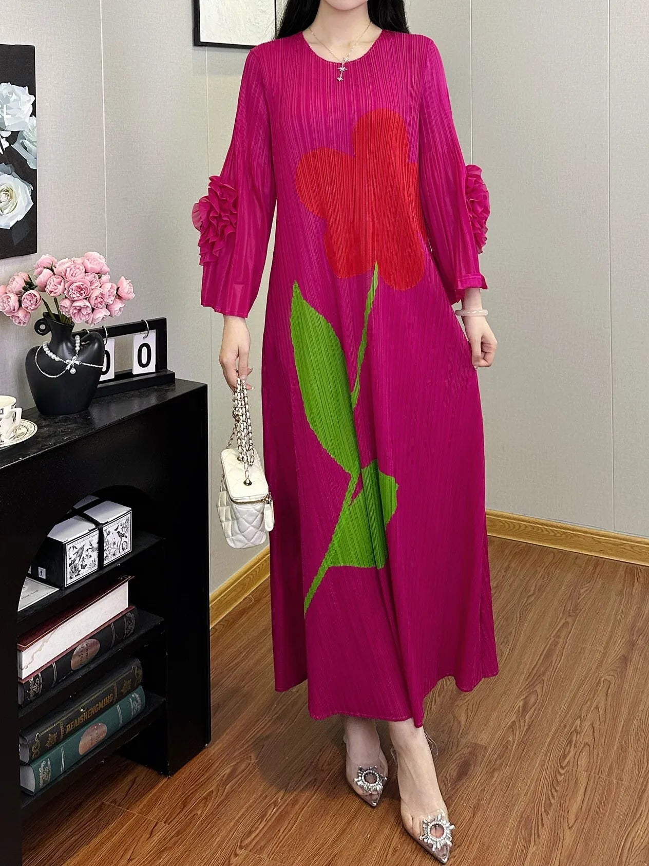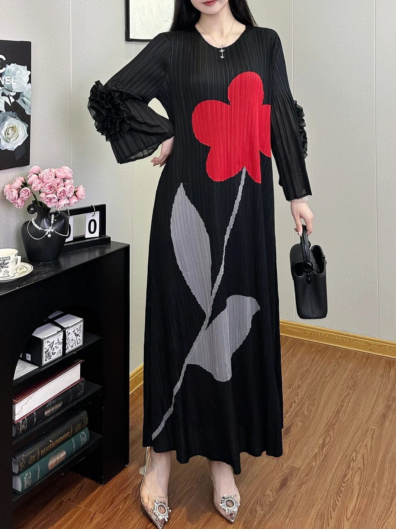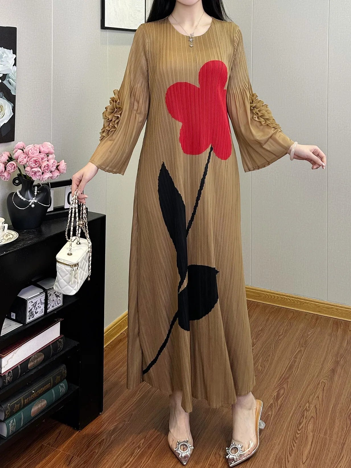 This midi dress features Japanese pleats with a floral print and ruffle floral embellishments on batwing sleeves. Made from stretchy, wrinkle-resistant fabric, it offers comfort while maintaining an elegant, luxurious silhouette.