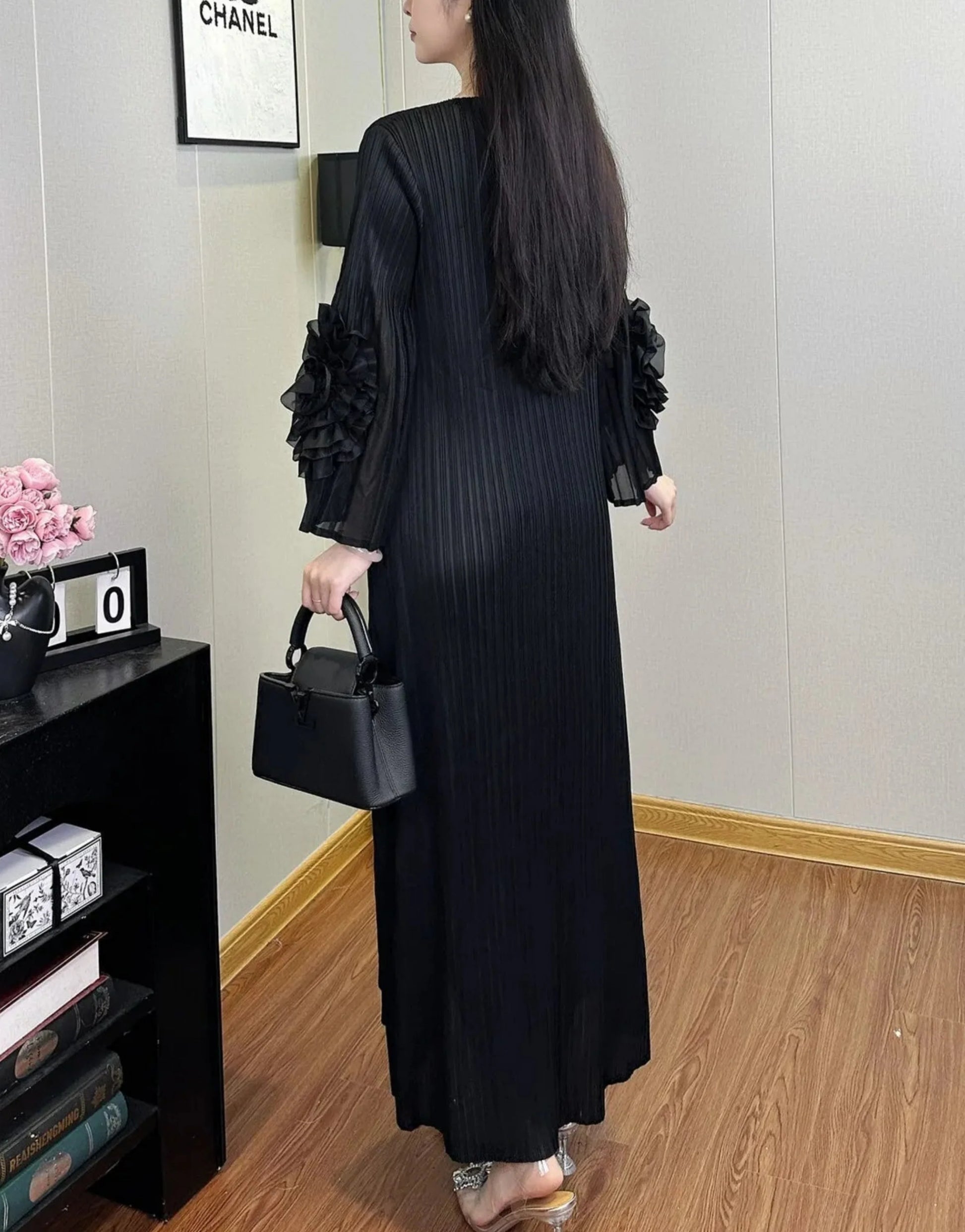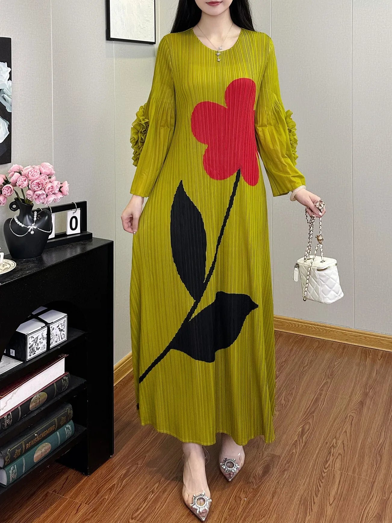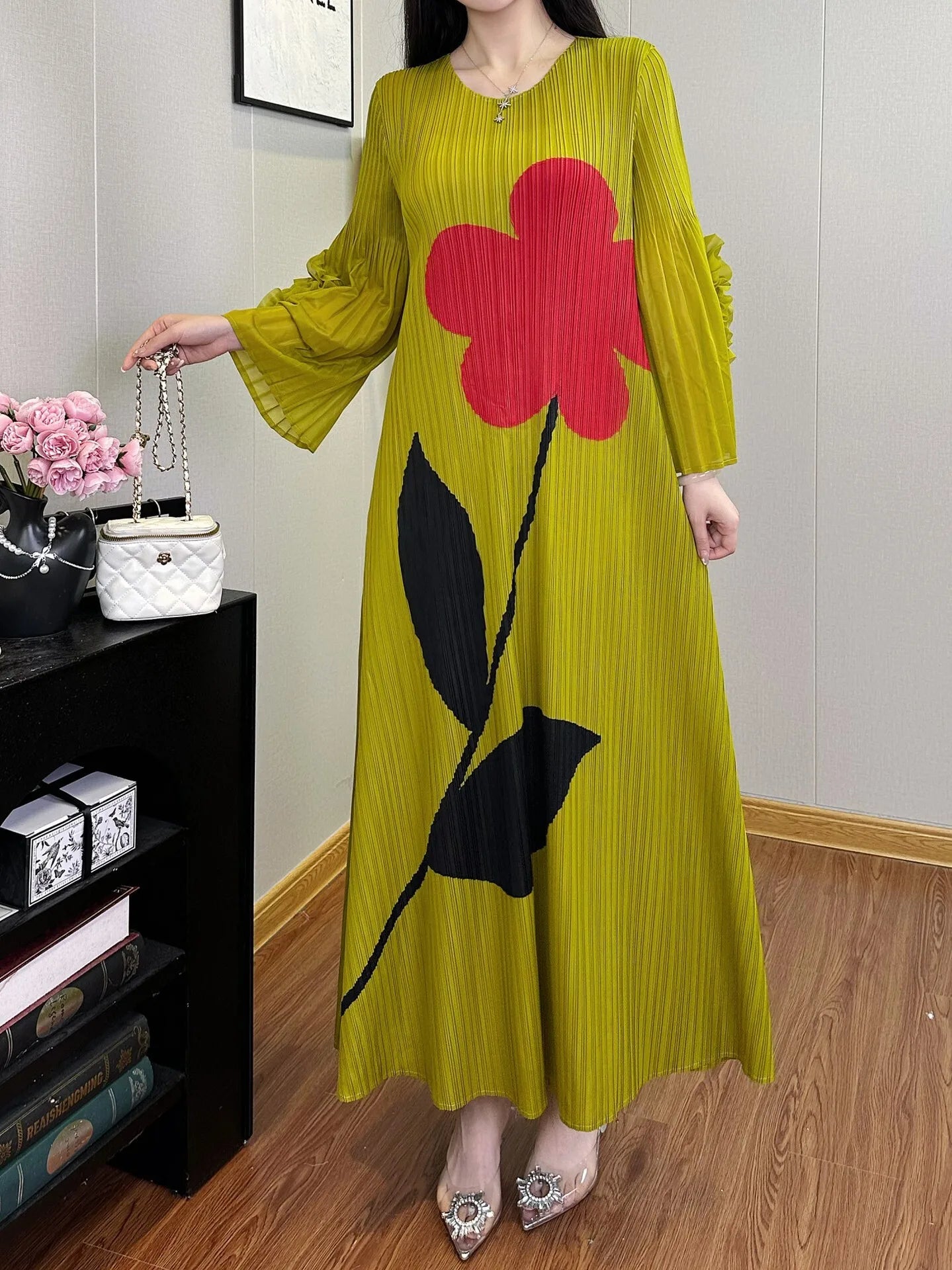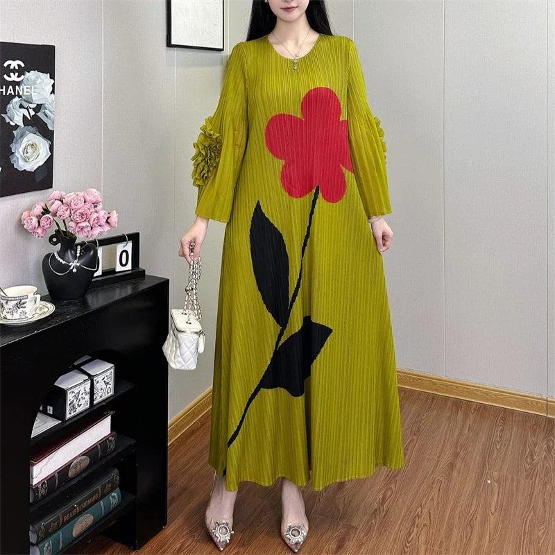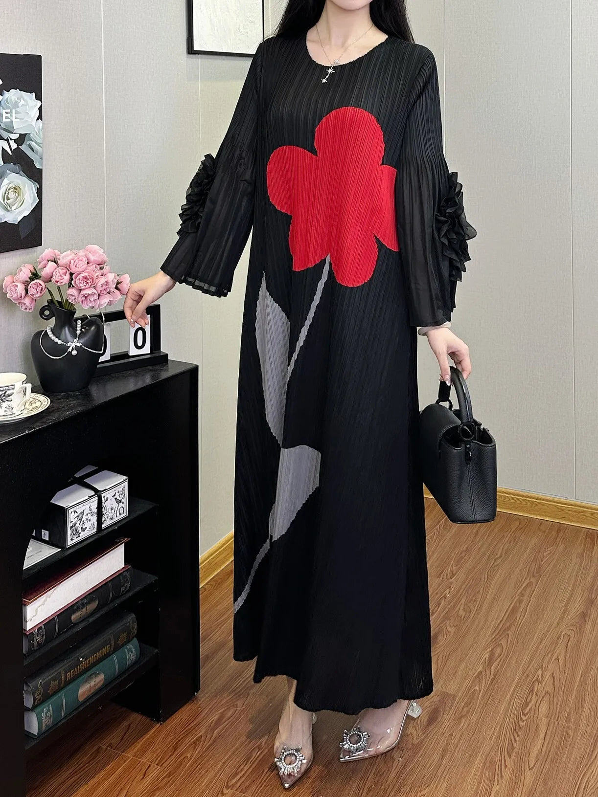 This midi dress features Japanese pleats with a floral print and ruffle floral embellishments on batwing sleeves. Made from stretchy, wrinkle-resistant fabric, it offers comfort while maintaining an elegant, luxurious silhouette.