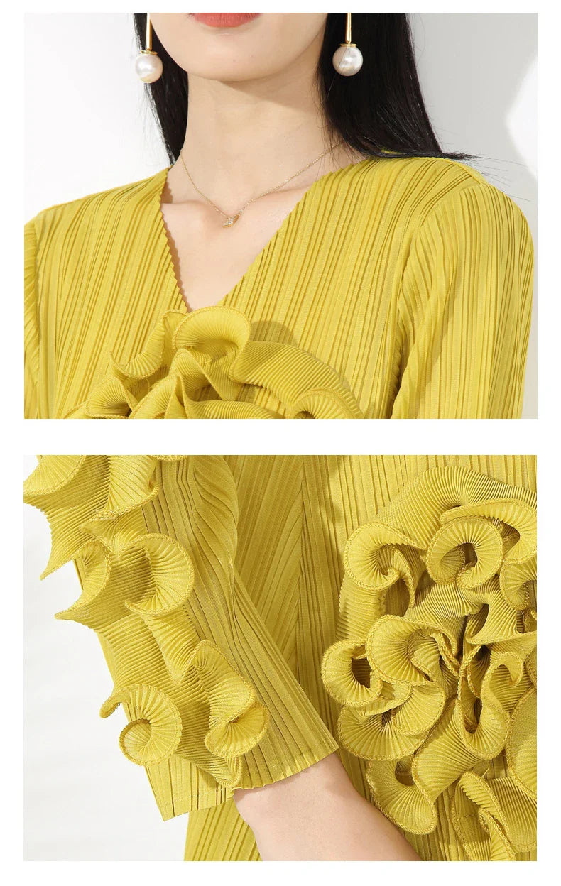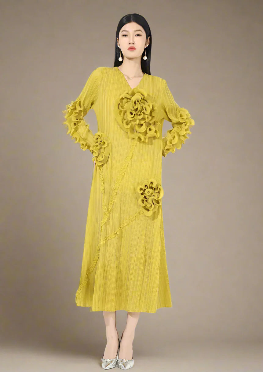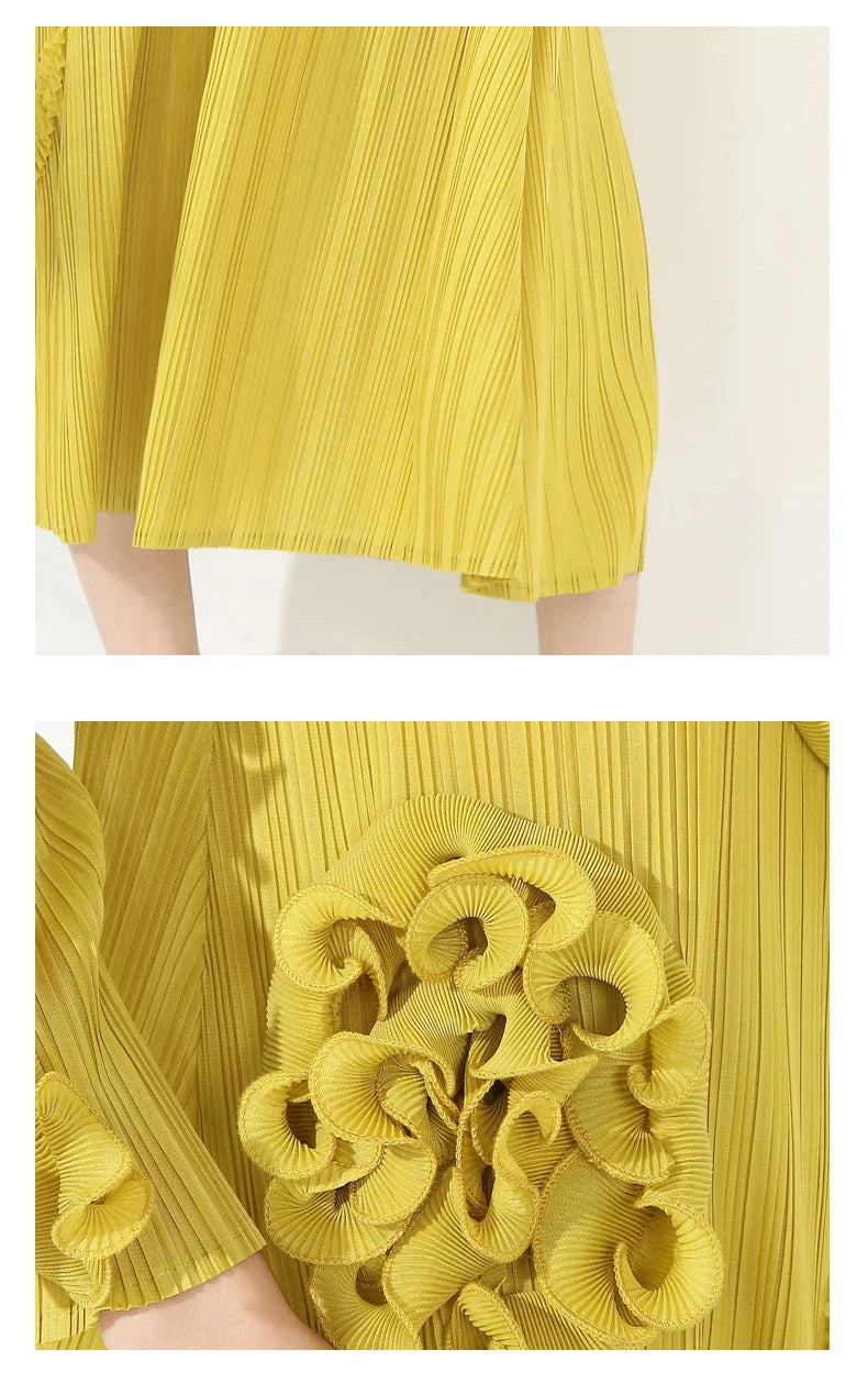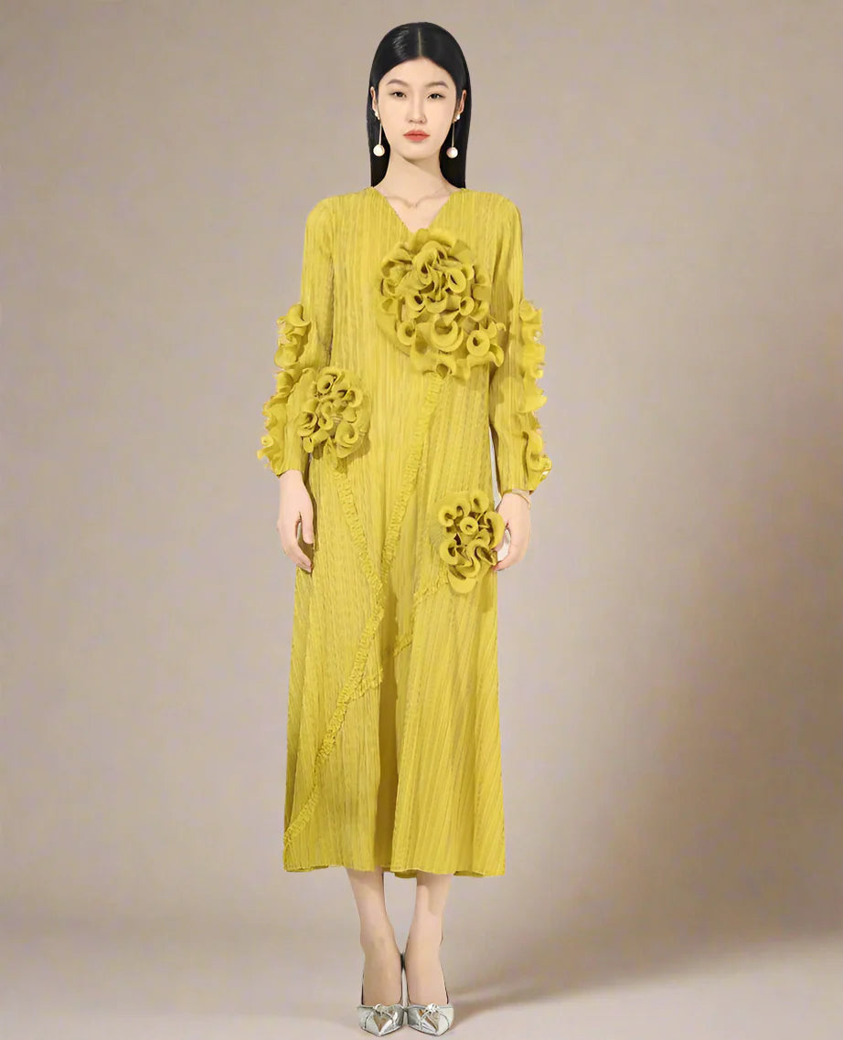 This Japanese pleated midi dress combines elegance and comfort with a flowing silhouette. Featuring long sleeves and 3D ruffle floral details, it moves beautifully with every step.