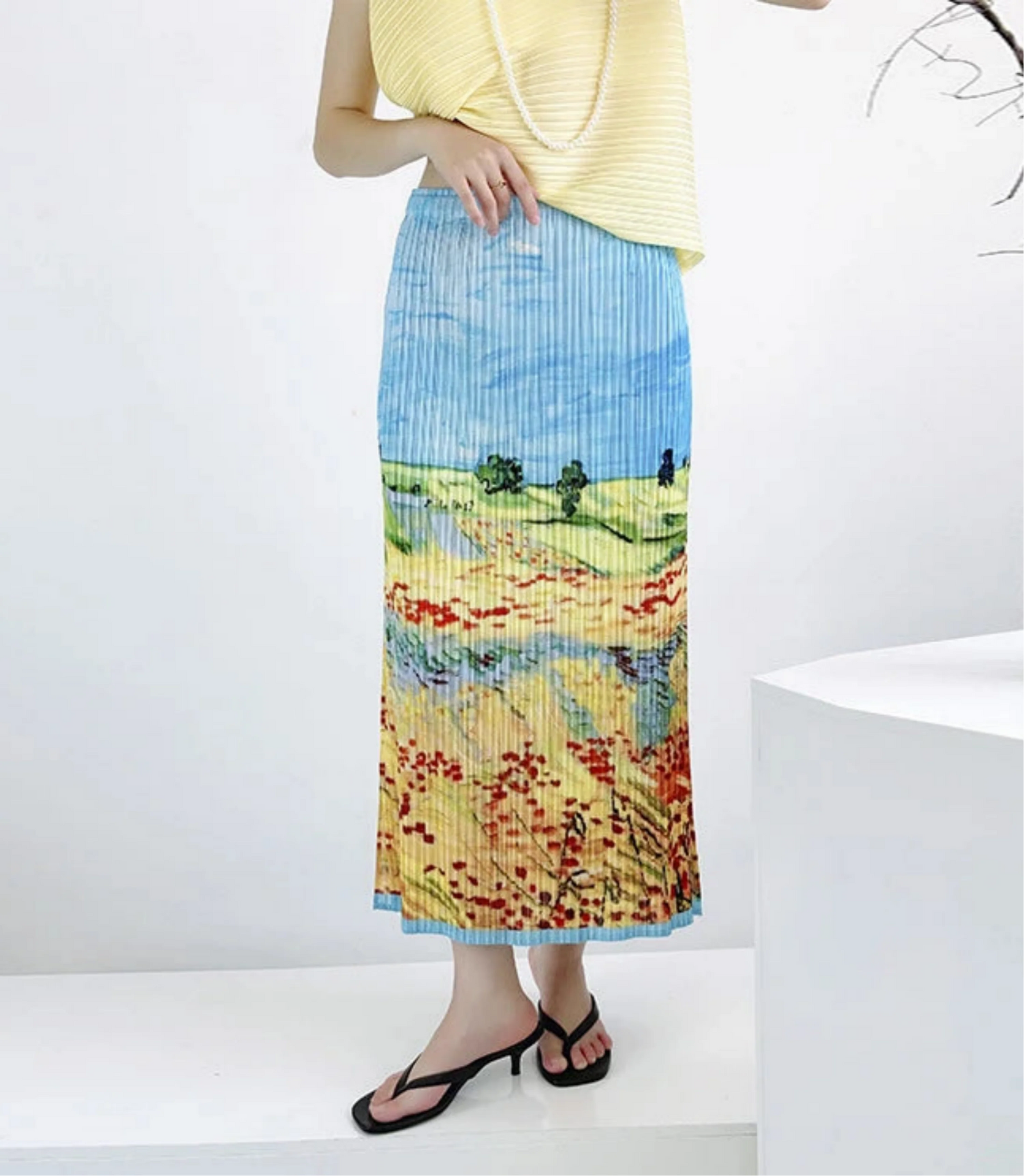 Featuring a unique landscape-inspired design, this pleated skirt is made from authentic Japanese plissé with a pull-on elastic waistband. Lightweight, stretchy, and wrinkle-free for all-day comfort and style.